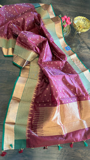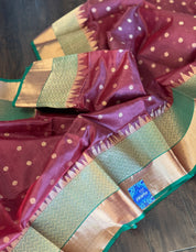 Pure Chanderi Silk - Brown Plum Green Golden Silver Zari Woven
