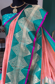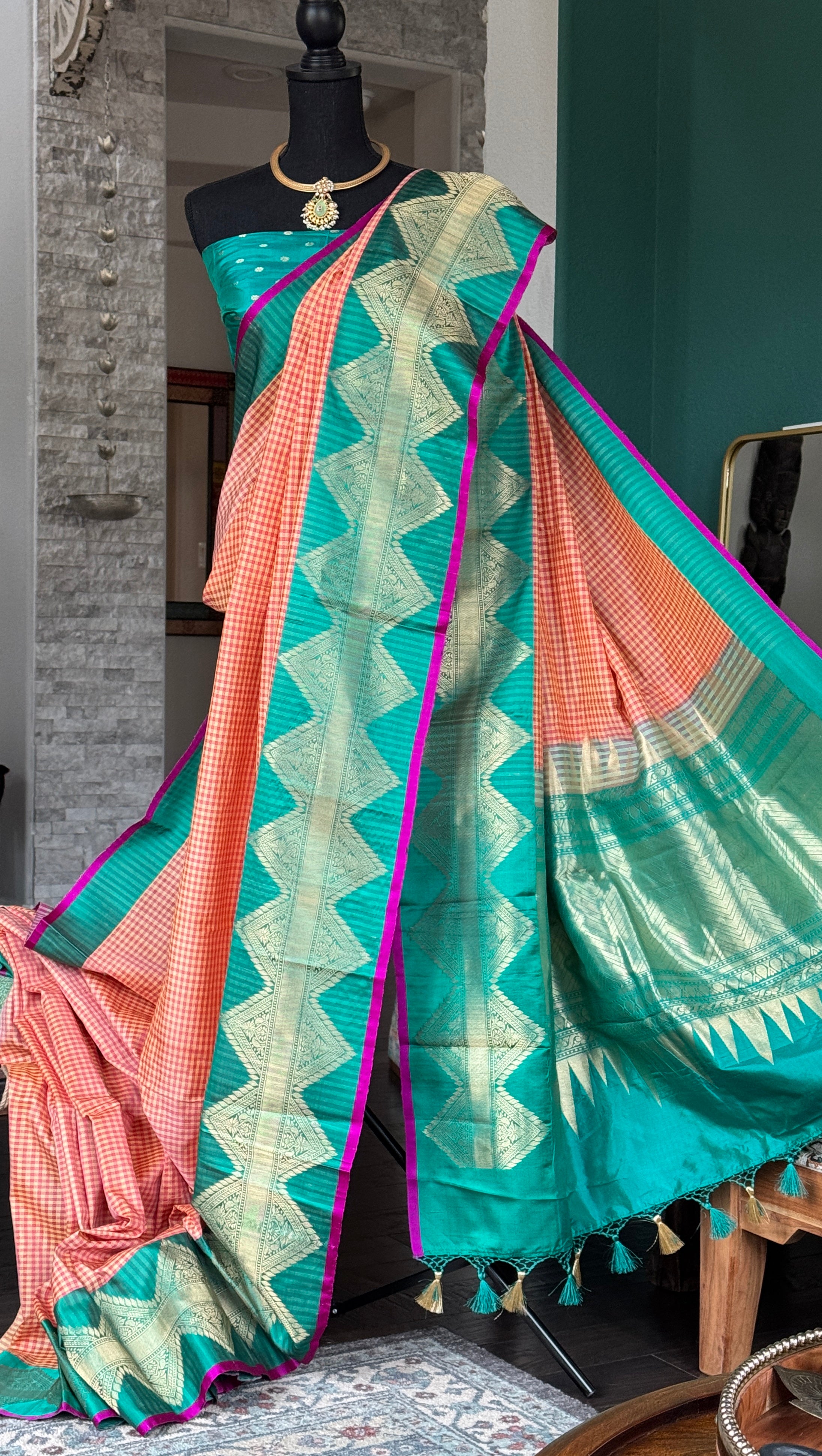 Design : Gold Zari woven Kadwa Kadiyal skirt border. Body is checkered pattern. Zari woven palla.