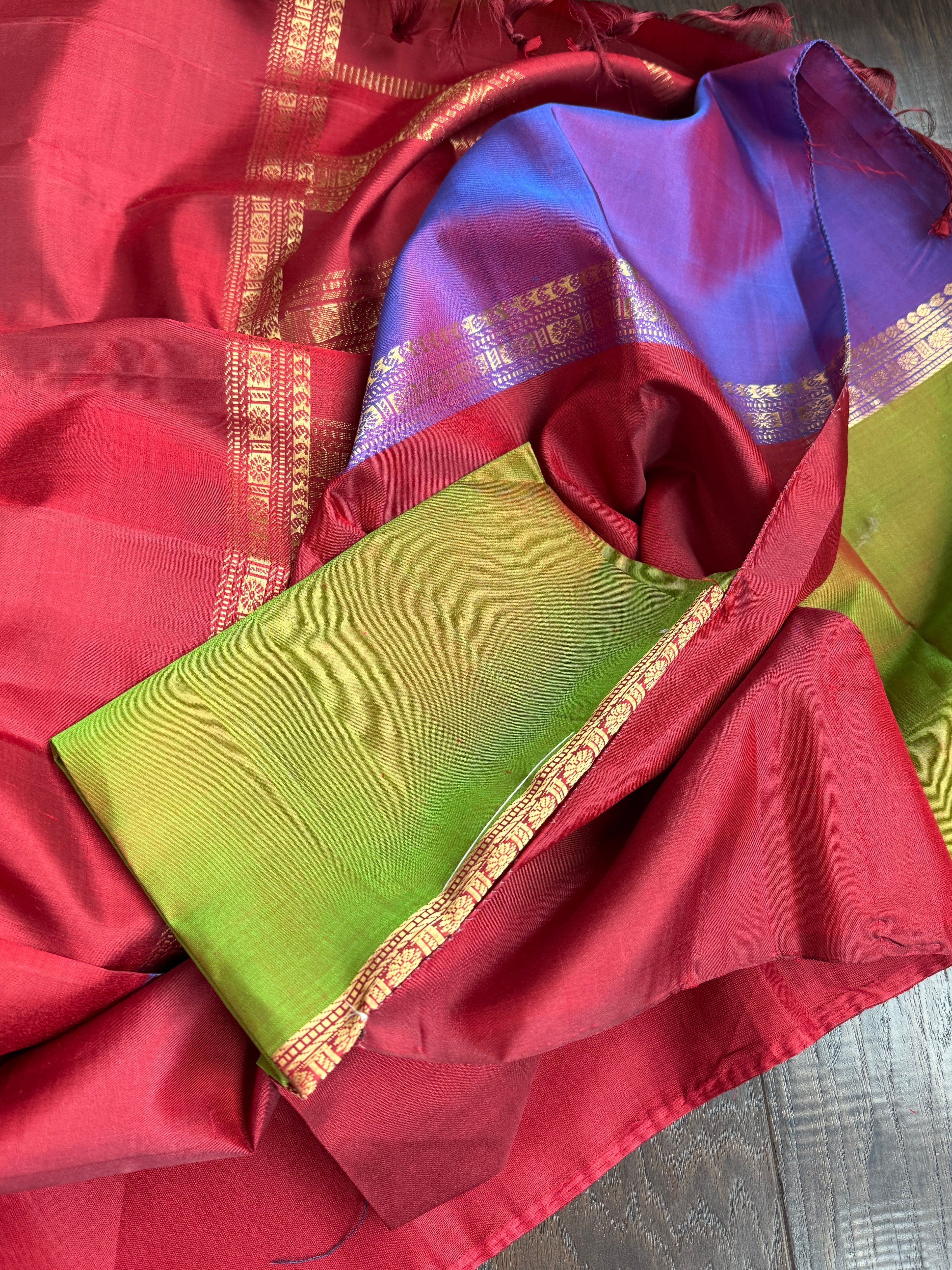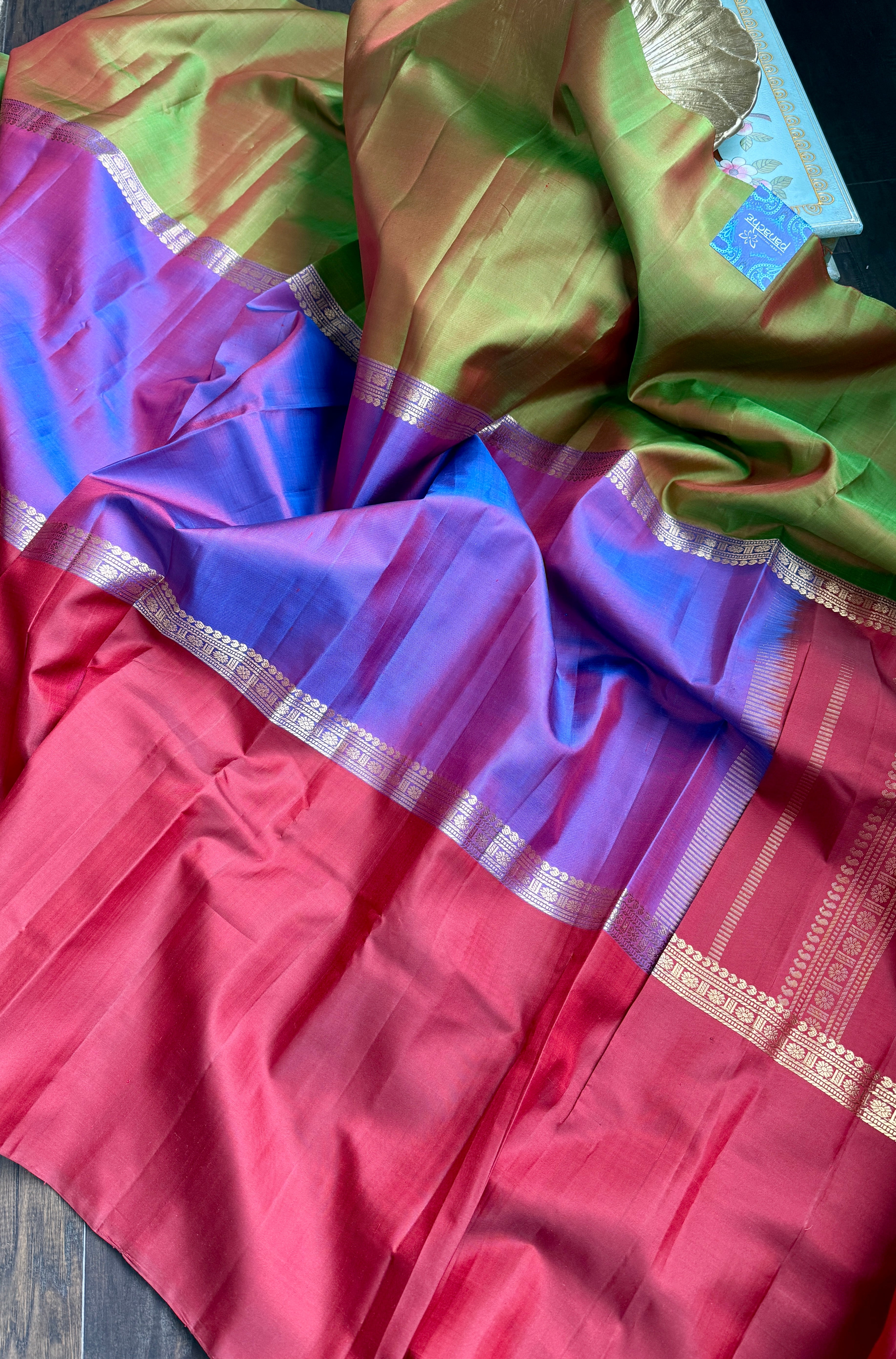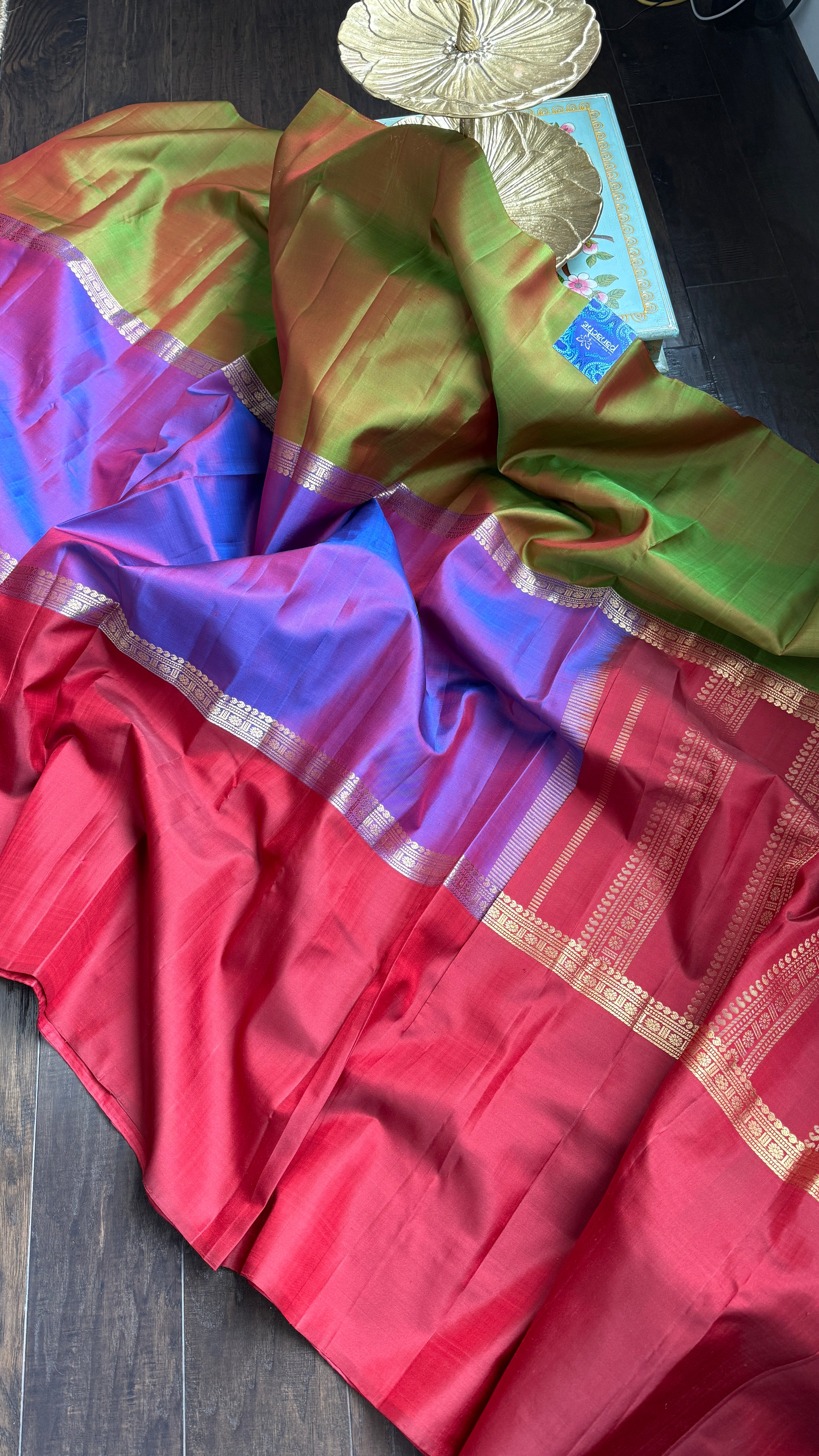 Pure Silk Mubbagam Kanjivaram - Red Green Purple Woven