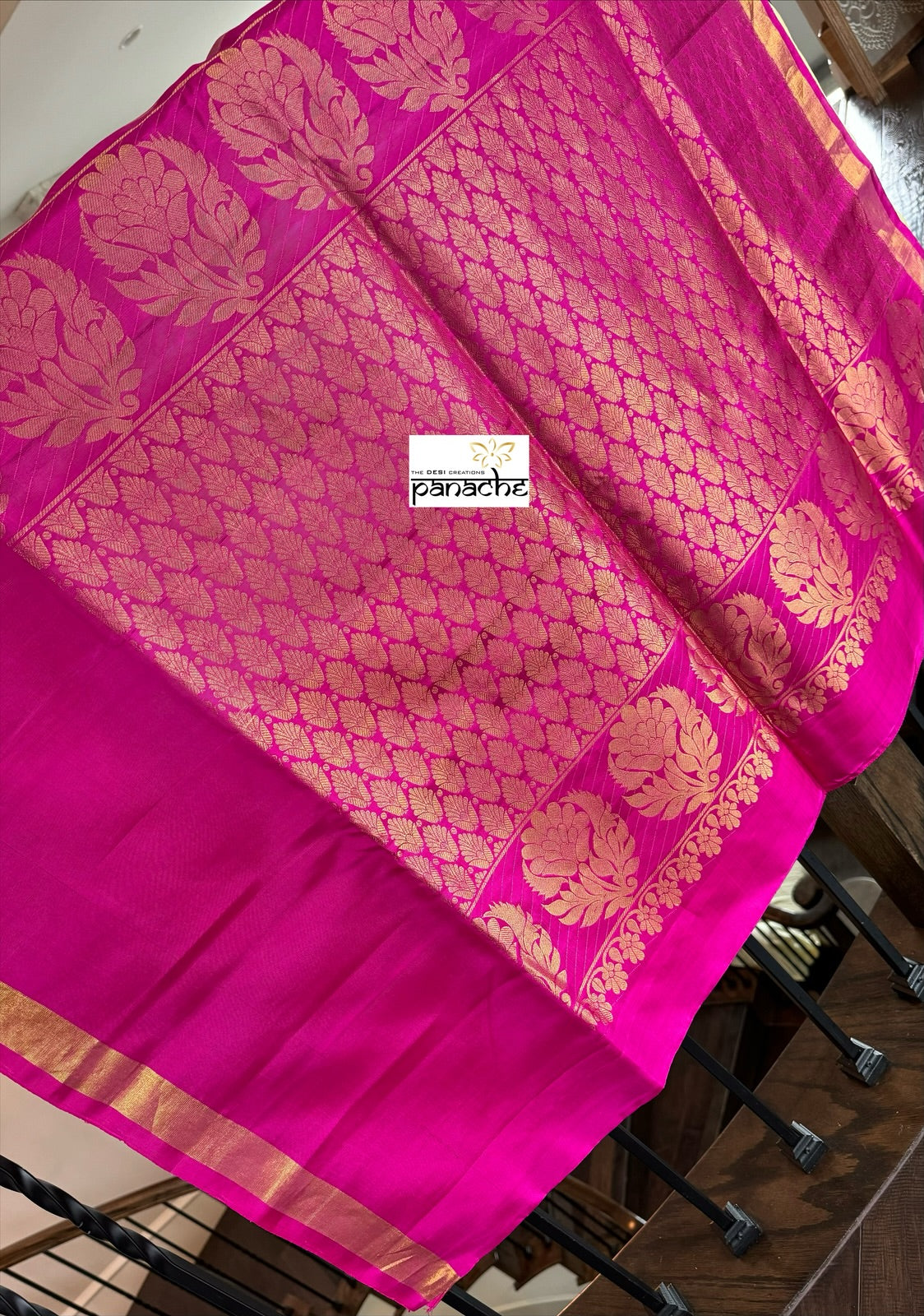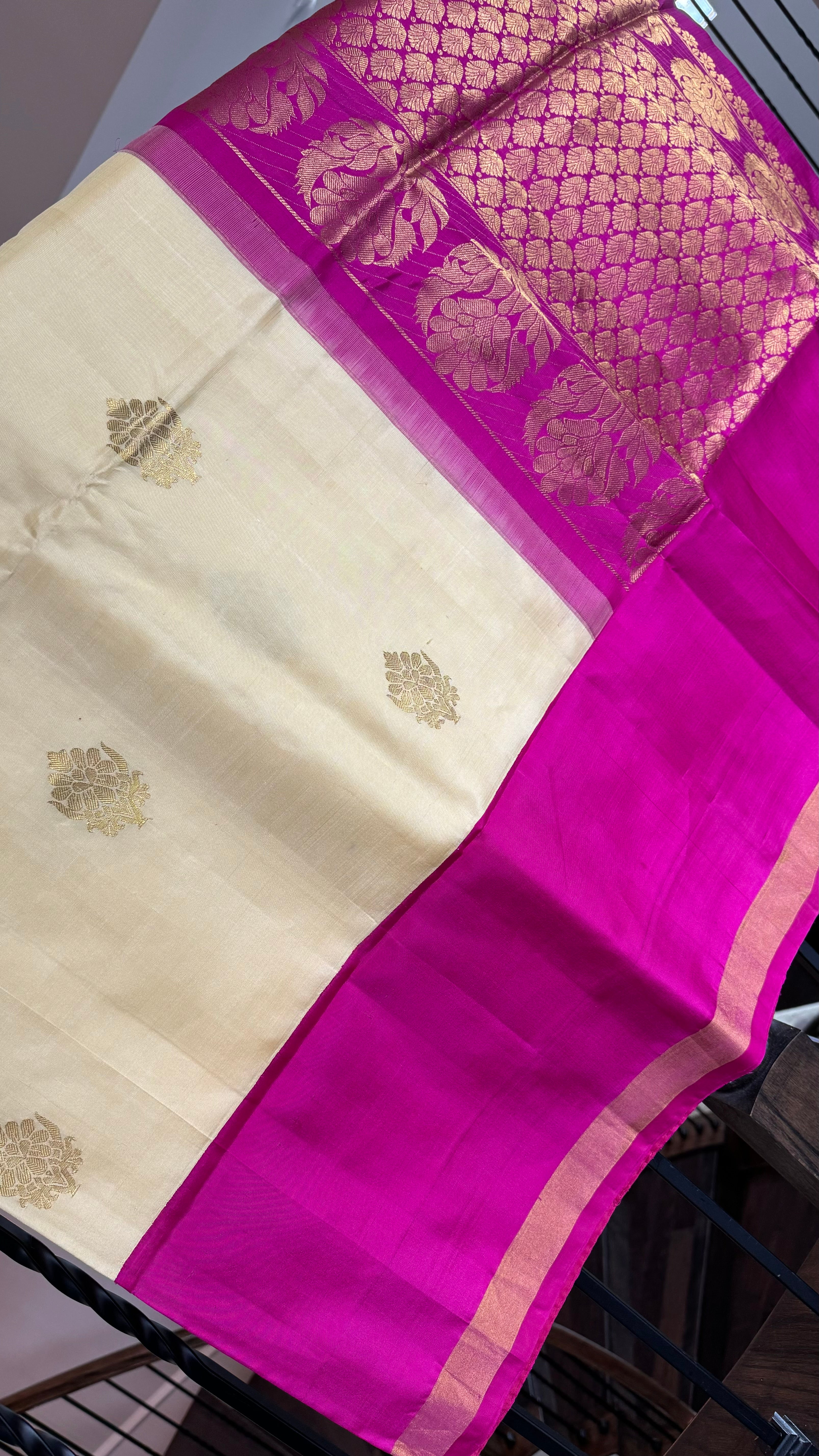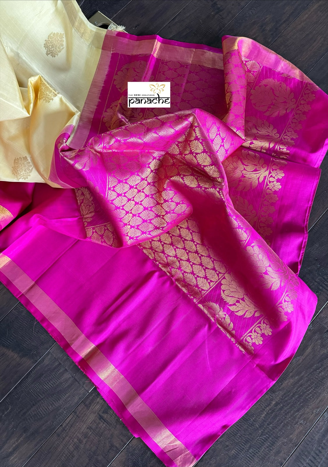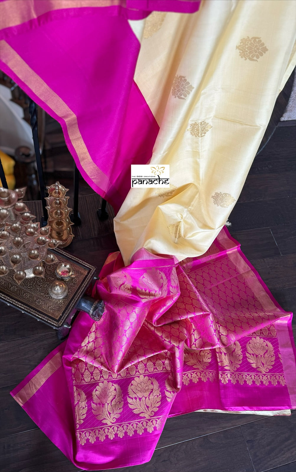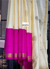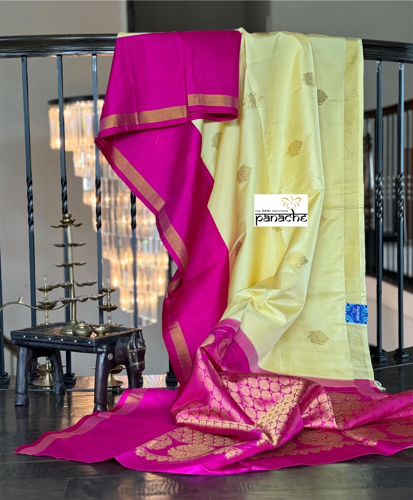 Design : Body color is butter yellow, Border is Magenta with Golden Zari. Zari Woven motifs on body and pallu is heavy Zari Woven.