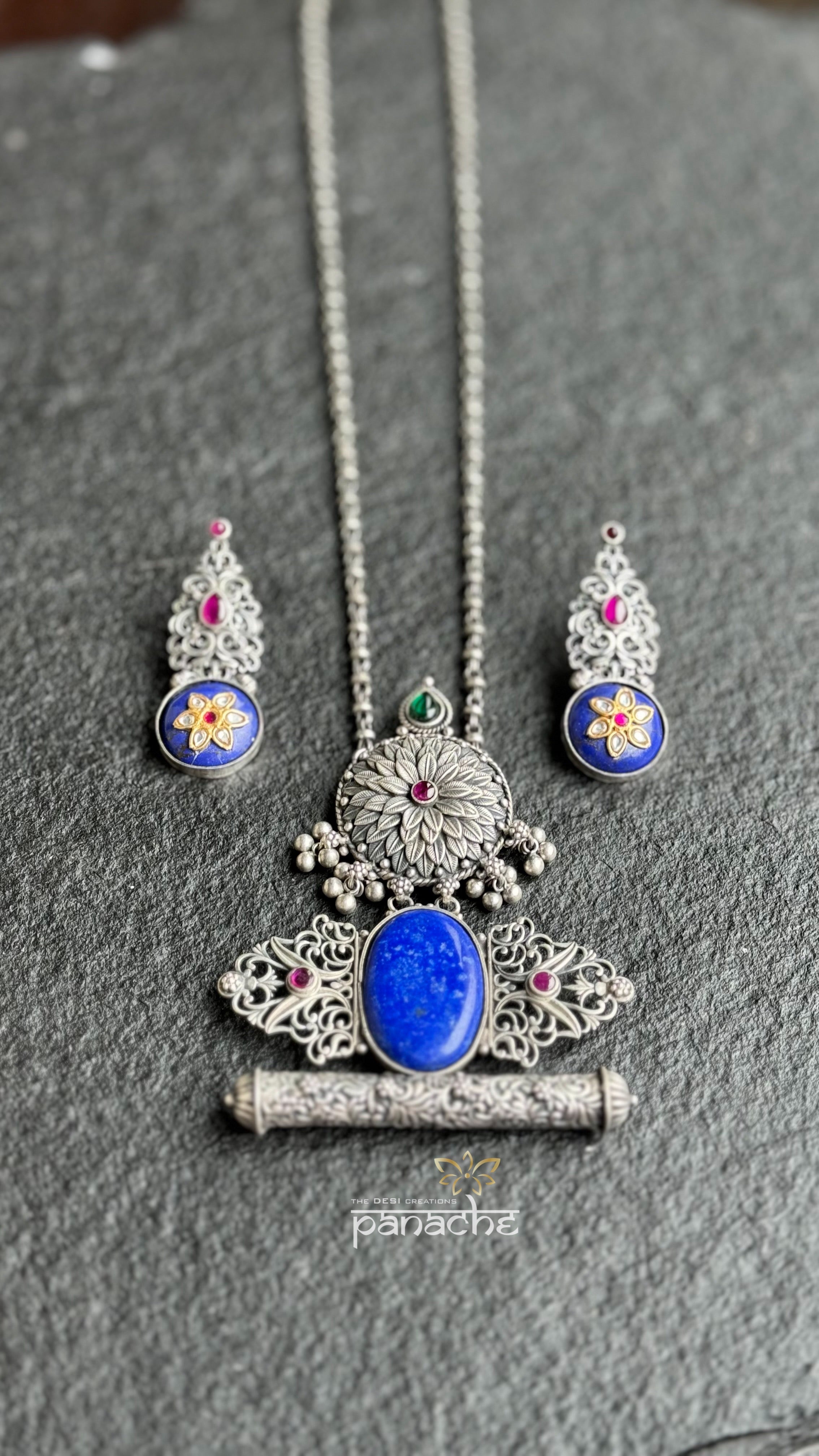 Design: Hand-beaten Silver with lapis and temple stone