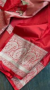 Design : Intricate Zari motifs on body, borders and Pallu with Zari weave on Katan silk.