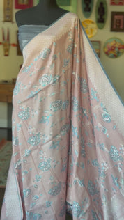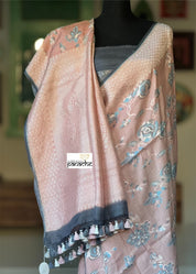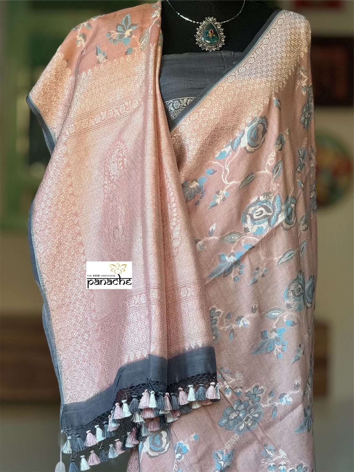 Khaddi Tussar Banarasi - Peach Pink Grey Tilfi Antique Zari