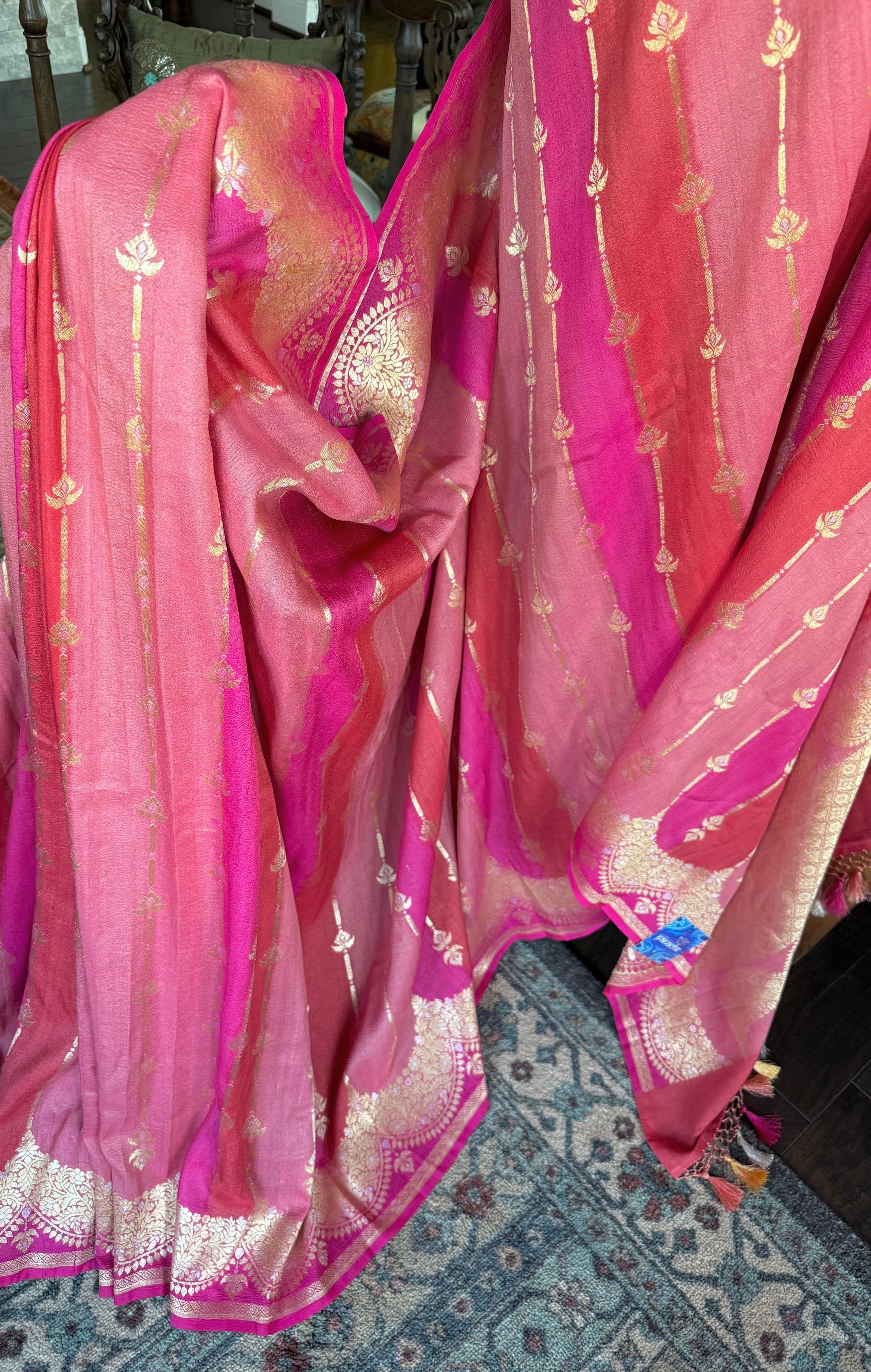 Vibrant color tussar Georgette Banarasi . This saree features a very festive look and an amazing fall!