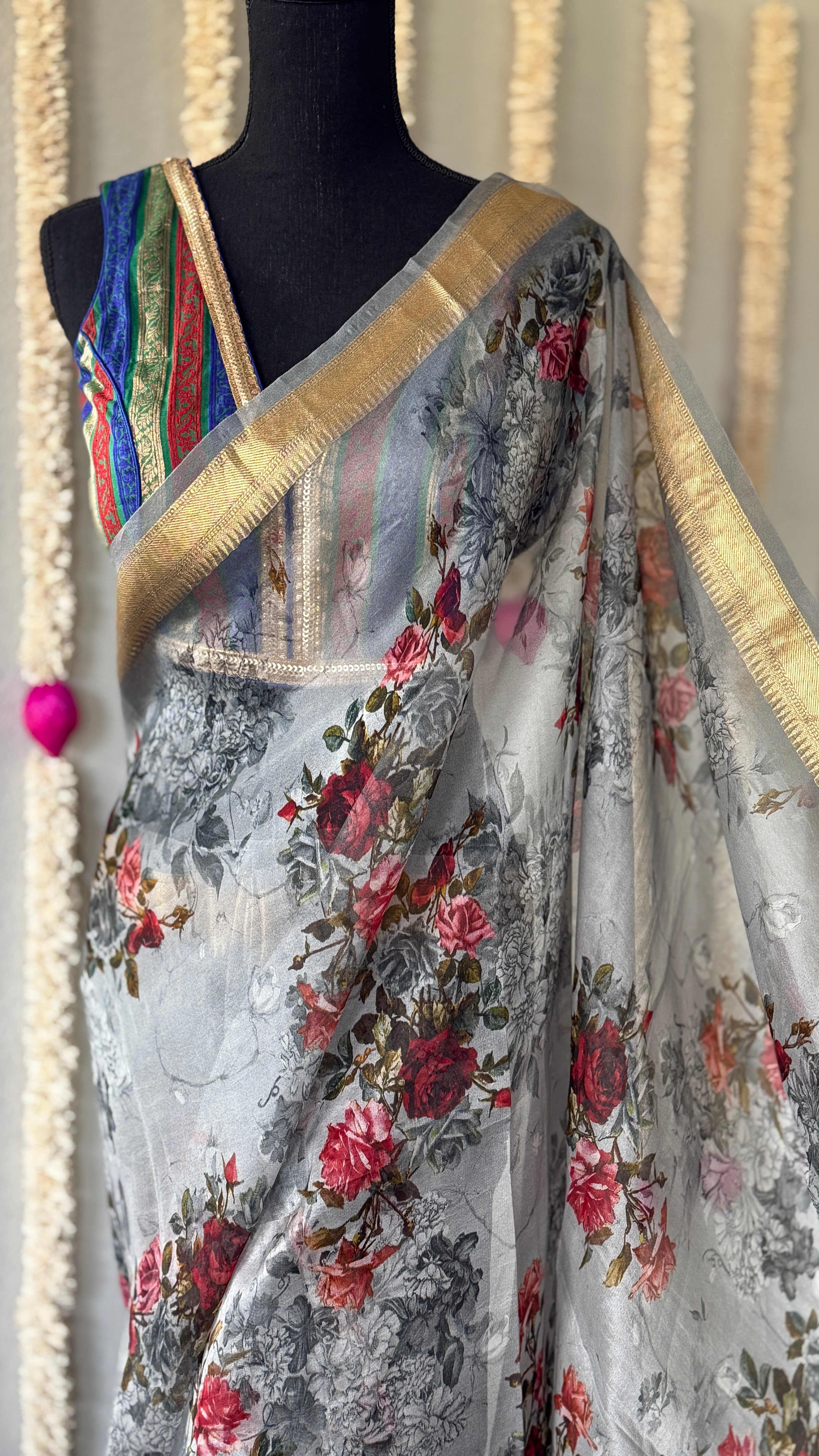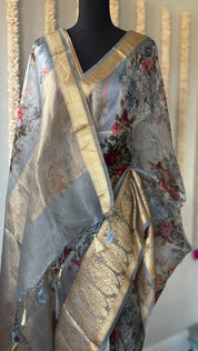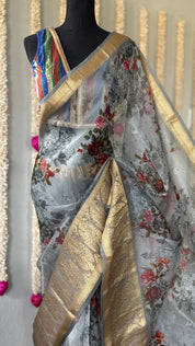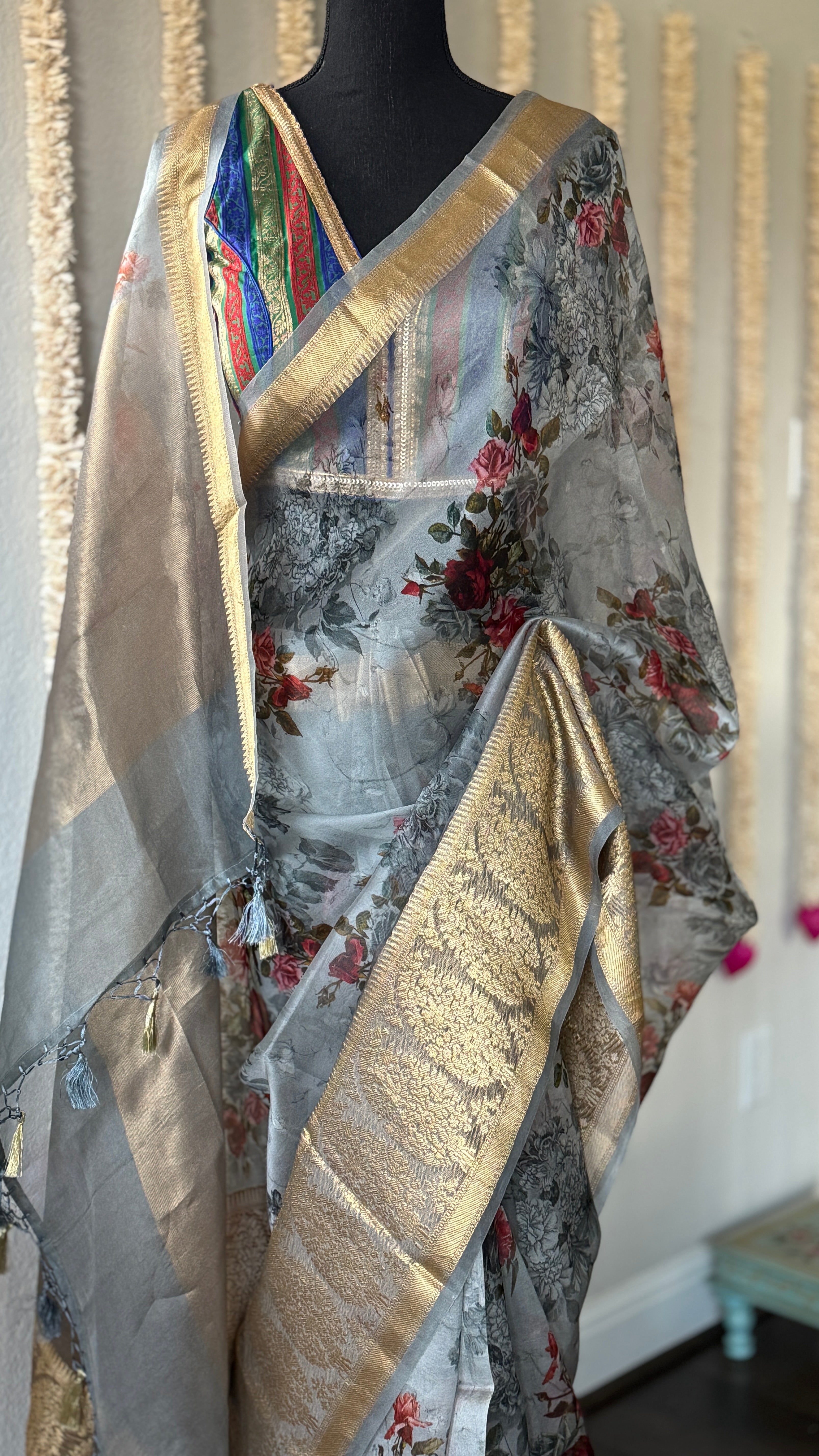 Design : Body is light grey, digutal floral prints. Borders are Kadwa woven