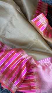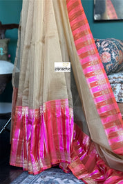 Description: Antique Zari rangkat kadwa borders and palla. Body is in tan color with Zari woven checkered pattern.