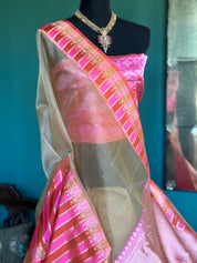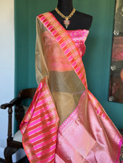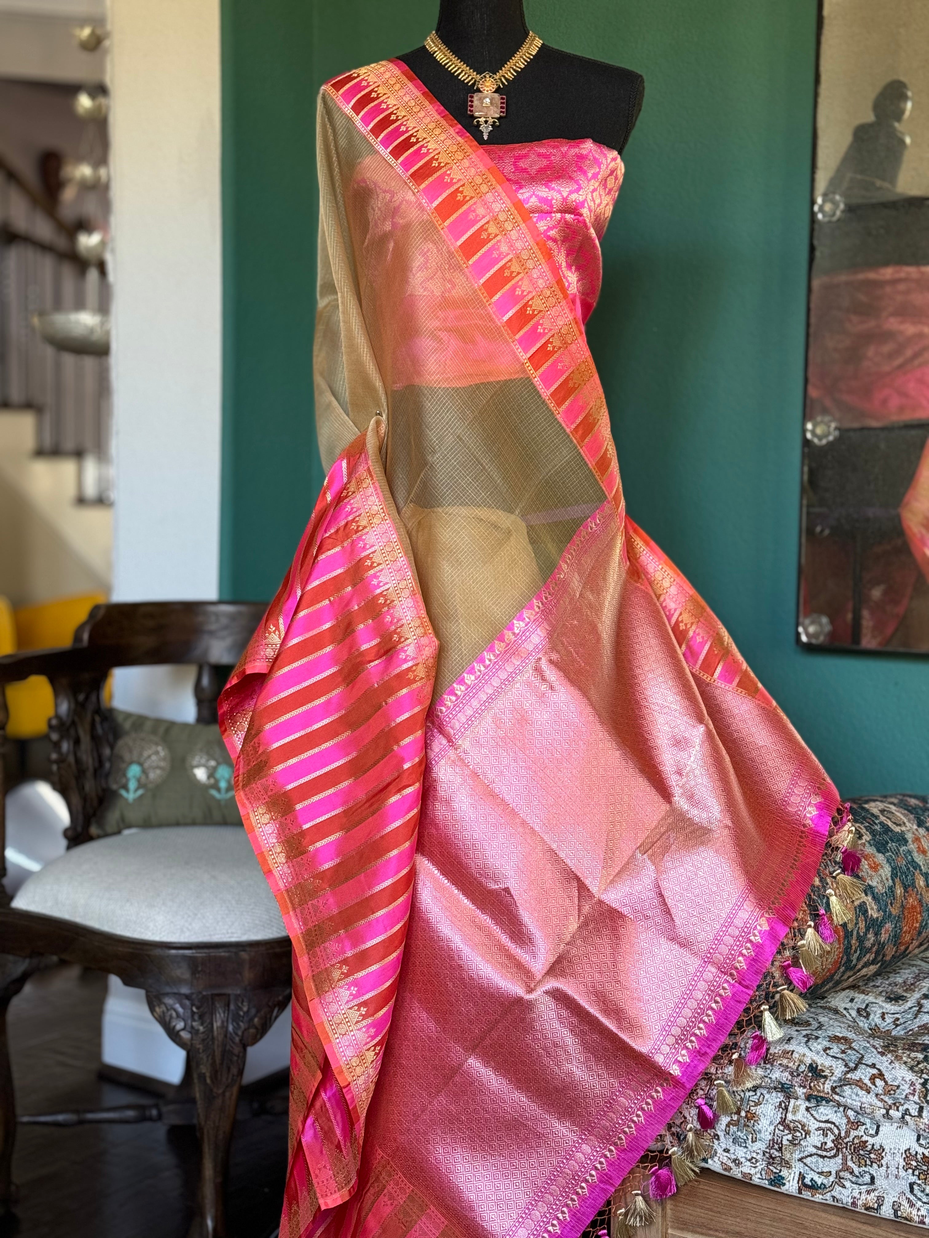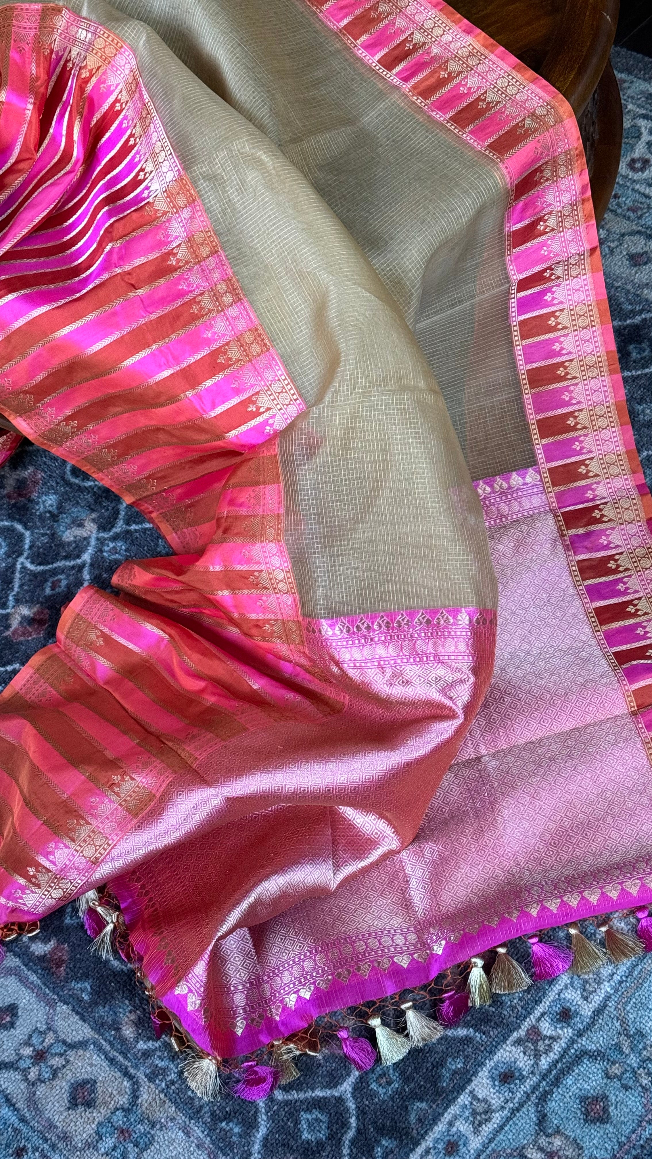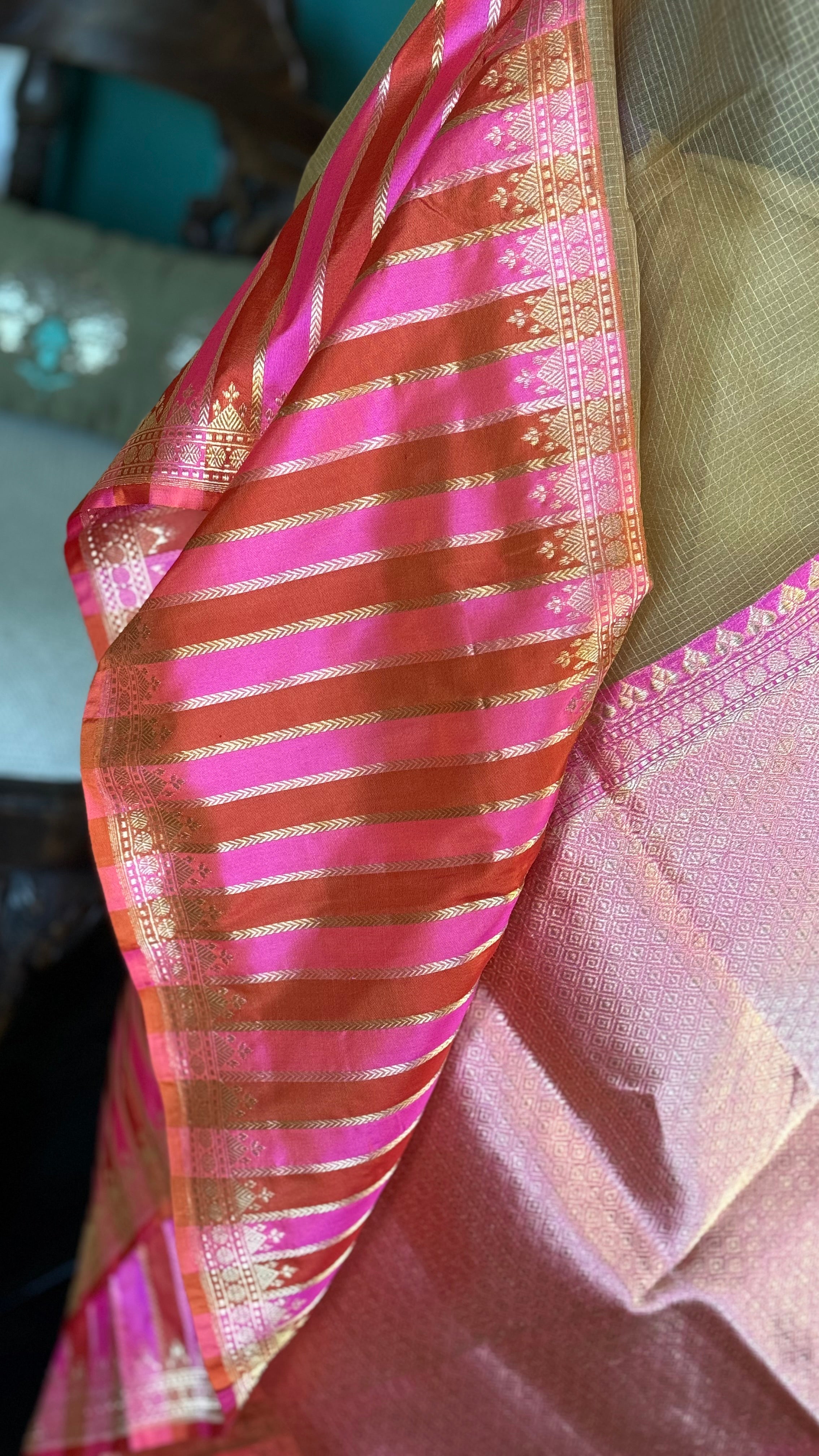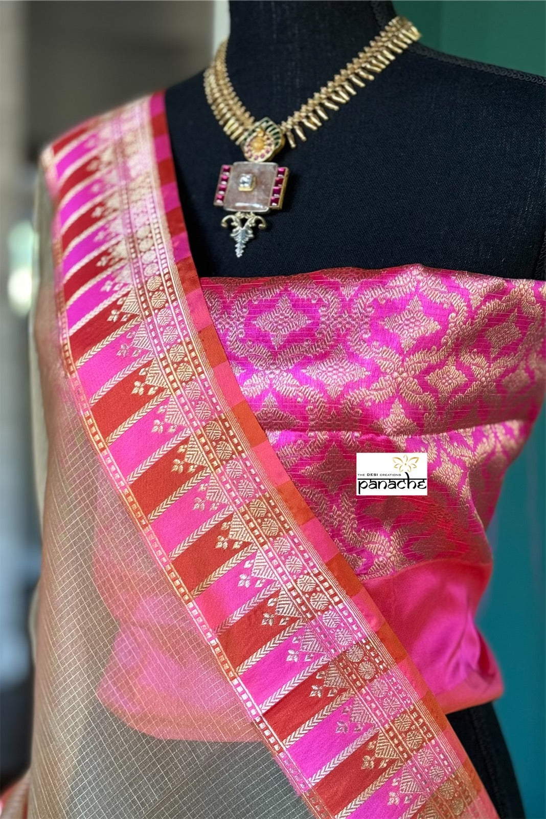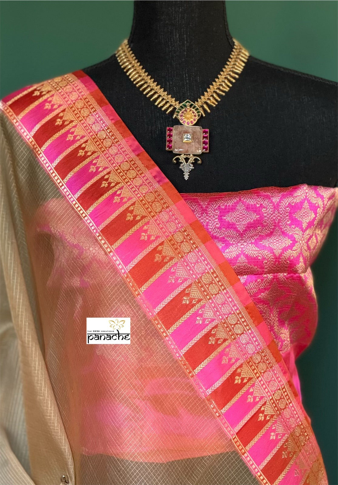 Organza Katan Silk Banarasi - Tan Pink Orange Checkered