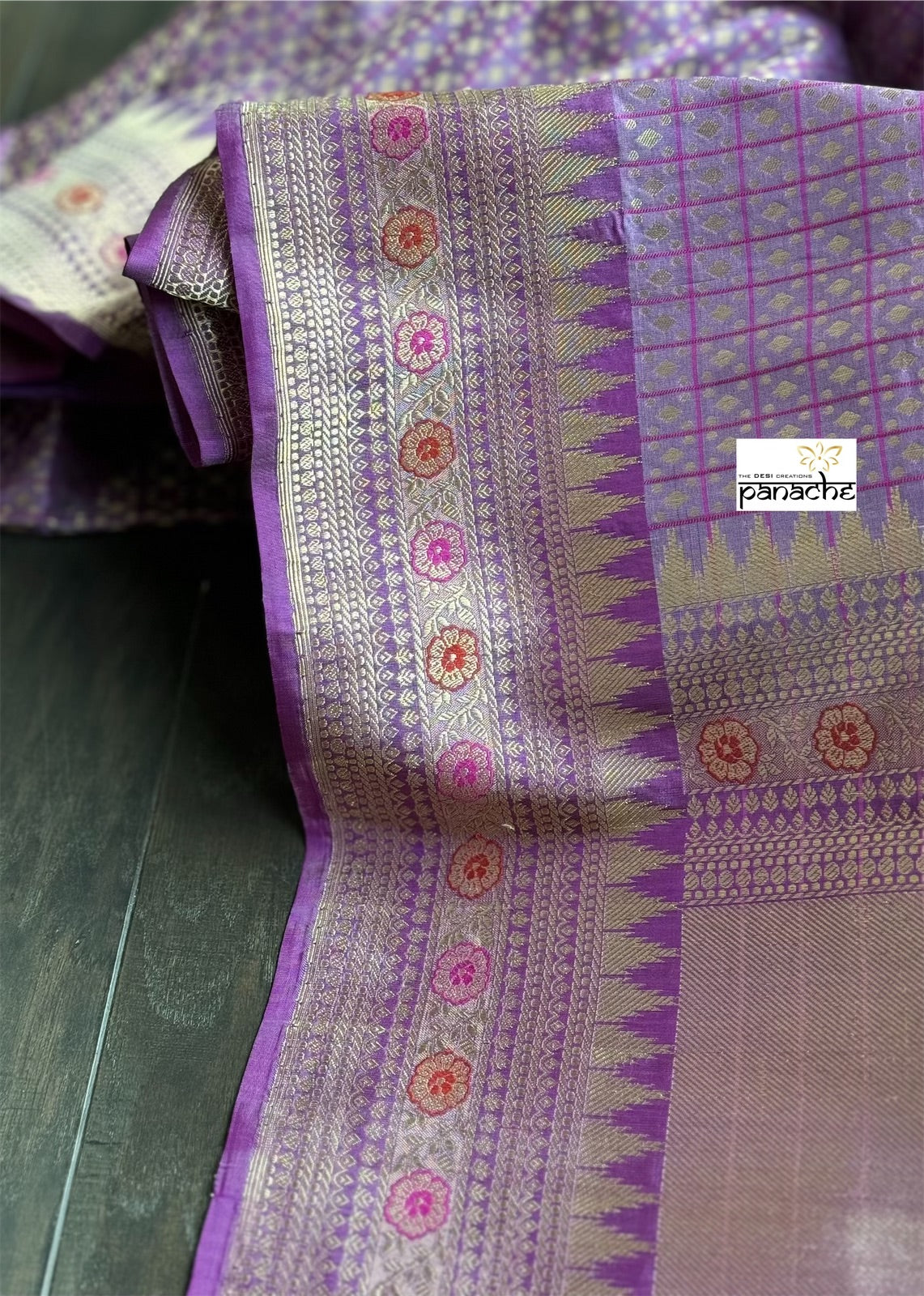 Description: Intricate antique Zari kadwa Weave throughout the silk base and checkered pattern. Kadwa woven temple meenakari border and Pallu