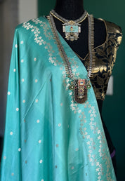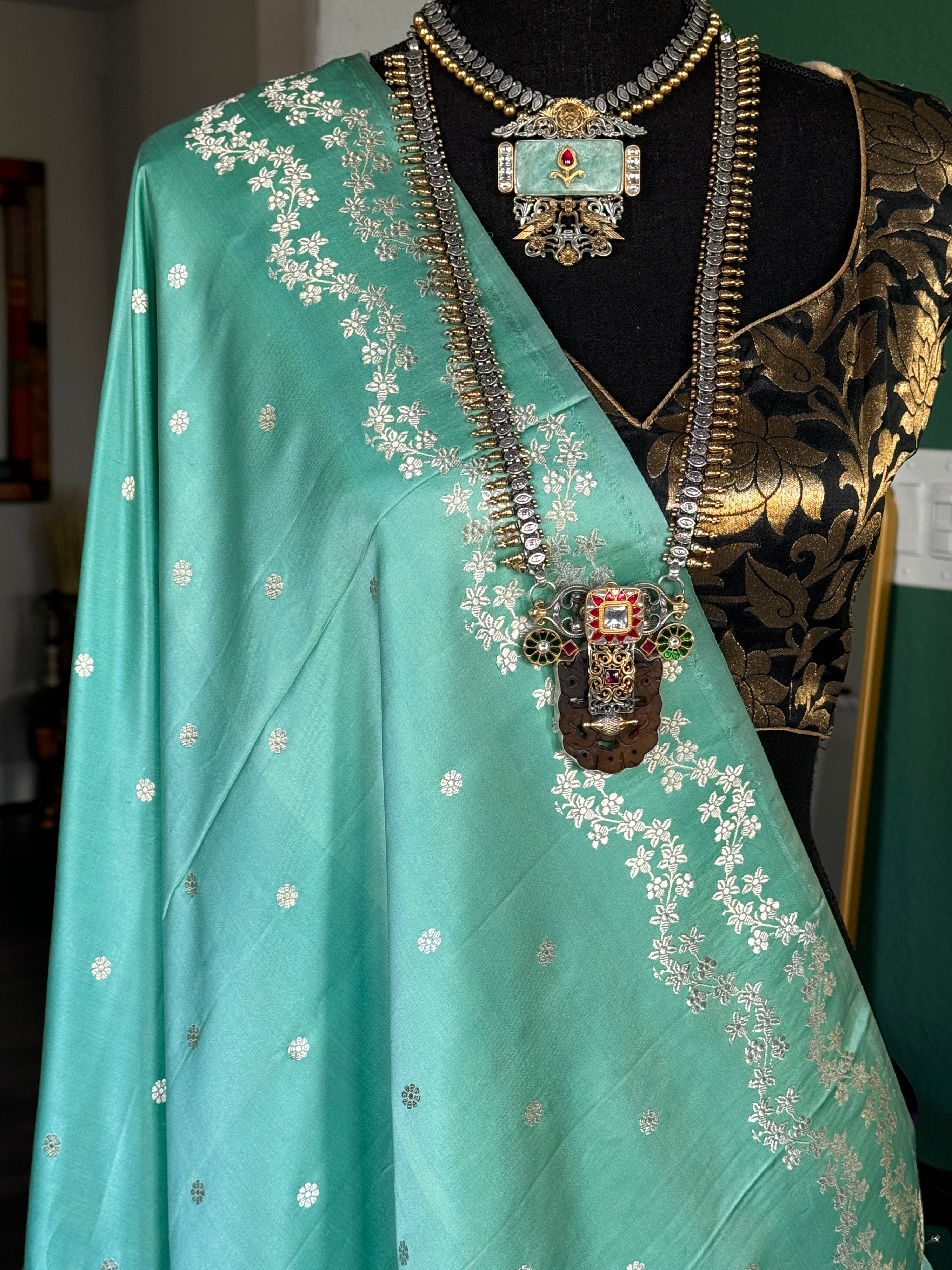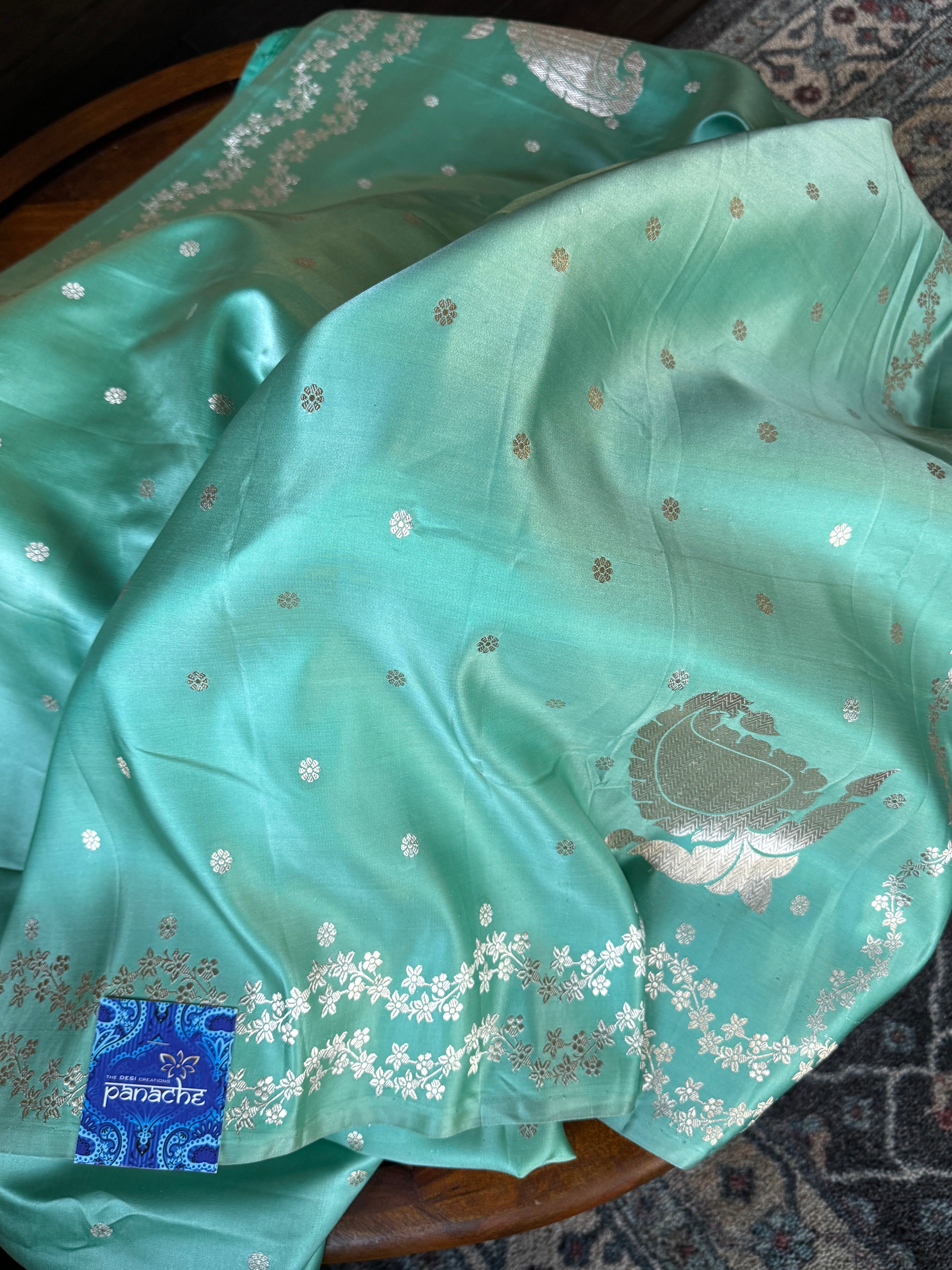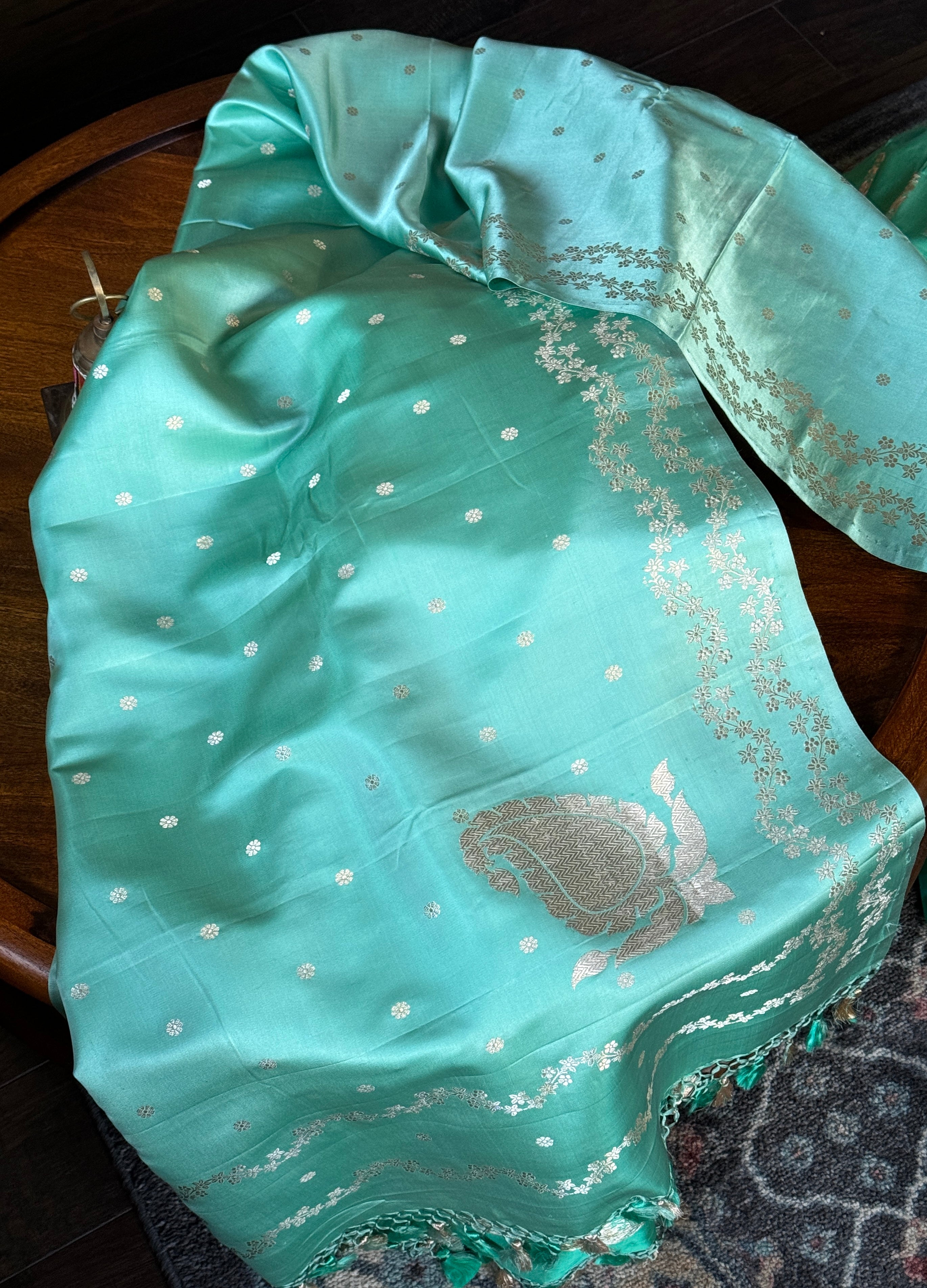 Design : Sea green body with zari designer border woven, Zari woven motifs on body.