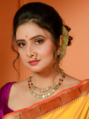 Design : Golden Zari Paithani woven border and palla. Upper border has single Munia and skirt border has double Munia motifs. Zari woven motifs on body.