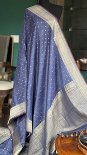 This saree's grey and blue tones are complemented by intricate Zari motifs, making it a true standout.