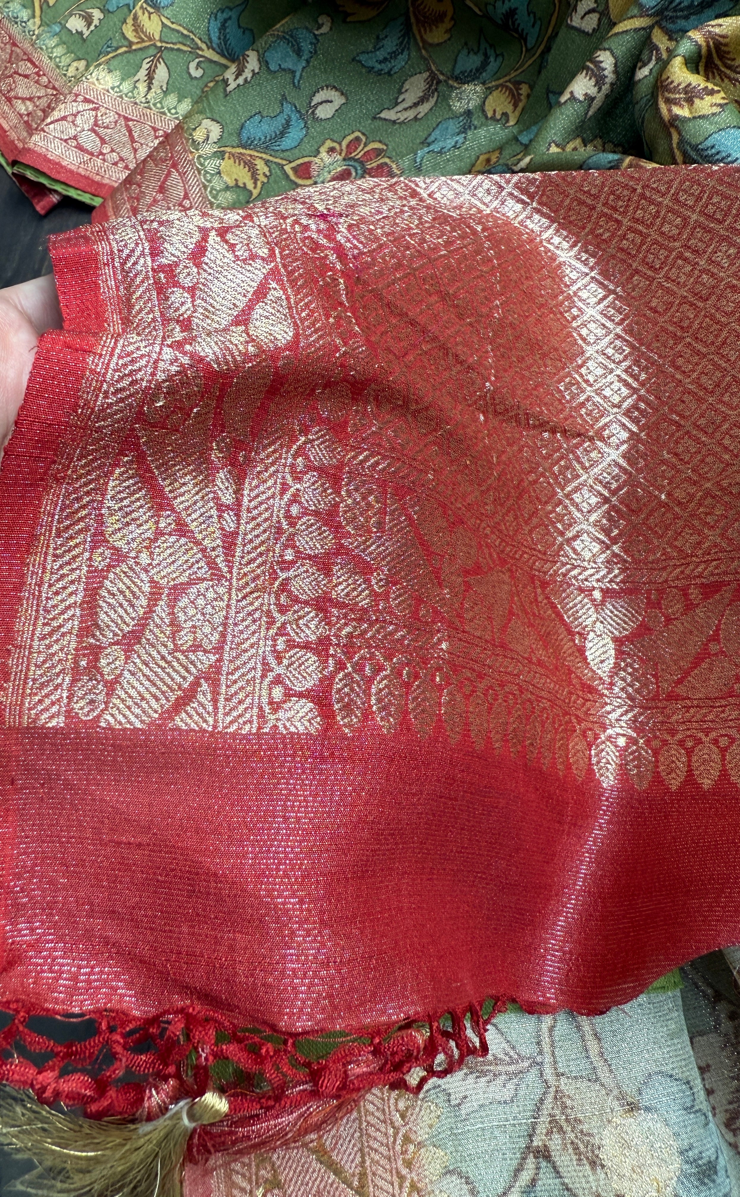 Design : Kalamkari Digutal print on body, Banarasi woven border and palla, Zari weaving throughout the body.