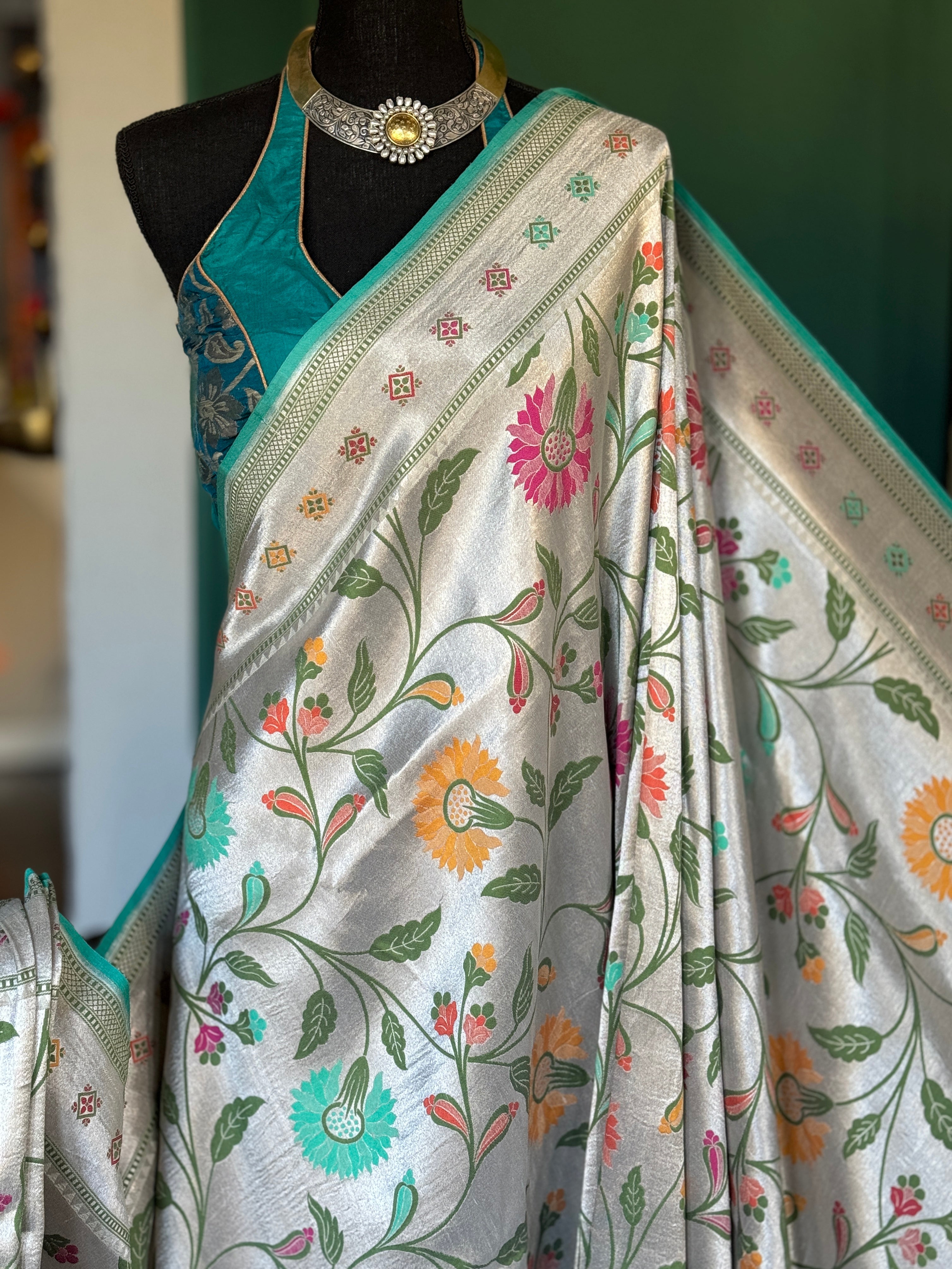 Design : Antique silver Zari banarasi Tilfi jaal work with meenakari on Silver body.