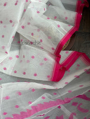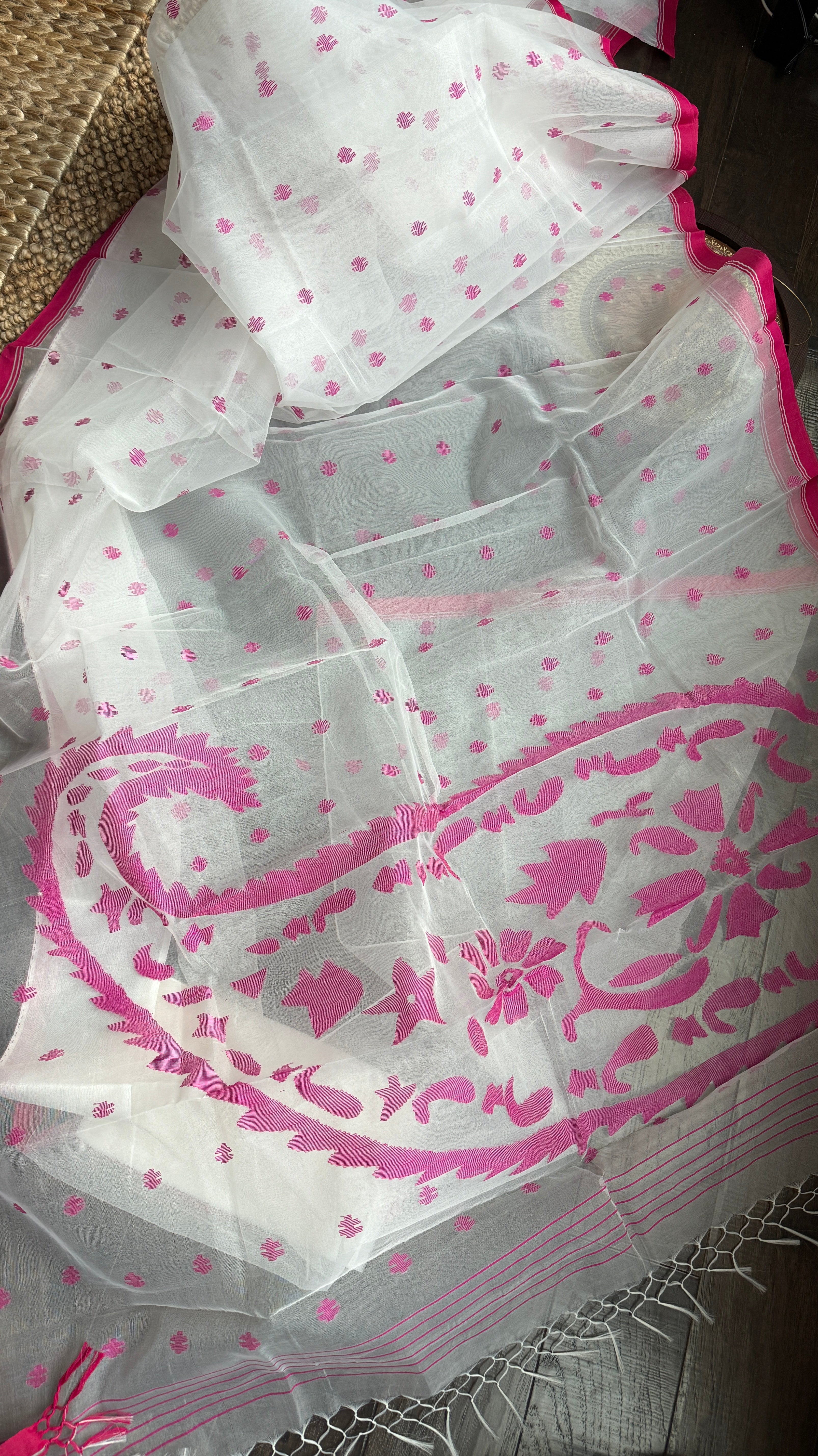 Design : Muslin Silk with Jamdani weave with reshami. Paisley on pallu