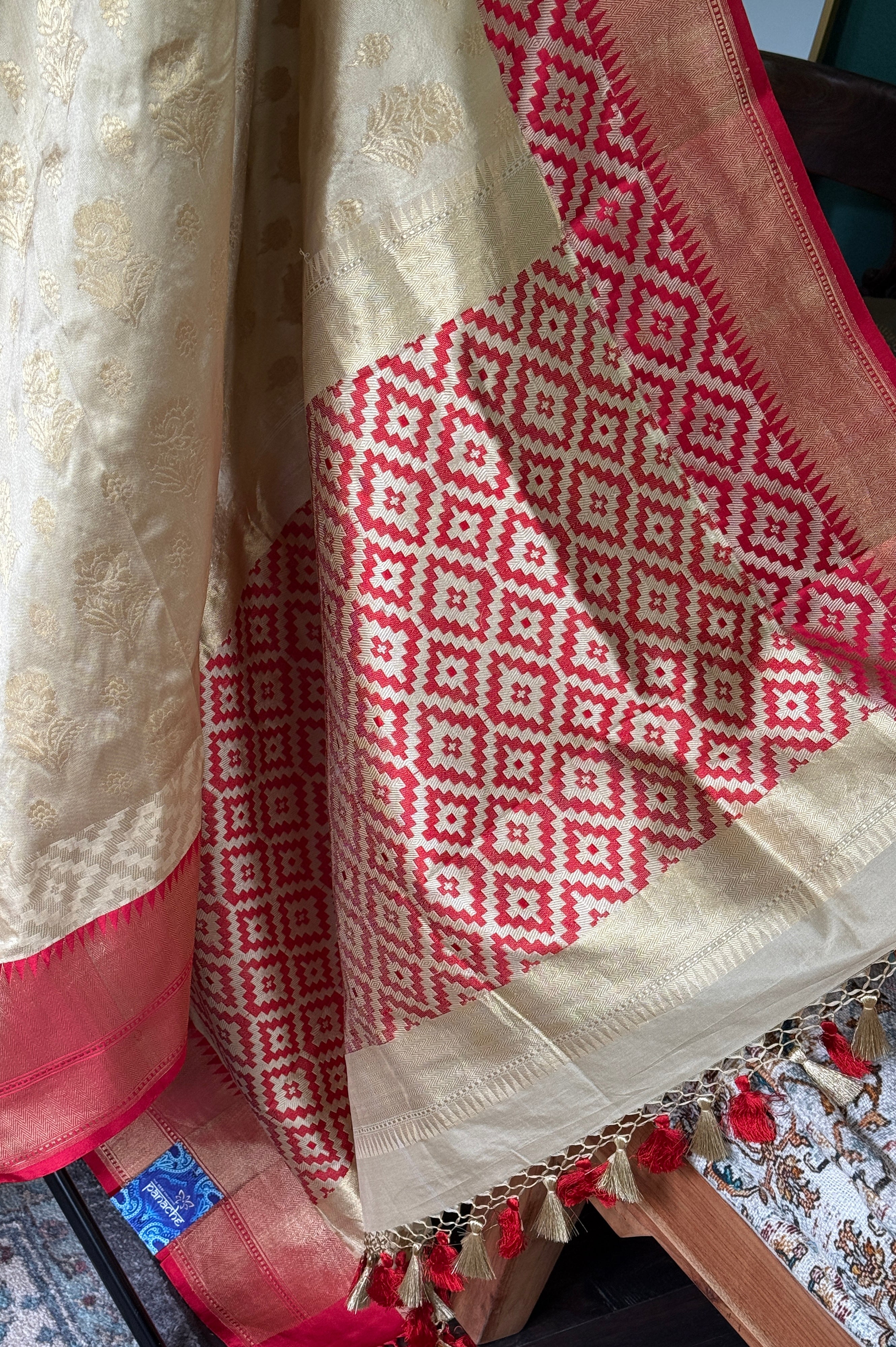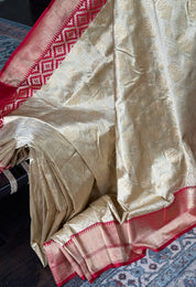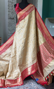 Pure Katan Silk Banarasi - Golden Beige Red Kadwa woven