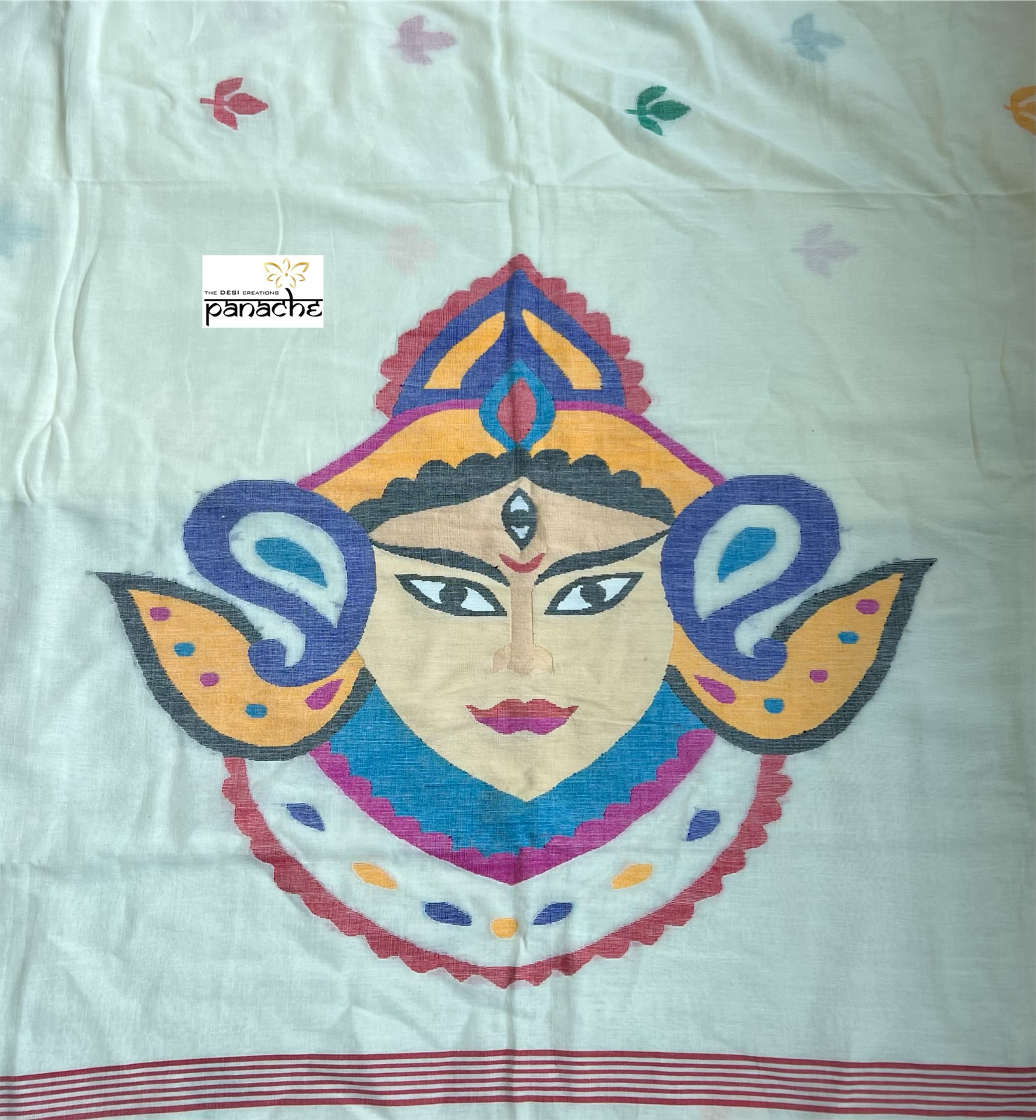 Design : Body color cream plain with red border, Durga woven on pallu, motifs on body