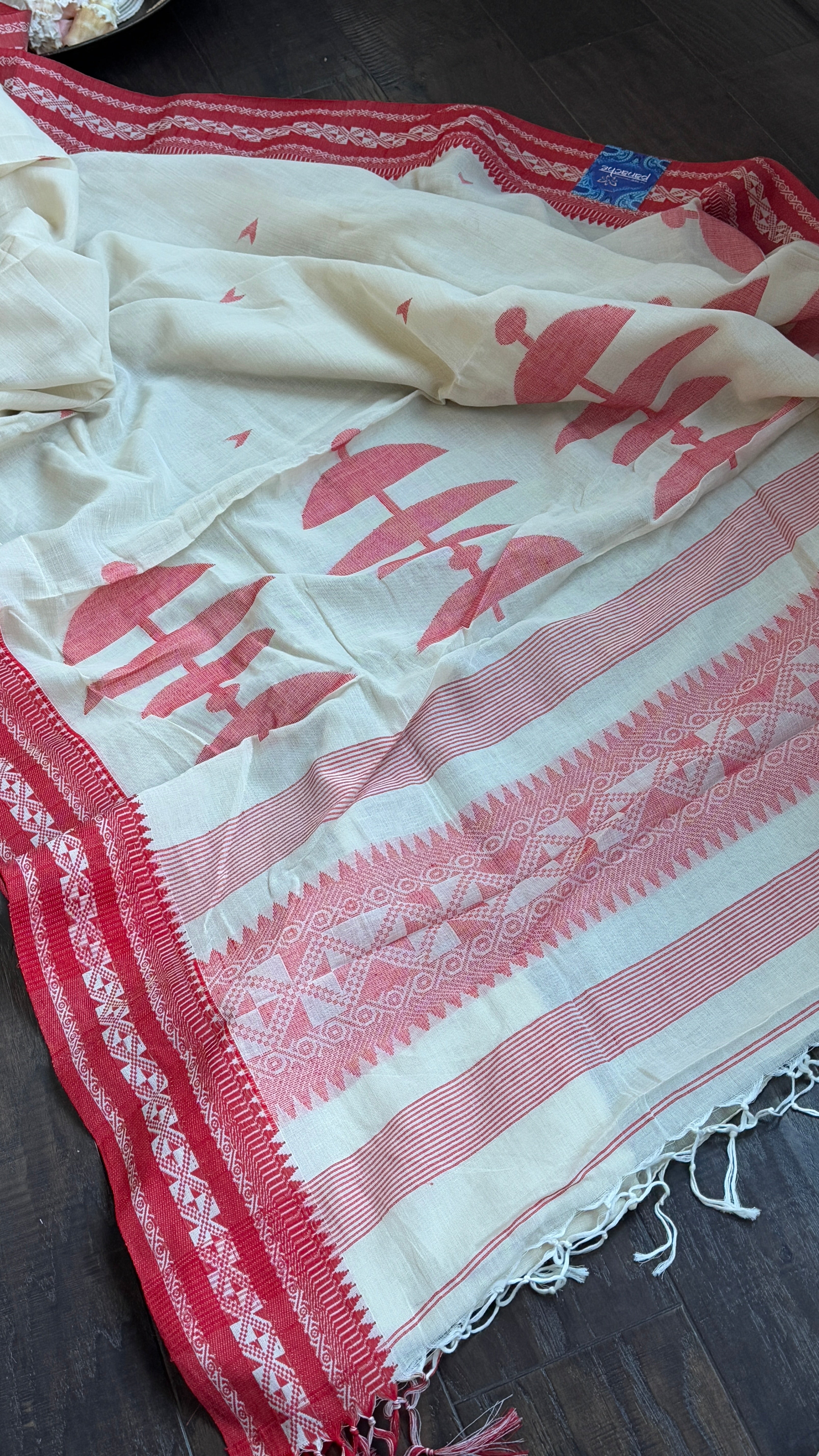 Pure Khadi Cotton Jamdani Handwoven - Off White Red