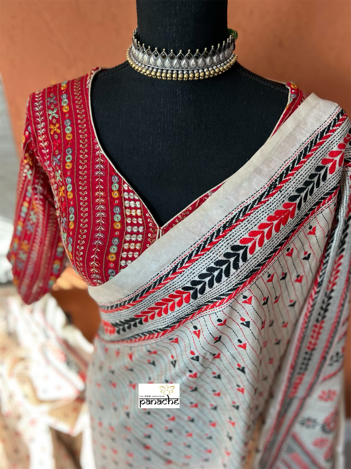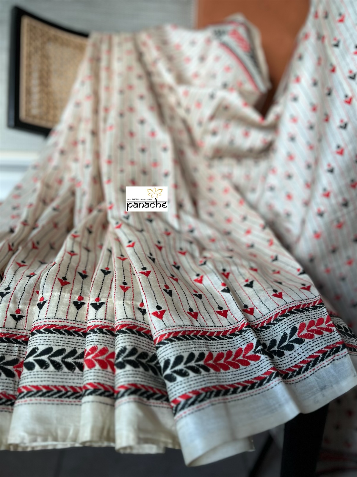 Pure Tussar Silk Kantha Stitch - Beige Red Black