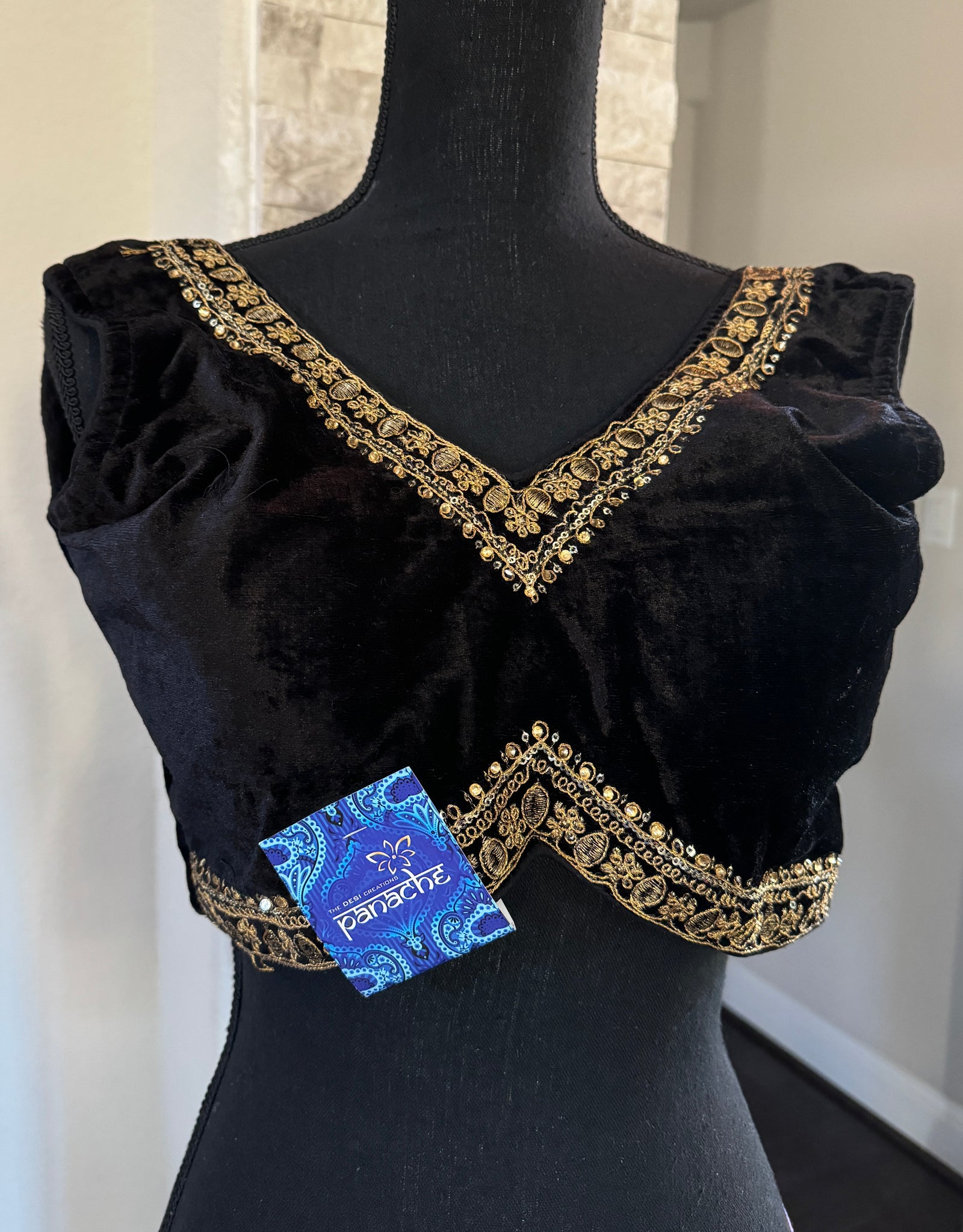 Designer Velvet Blouse - Black Gold Zari Sleeveless