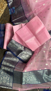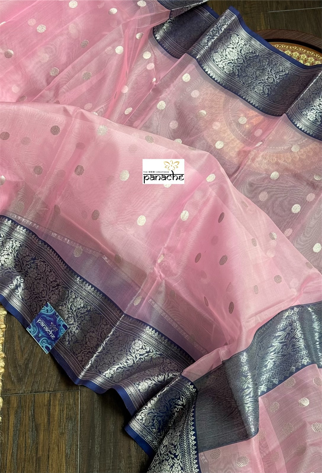 Design : Body is baby pink. Silver Zari woven Border/pallu and Eknalya motifs on body.
