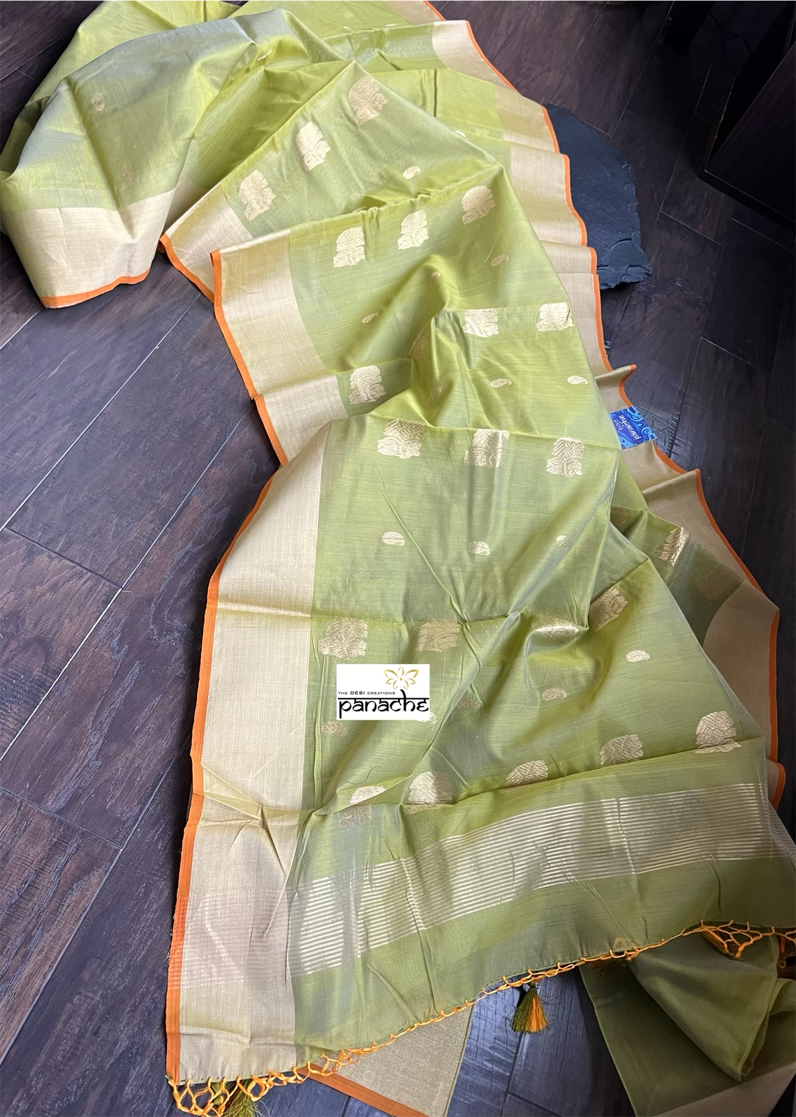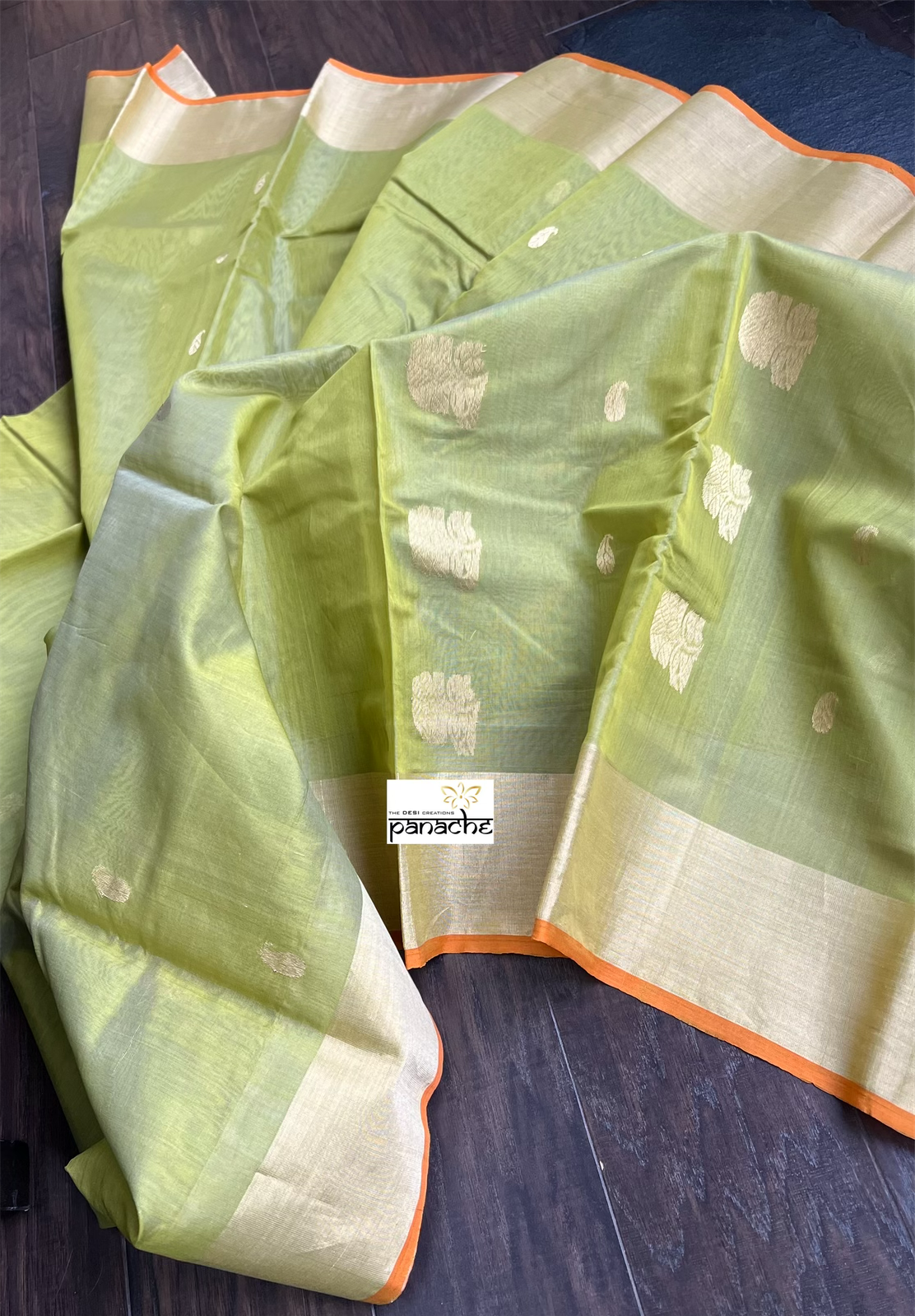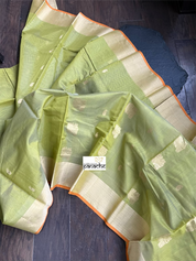 Design : Body color is pista green with orange border lining, Golden Zari border and pallu. Golden Zari Motifs.