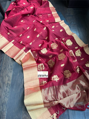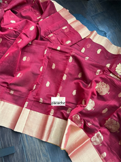 Design : Body color is red color with zari woven motifs, gold Zari border and pallu.