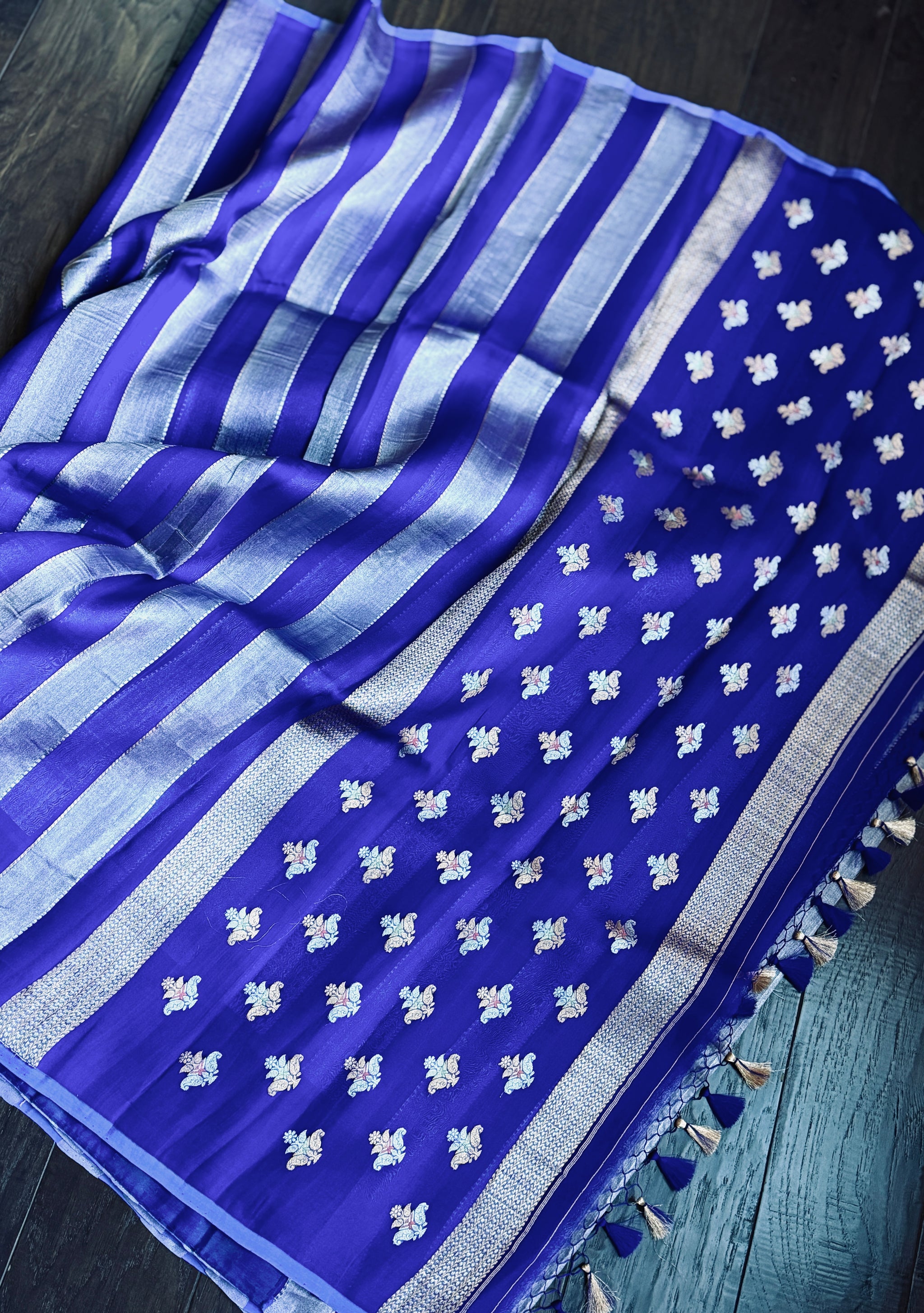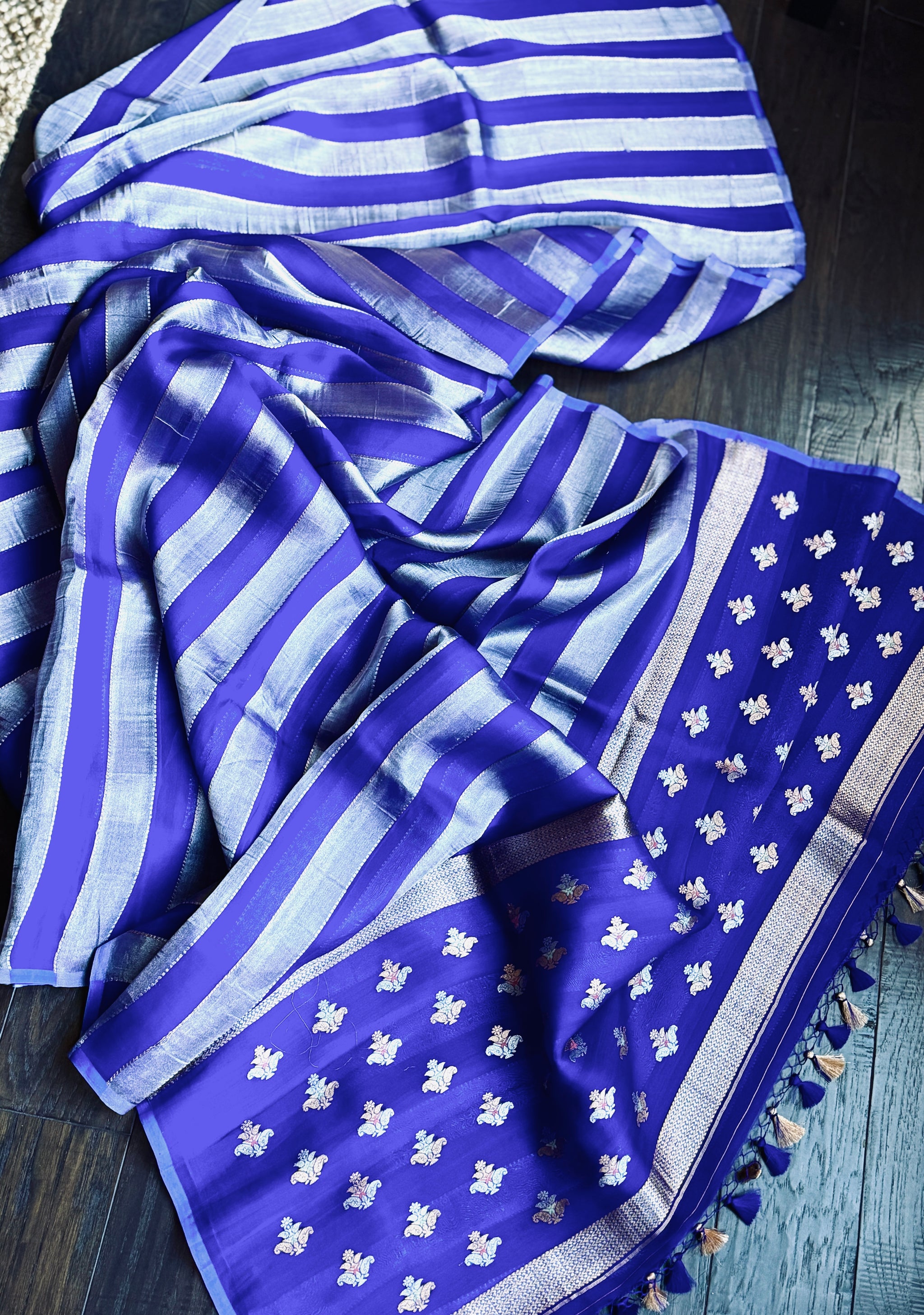 Description: Antique Zari woven striped pattern on body. Zari woven meenakari palla.