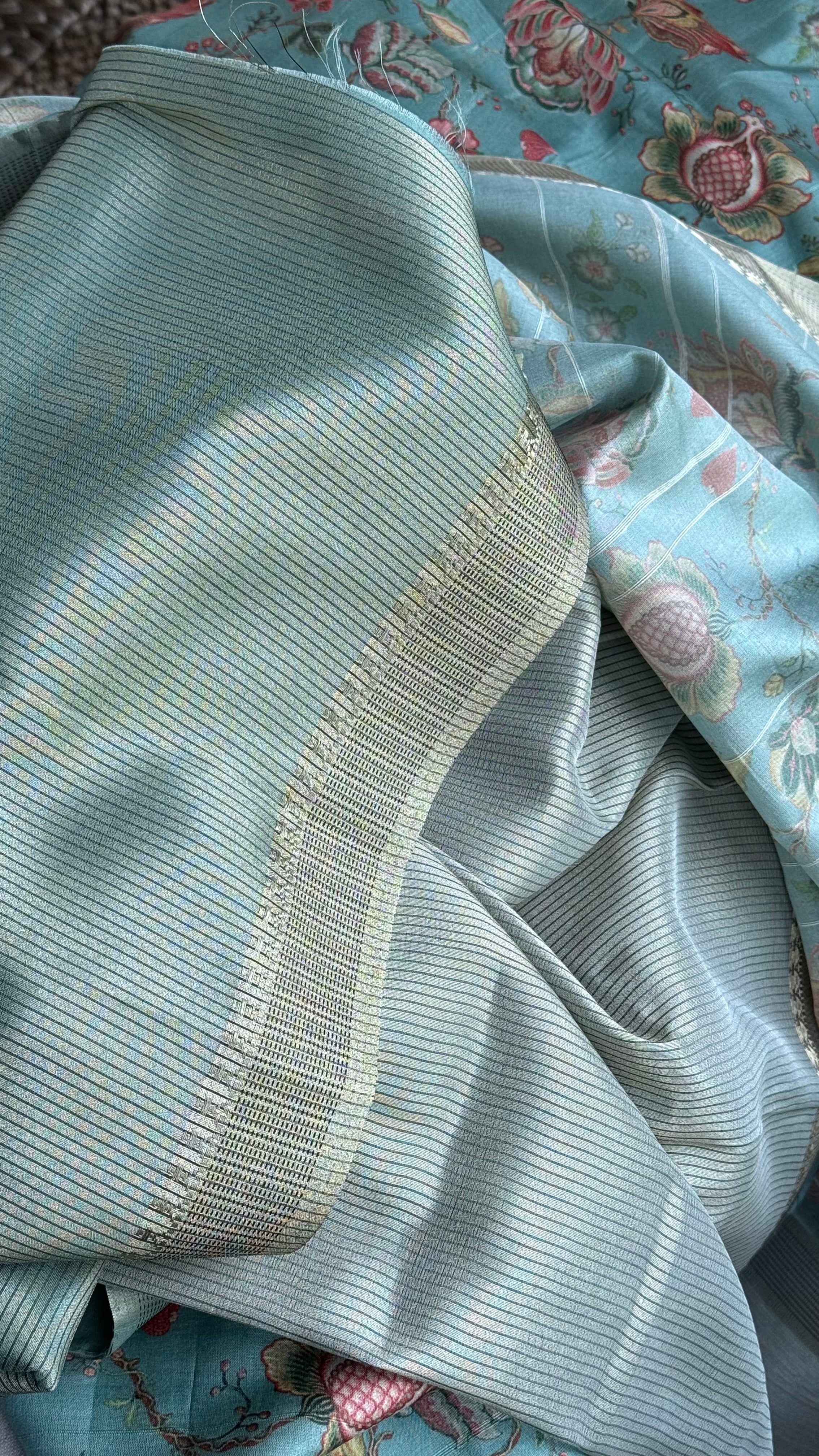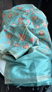 Design : Body is aqua blue with multi color floral digital print on body. Zari woven border