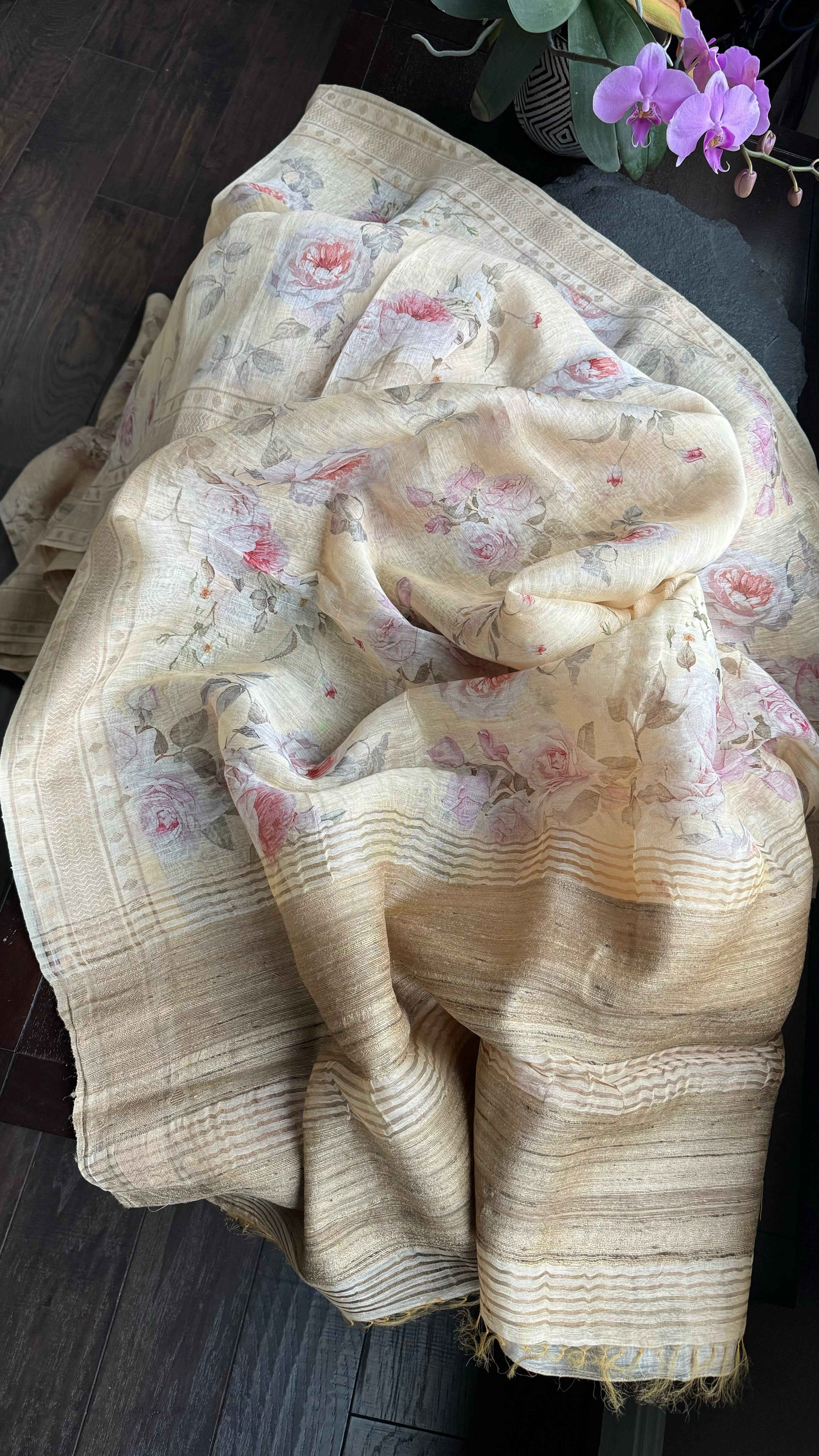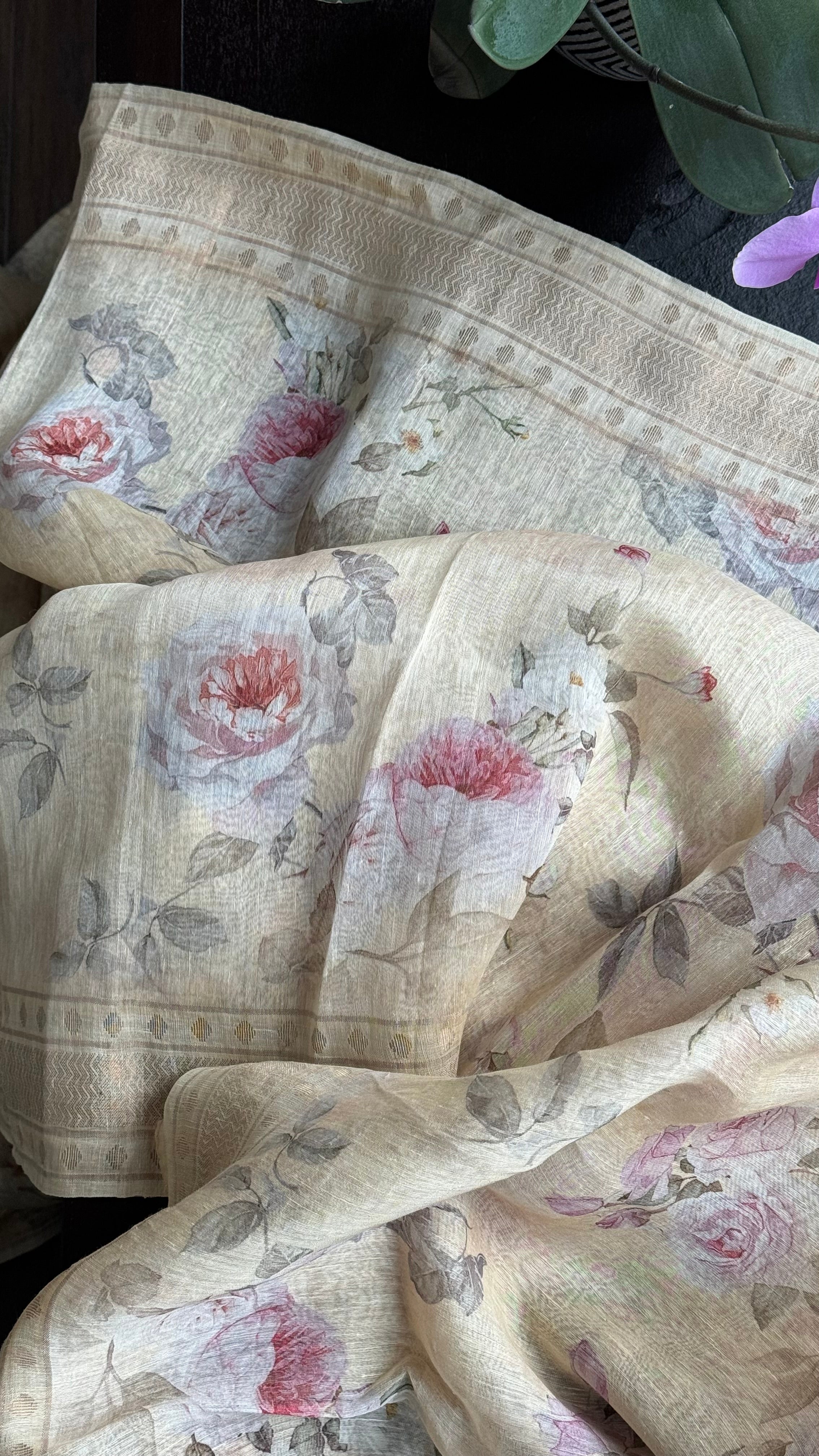 Floral Linen Silk Banarasi - Light Wheat Digital Printed