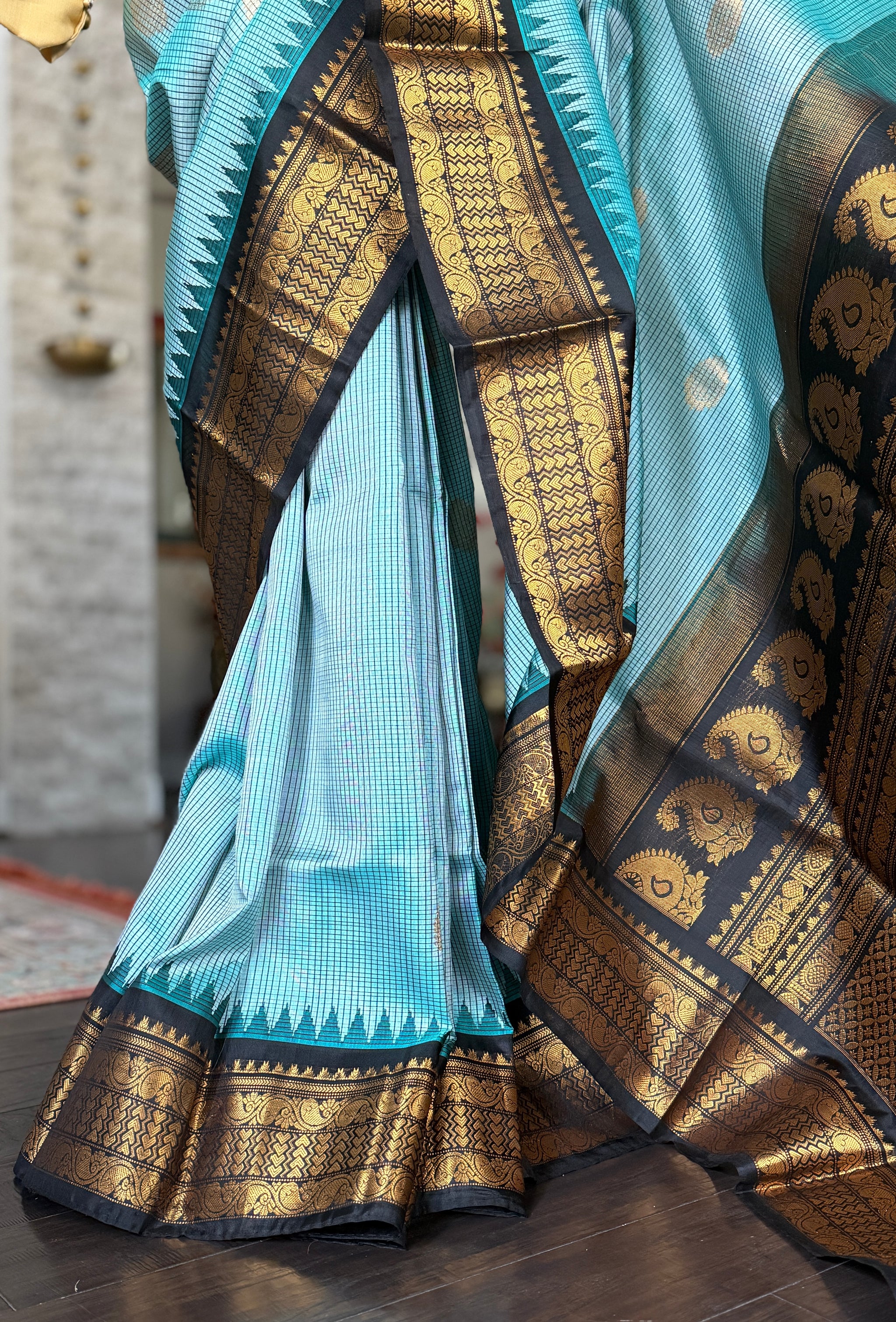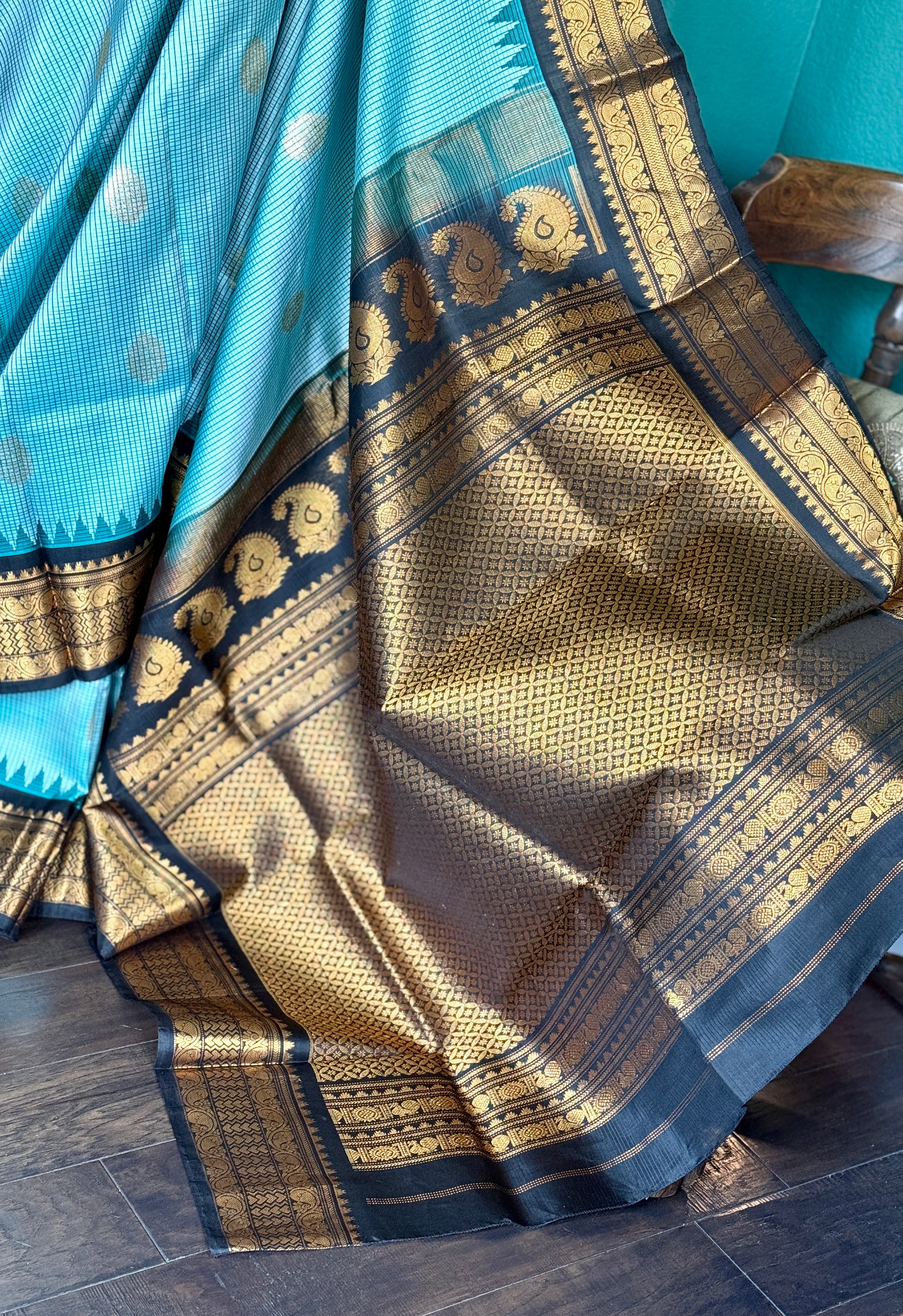Pure Silk Gadwal - Aqua Sea Blue Black