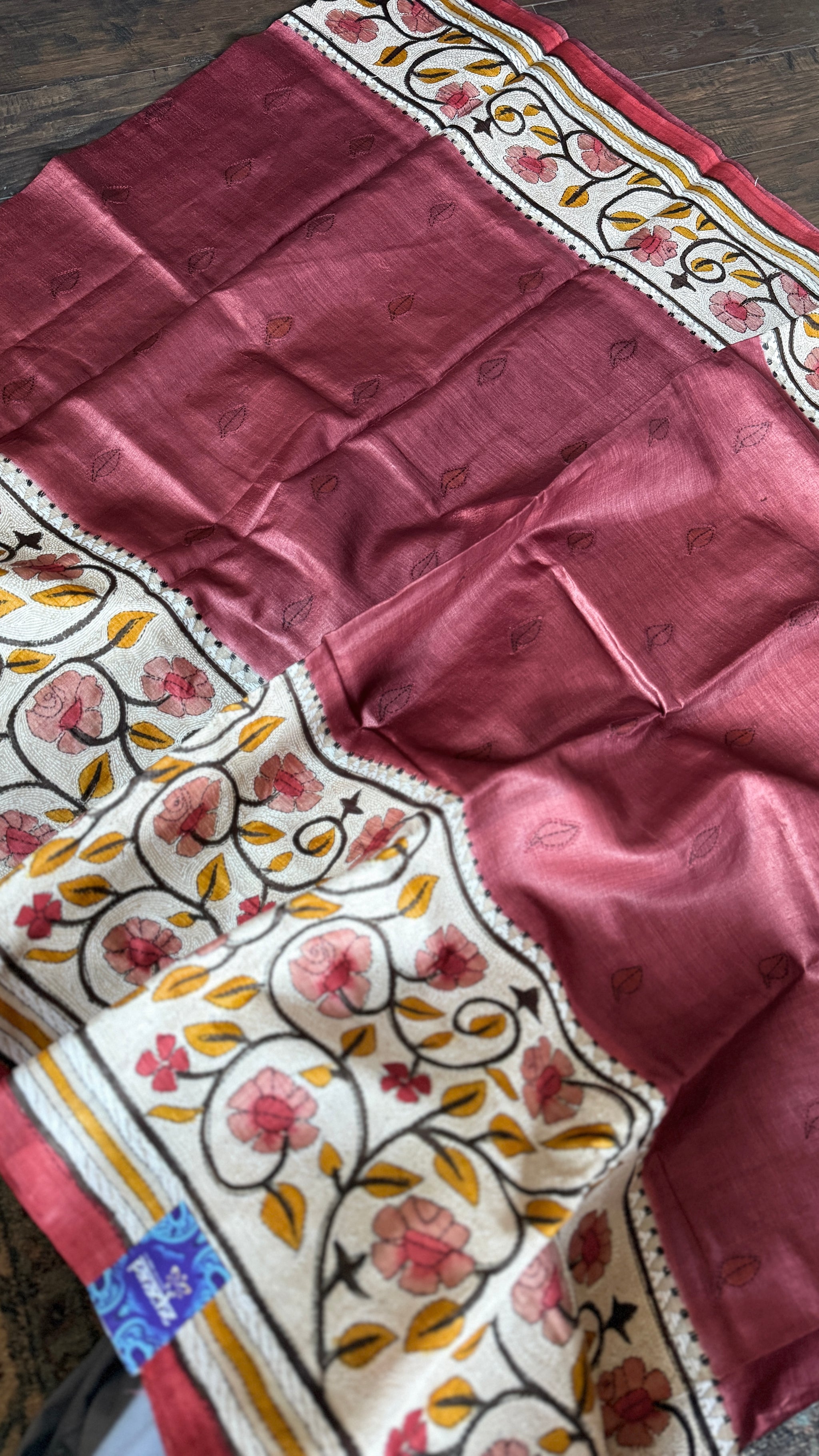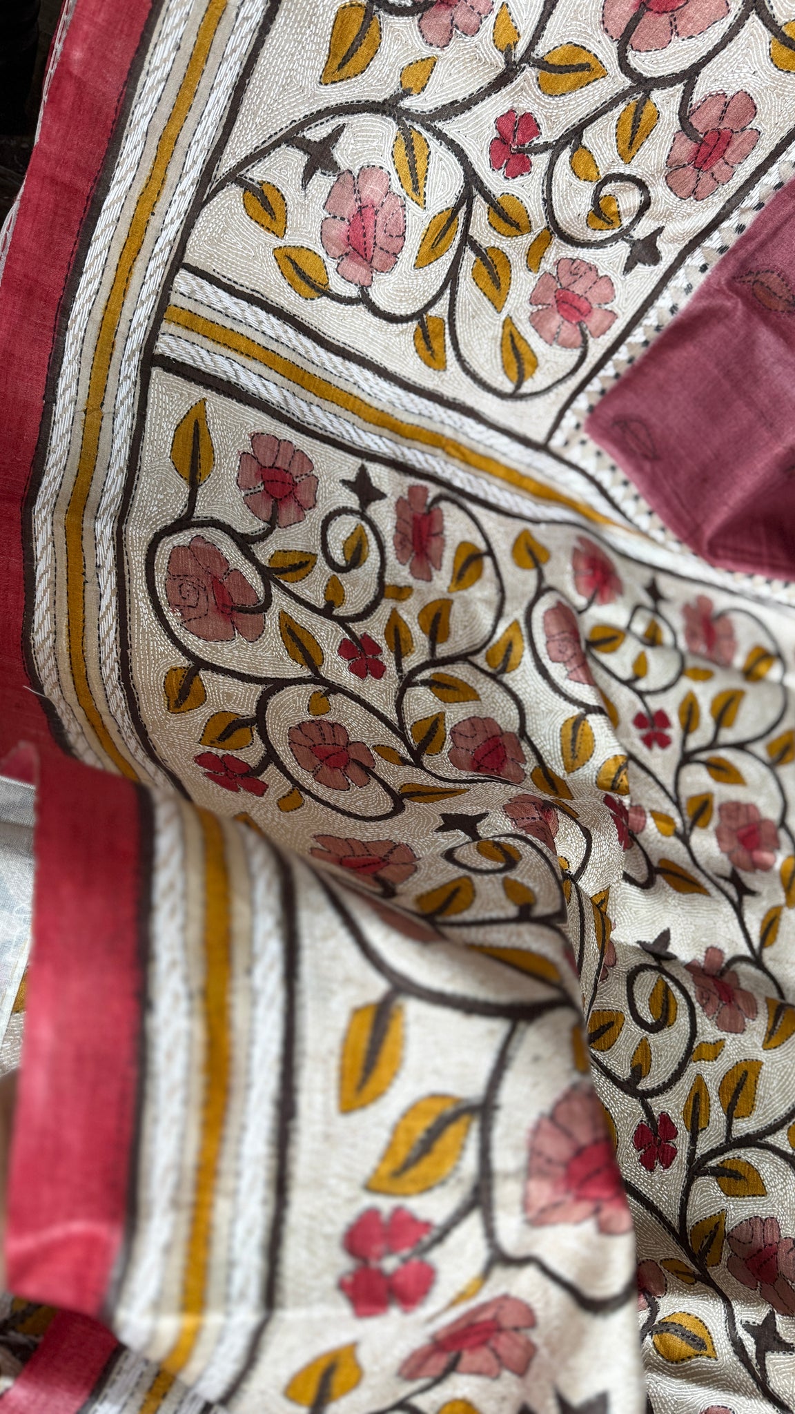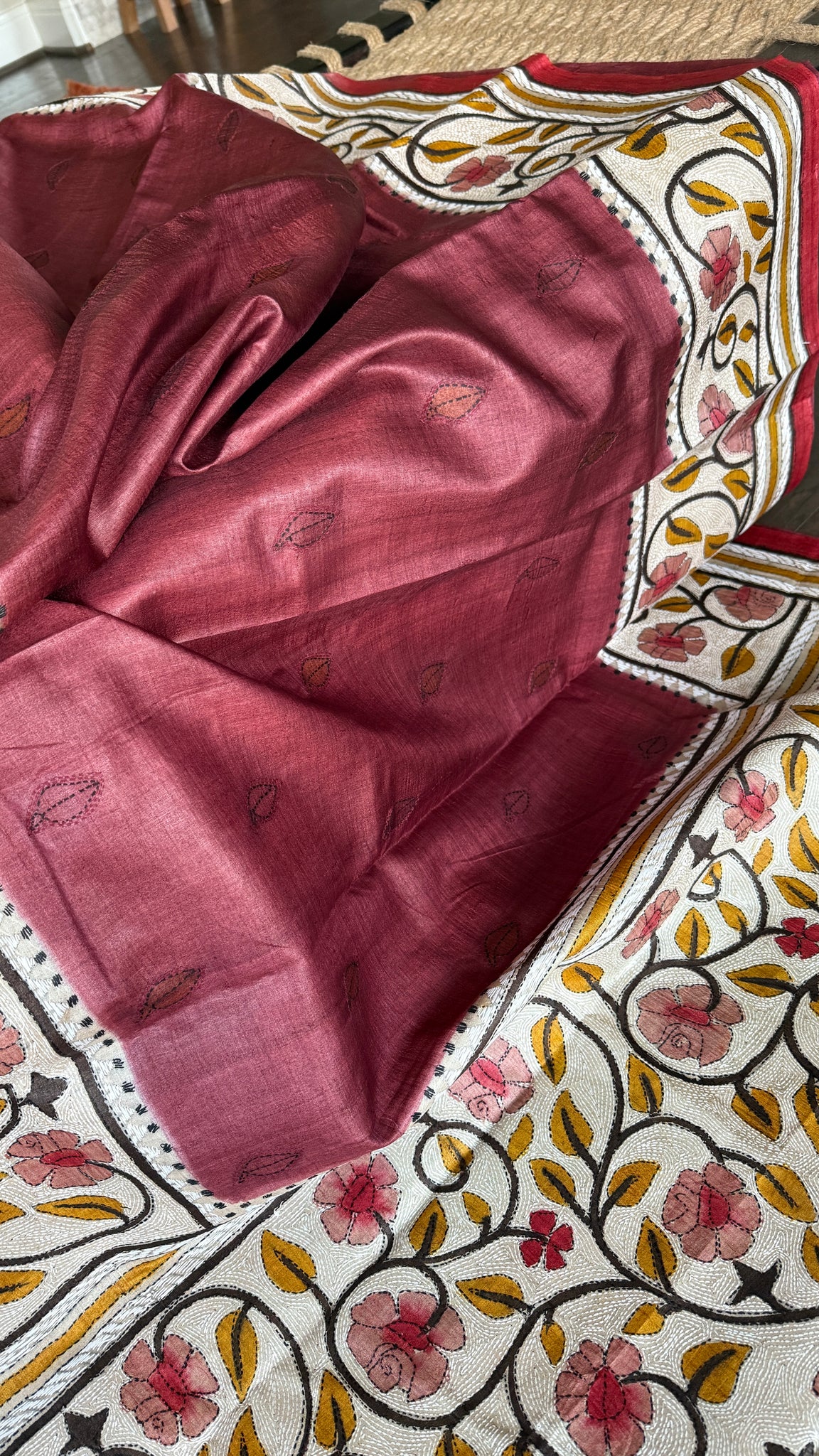 Pure Tussar Silk Kantha Stitch - Maroon Beige
