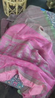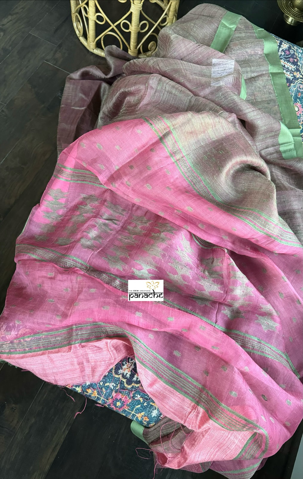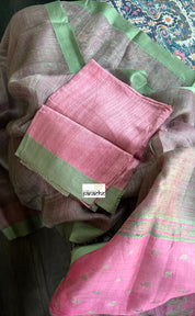 Design : Pure soft Khadi Matka silk pink by green resham woven, Pallu is muslin with Jamdaani weave.