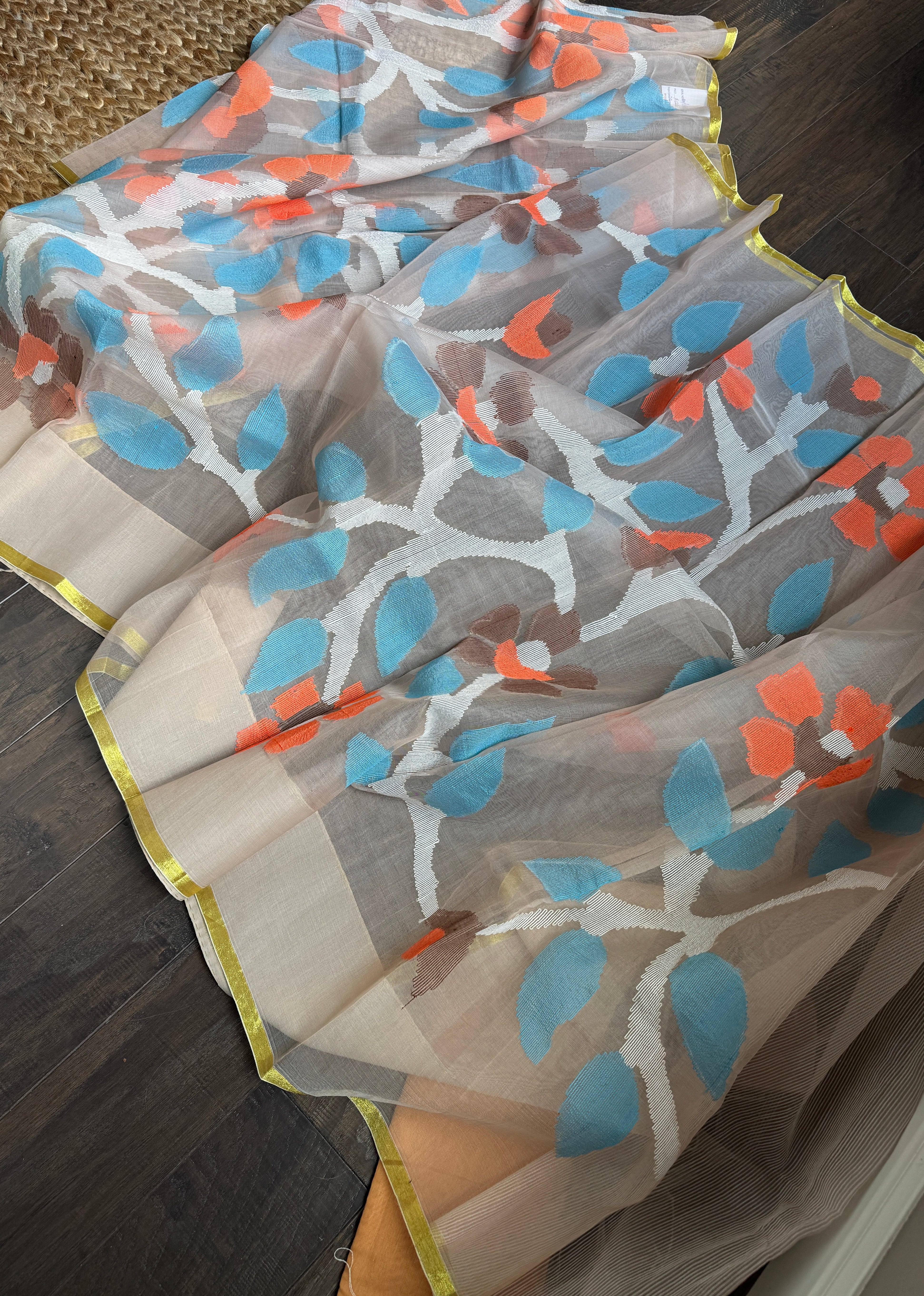 Design : Muslin Silk with Jamdani work with Zari and resham, striped pallu