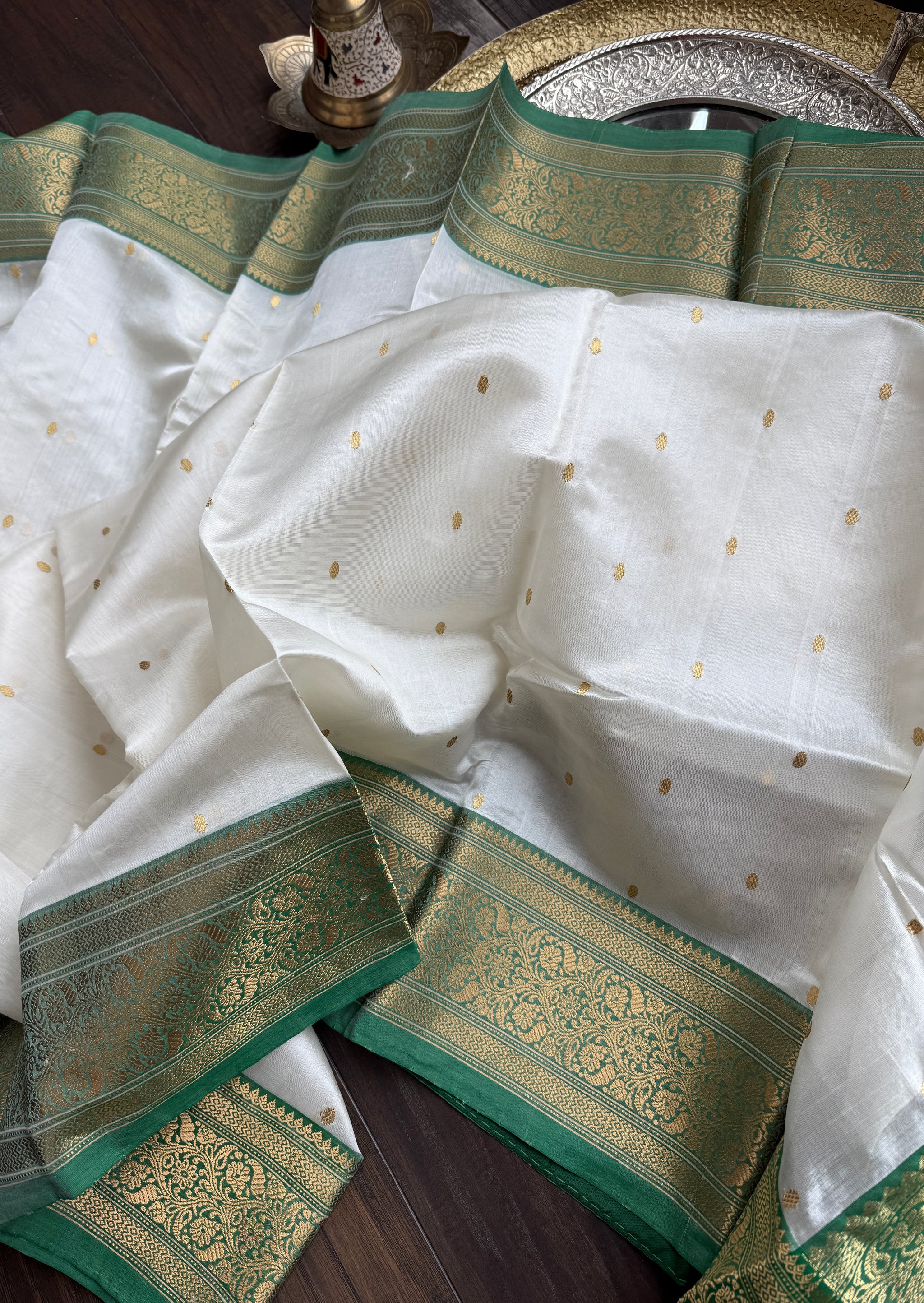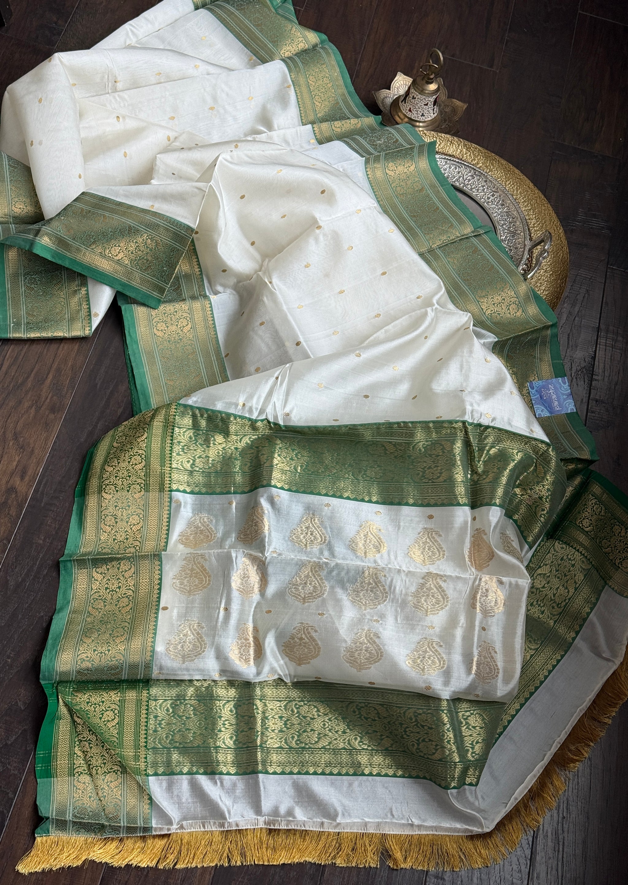 Pure Chanderi Pattu Silk - Cream Green Gold Zari Woven