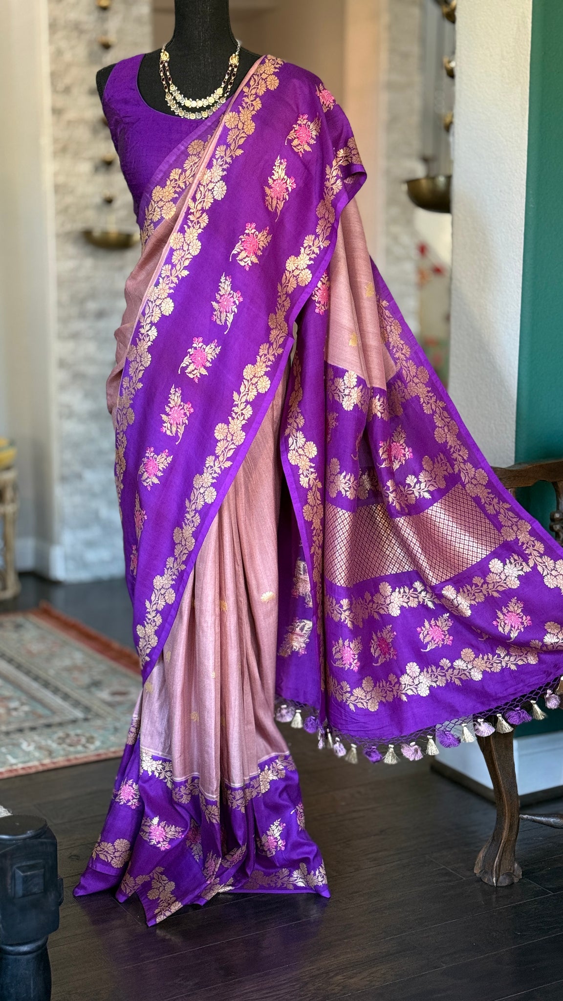Tussar Georgette Katan Silk Banarasi - Blush pink Purple Kadhua