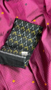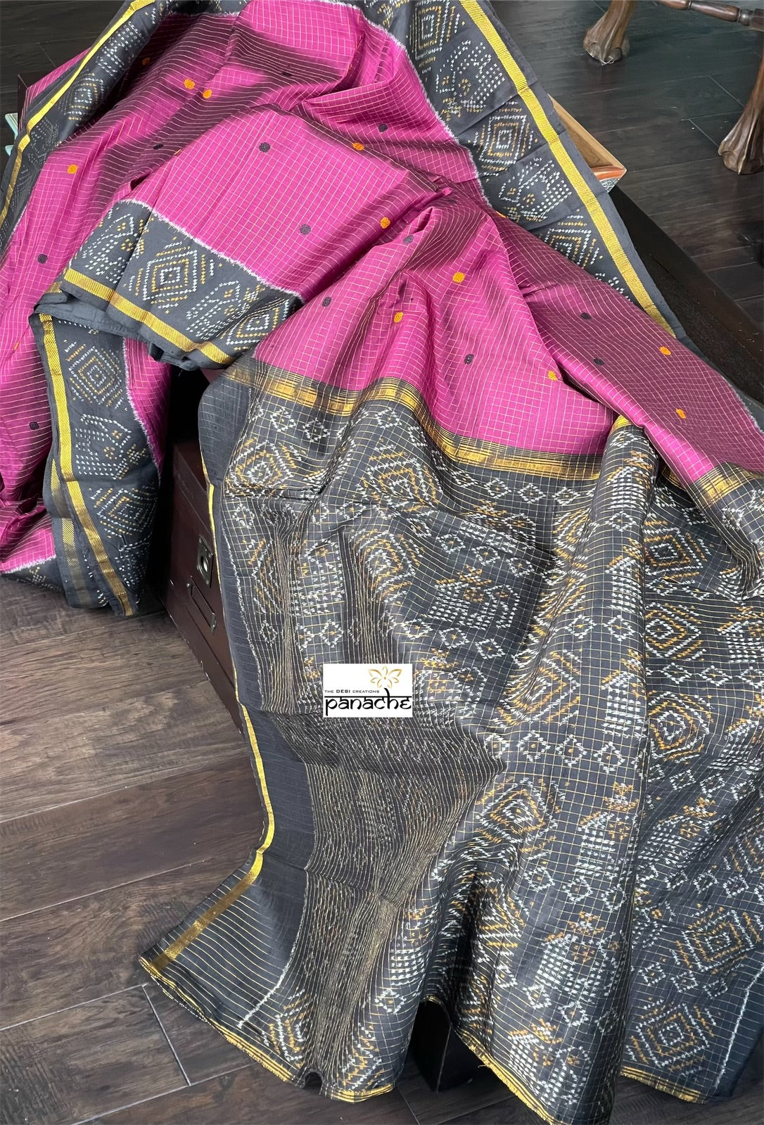 Design : Magenta Purple body Zari checks and motifs. Ikat woven border and Palla.