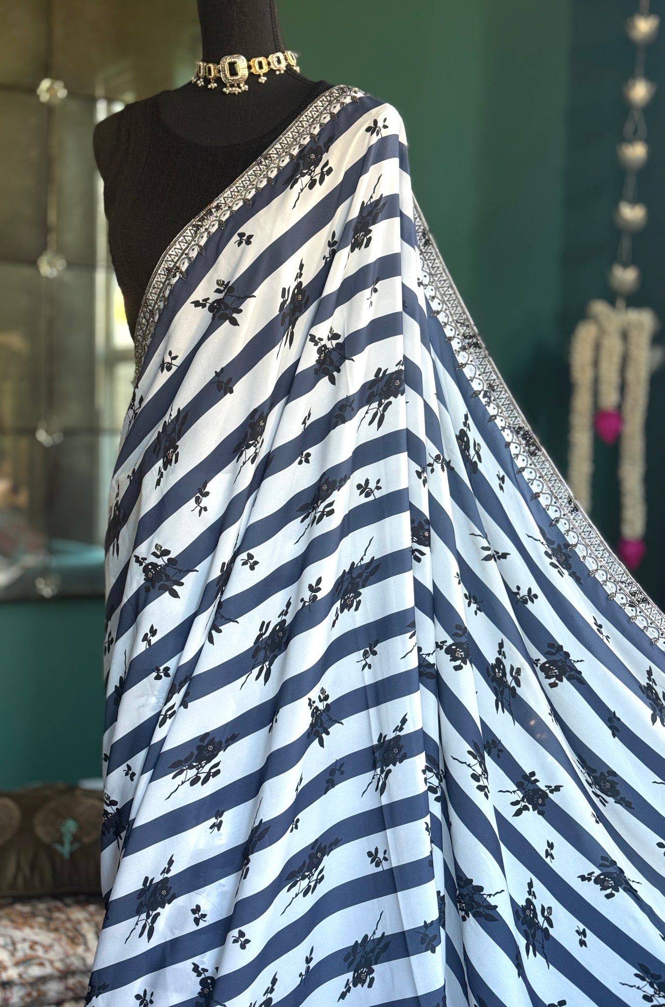Designer Georgette- White Blue Black