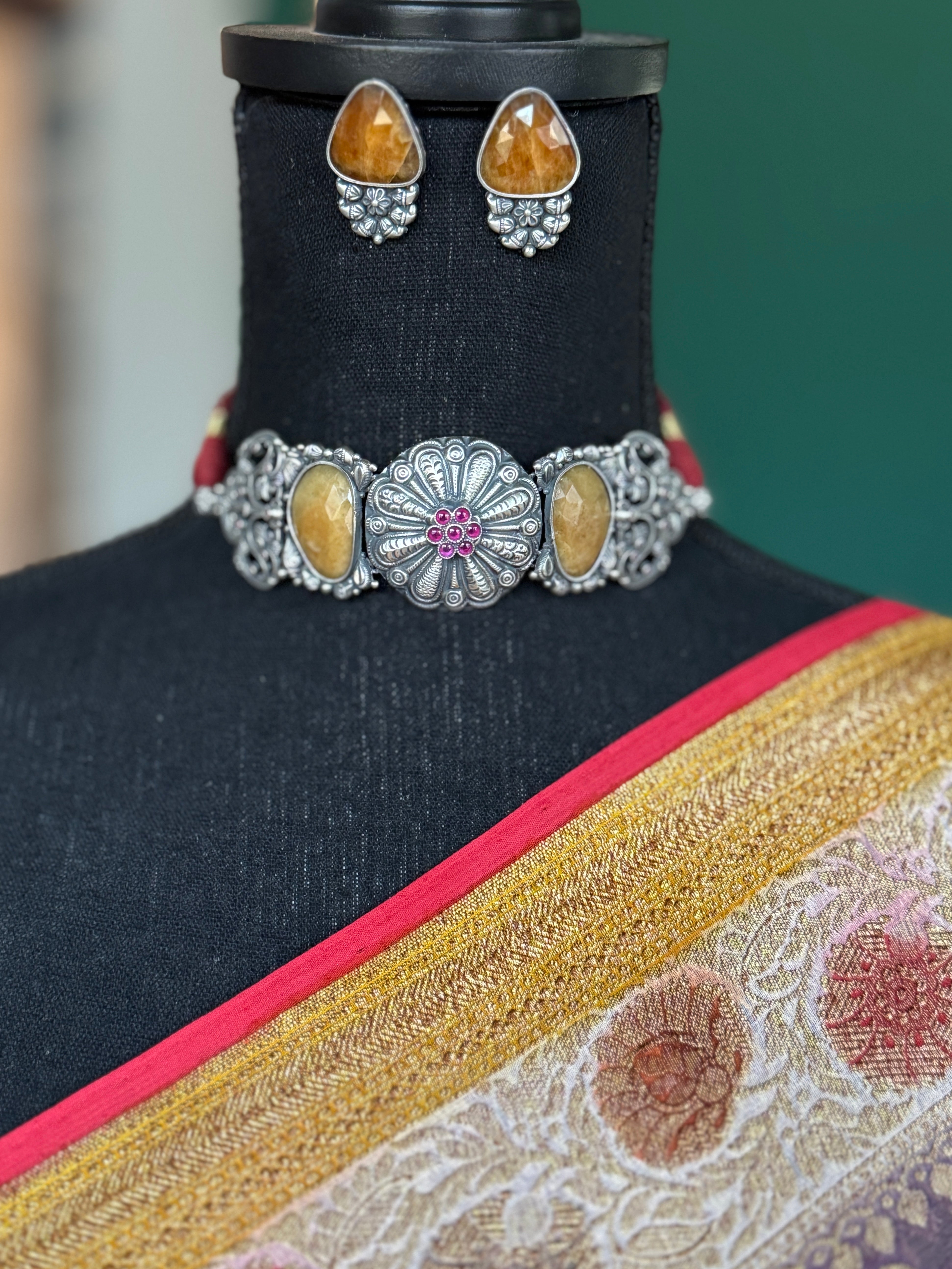 Choker Earring Set 925 Silver - Yellow Sapphire