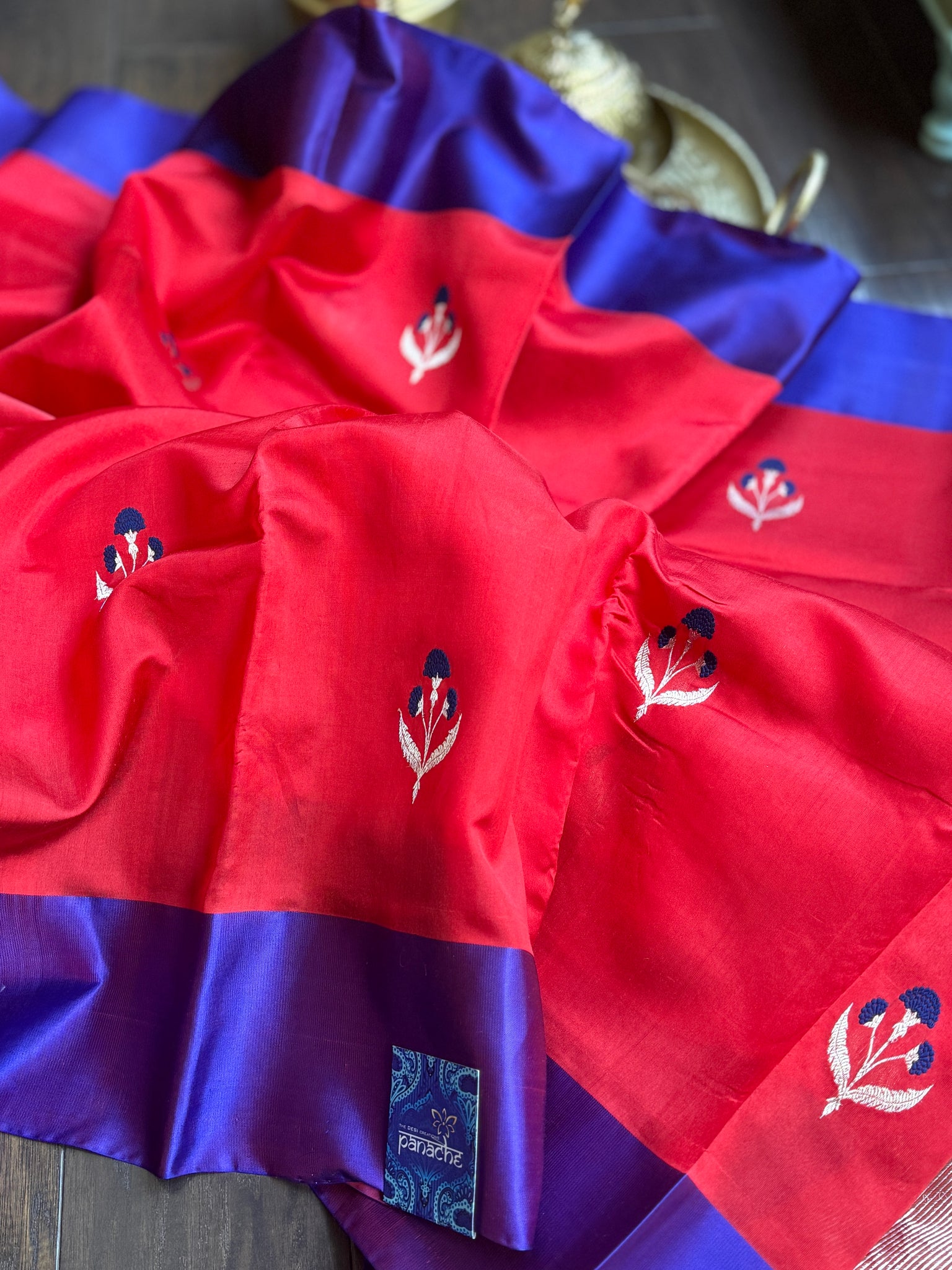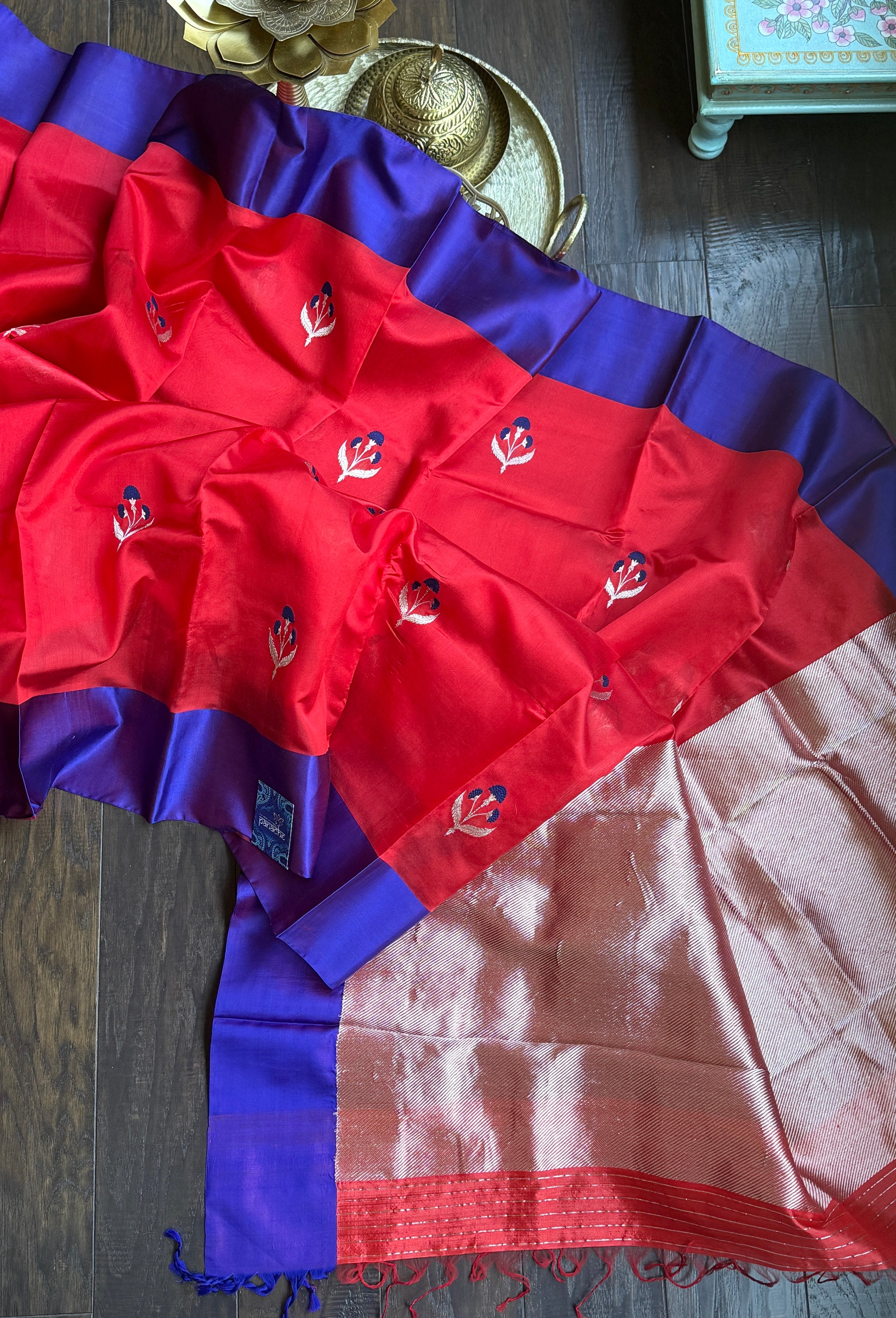 Design : Body is Red with gold Zari woven meenakari motifs, Pattu silk with purplish blue Mashru border.