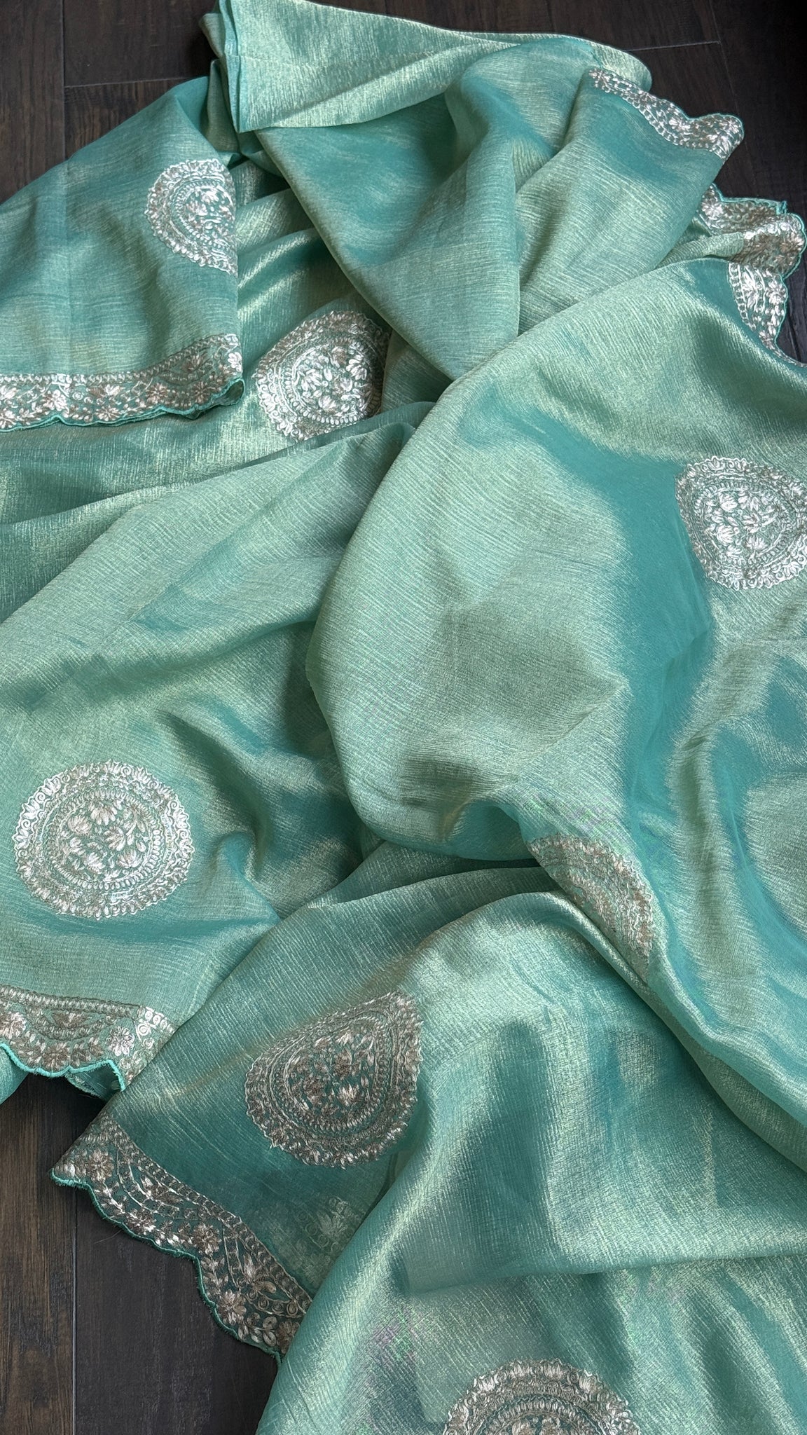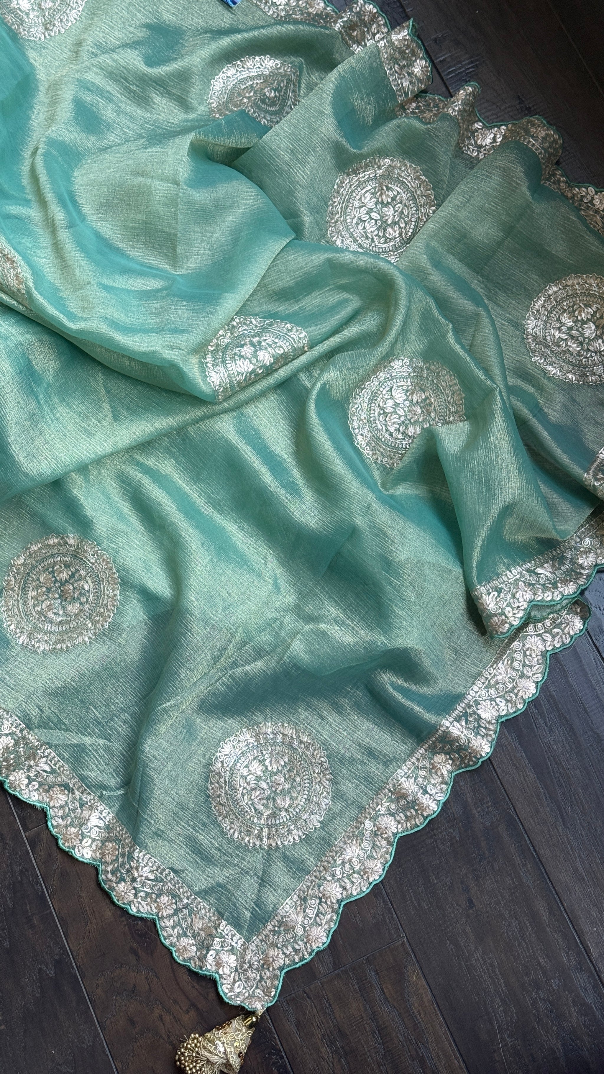 Design: Crushed Georgette Tissue Silk body with hand Pitta work.