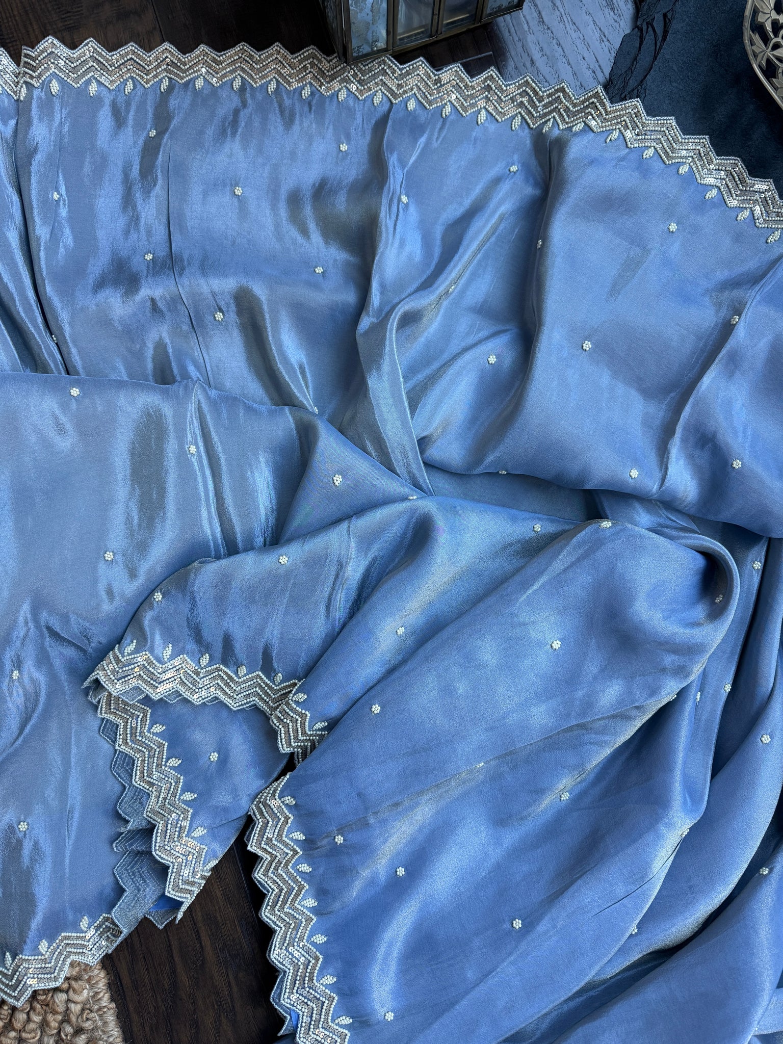 Color: Light metallic blue, antique Zari, pearls
