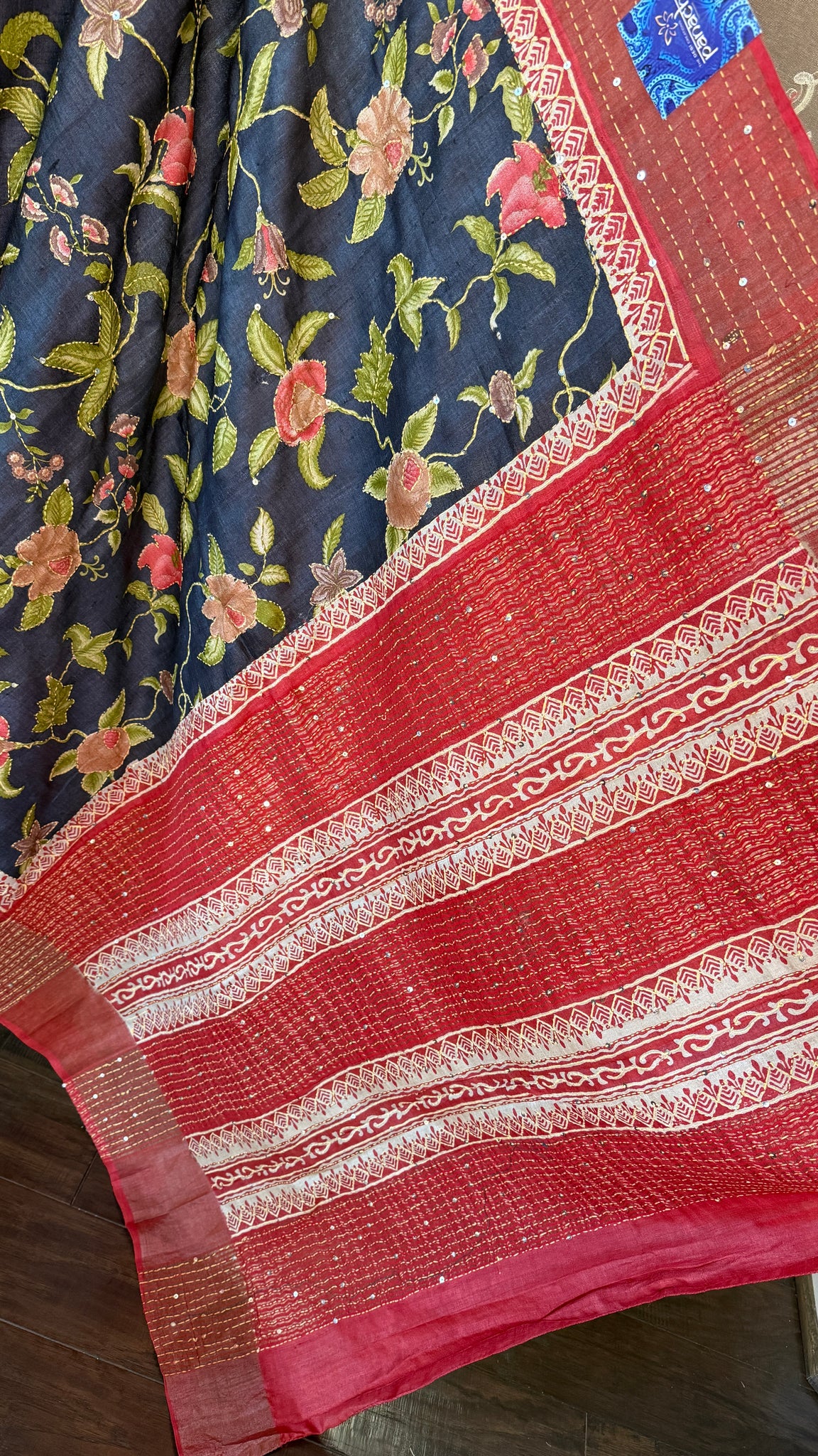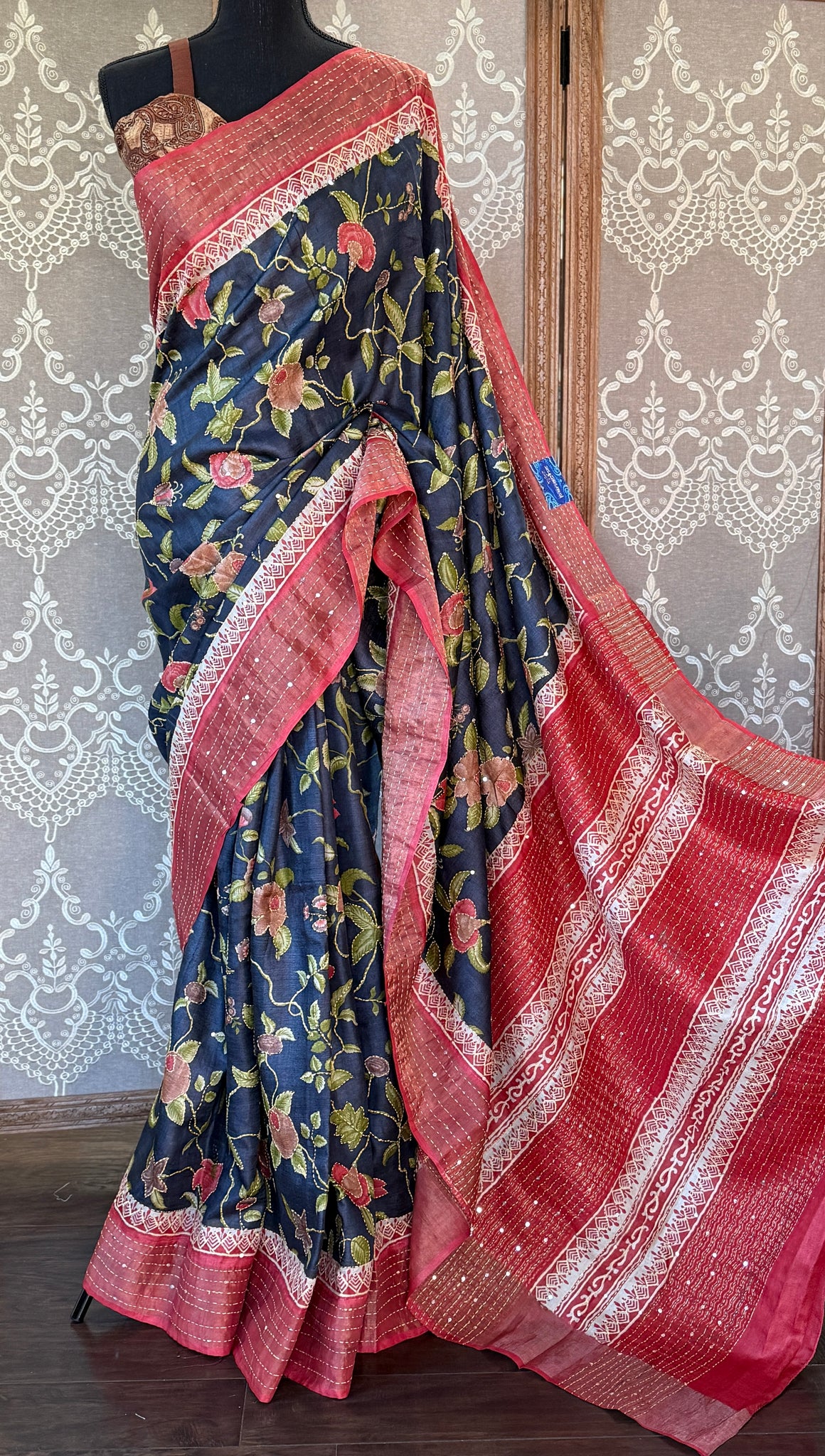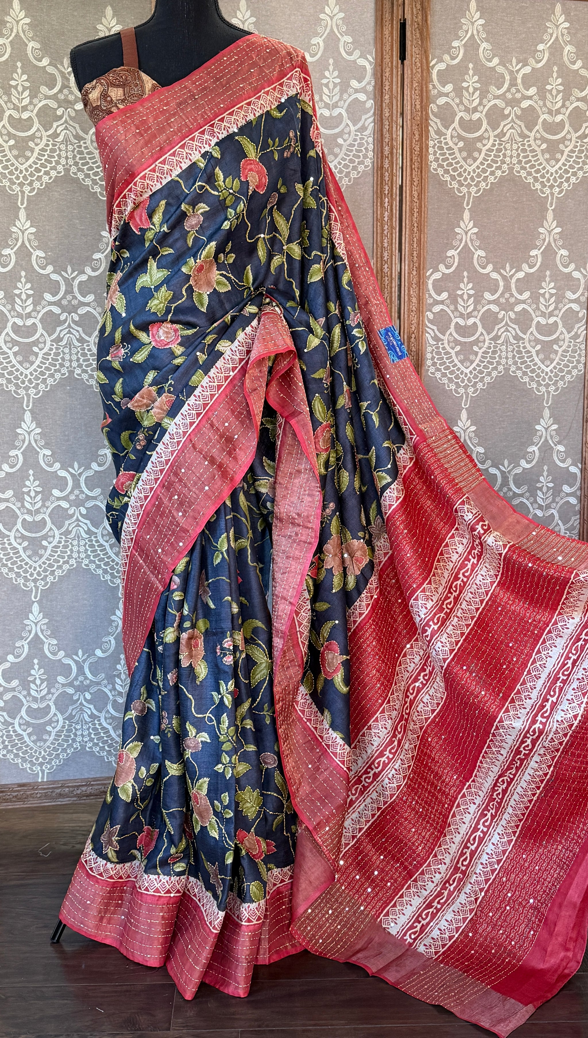 Saree Type: Block Printed Tussar Silk Sujani Kantha