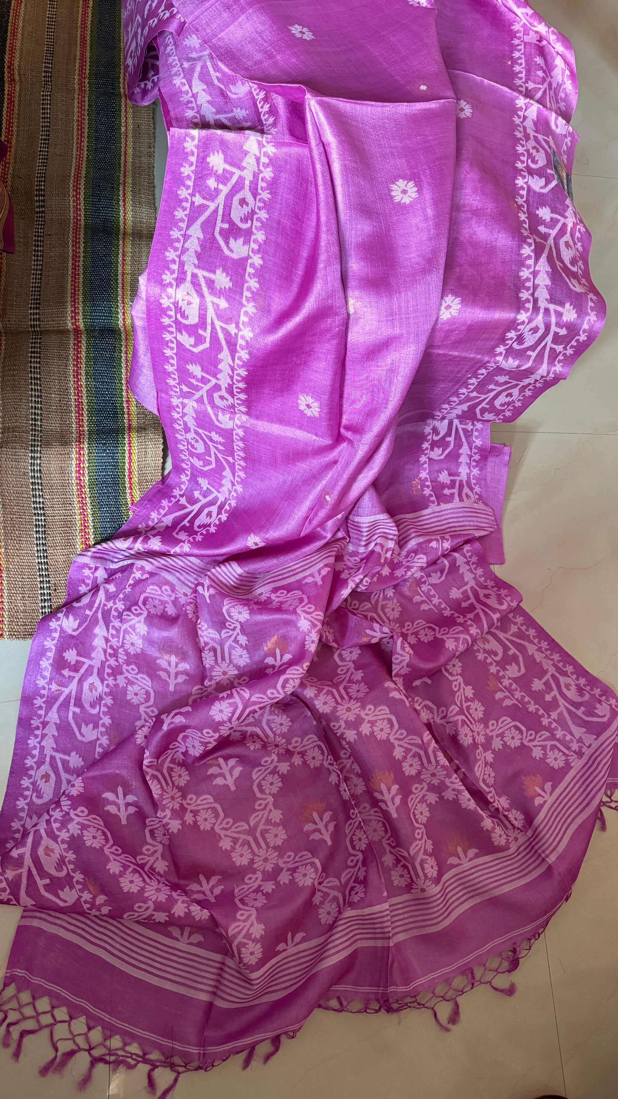 Design : Pure soft tussar silk body with resham, Zari and Jamdaani weave along borders and palla.