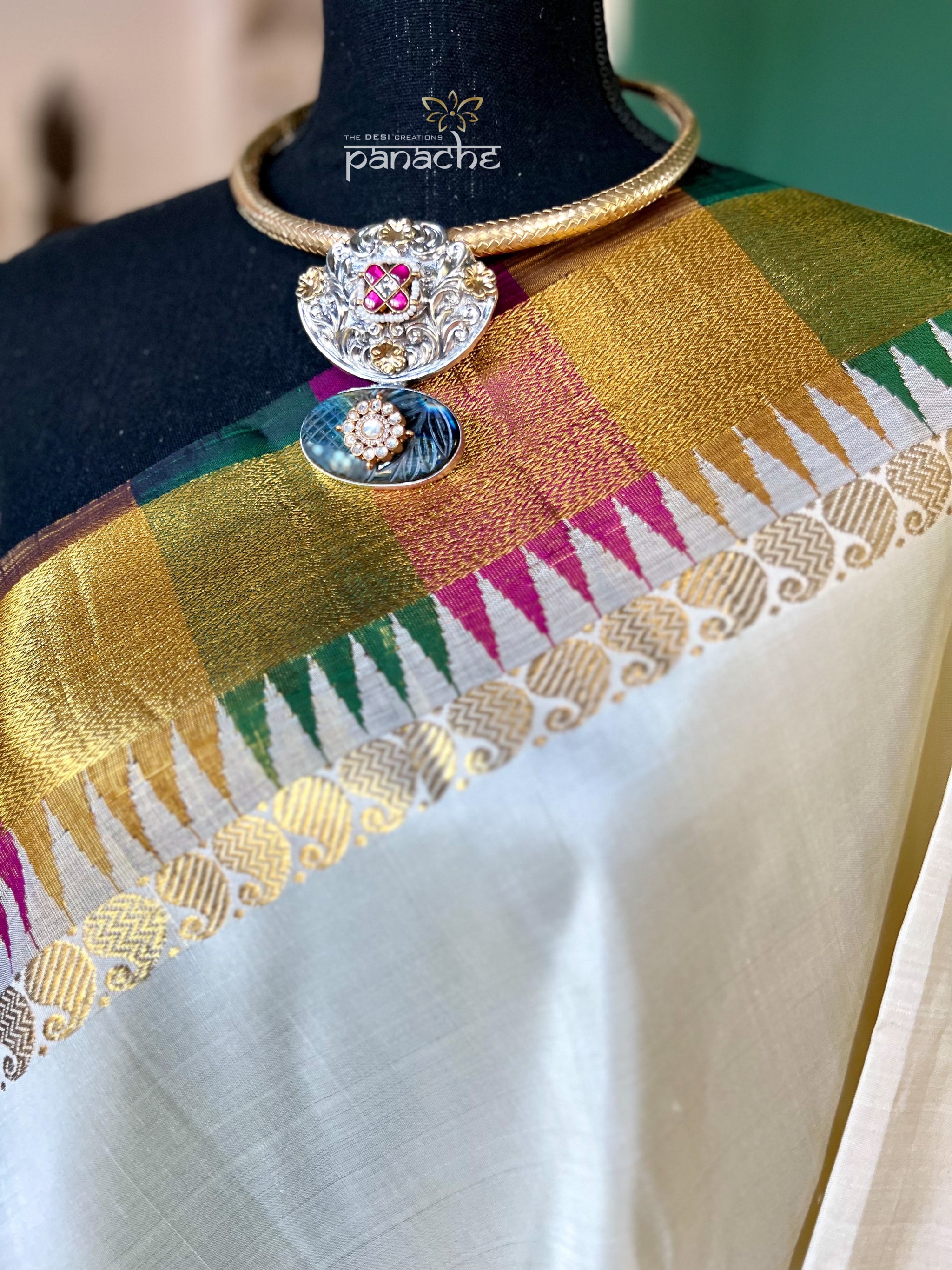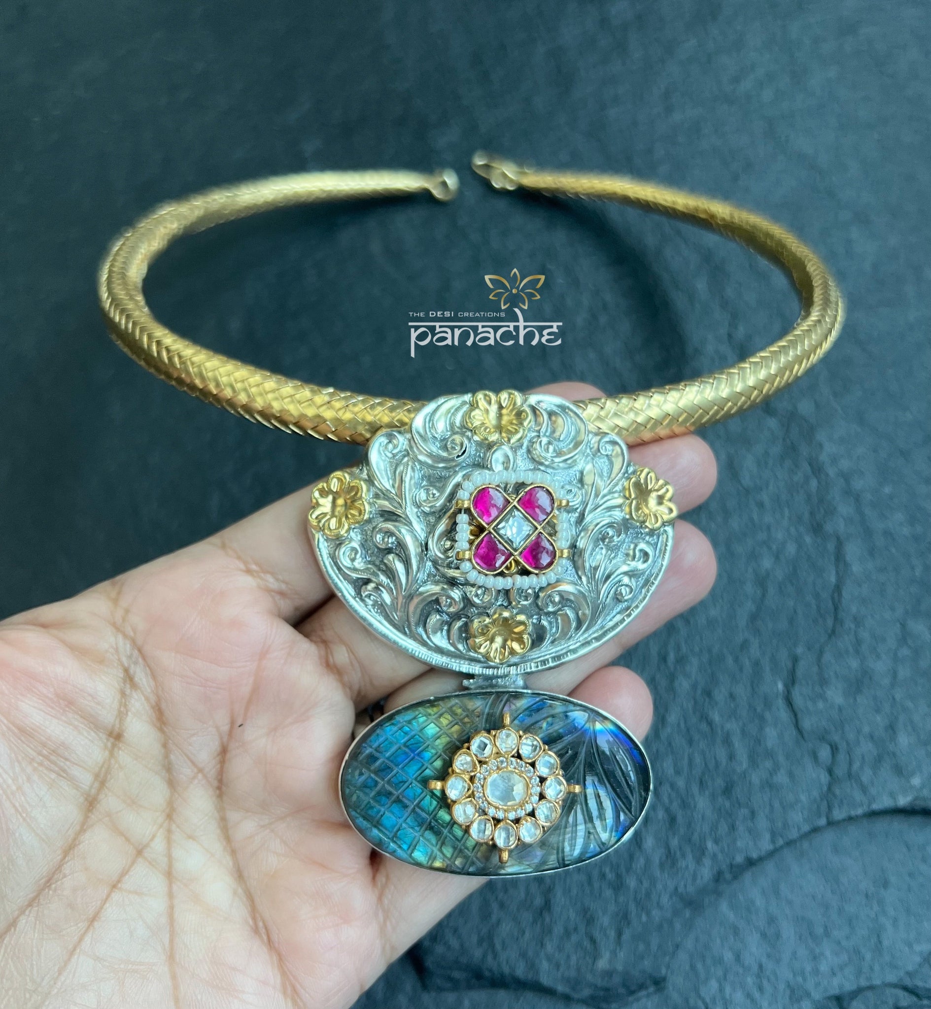 Design: Hand-beaten Silver hasli with natural stone crafted pendent. It’s detachable, Hasli can be worn separately. Pendent can be worn separately too.