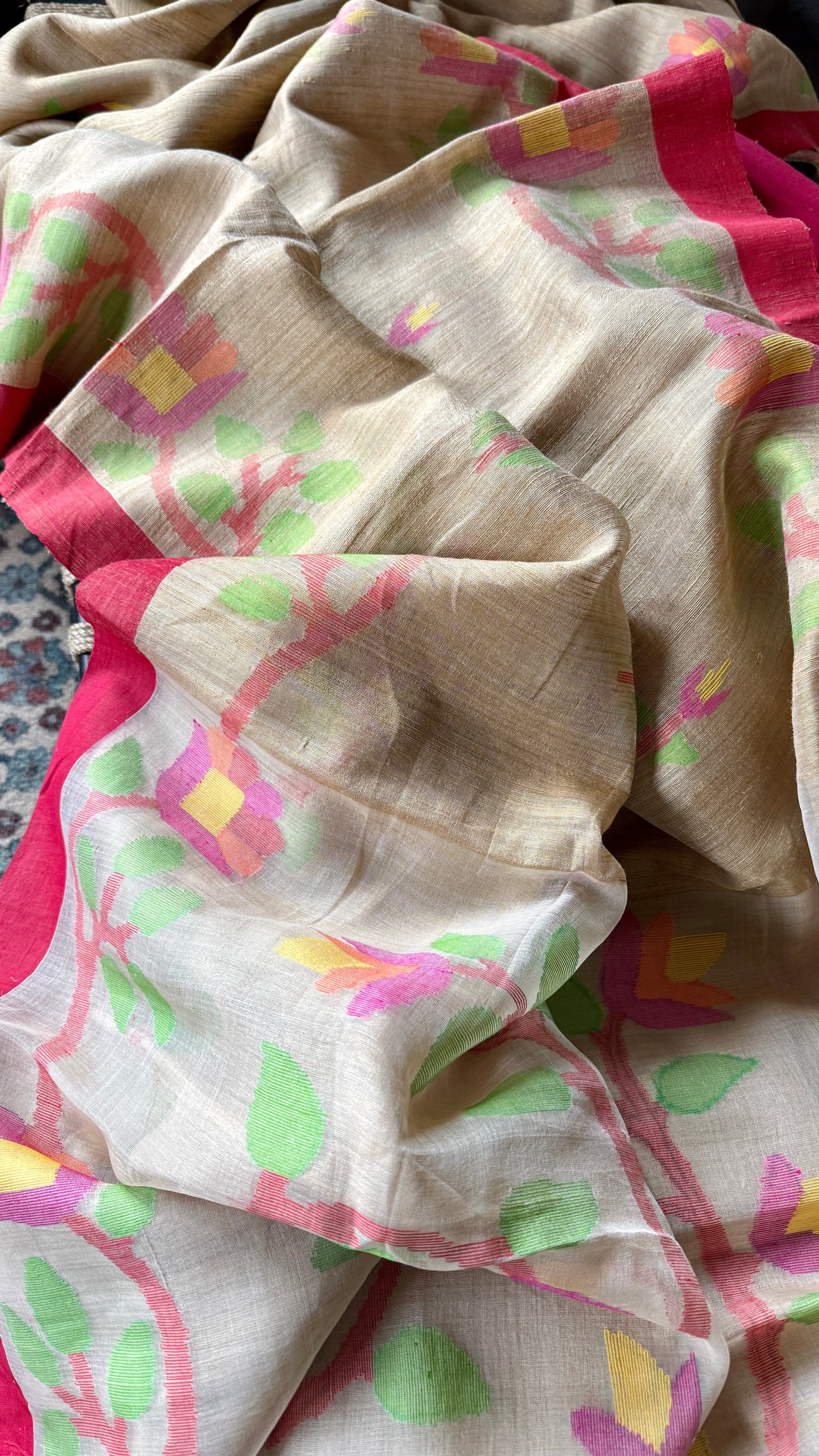Design : Pure soft Khadi Matka silk tan beige or Tussar color body with multi color resham Jamdaani weave on border and muslin palla.