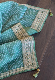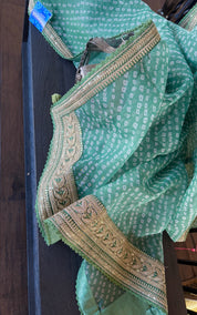 Design : Body is sage green with Bandhej print. Golden Zari Gota Patti on border.