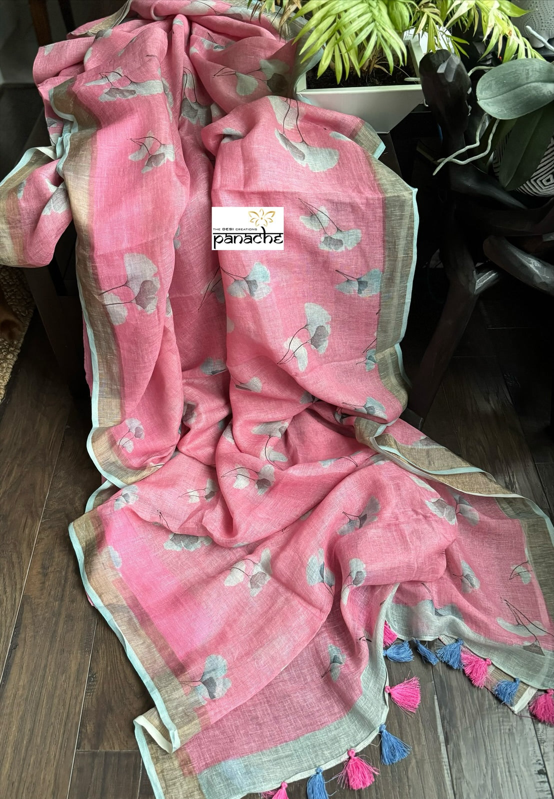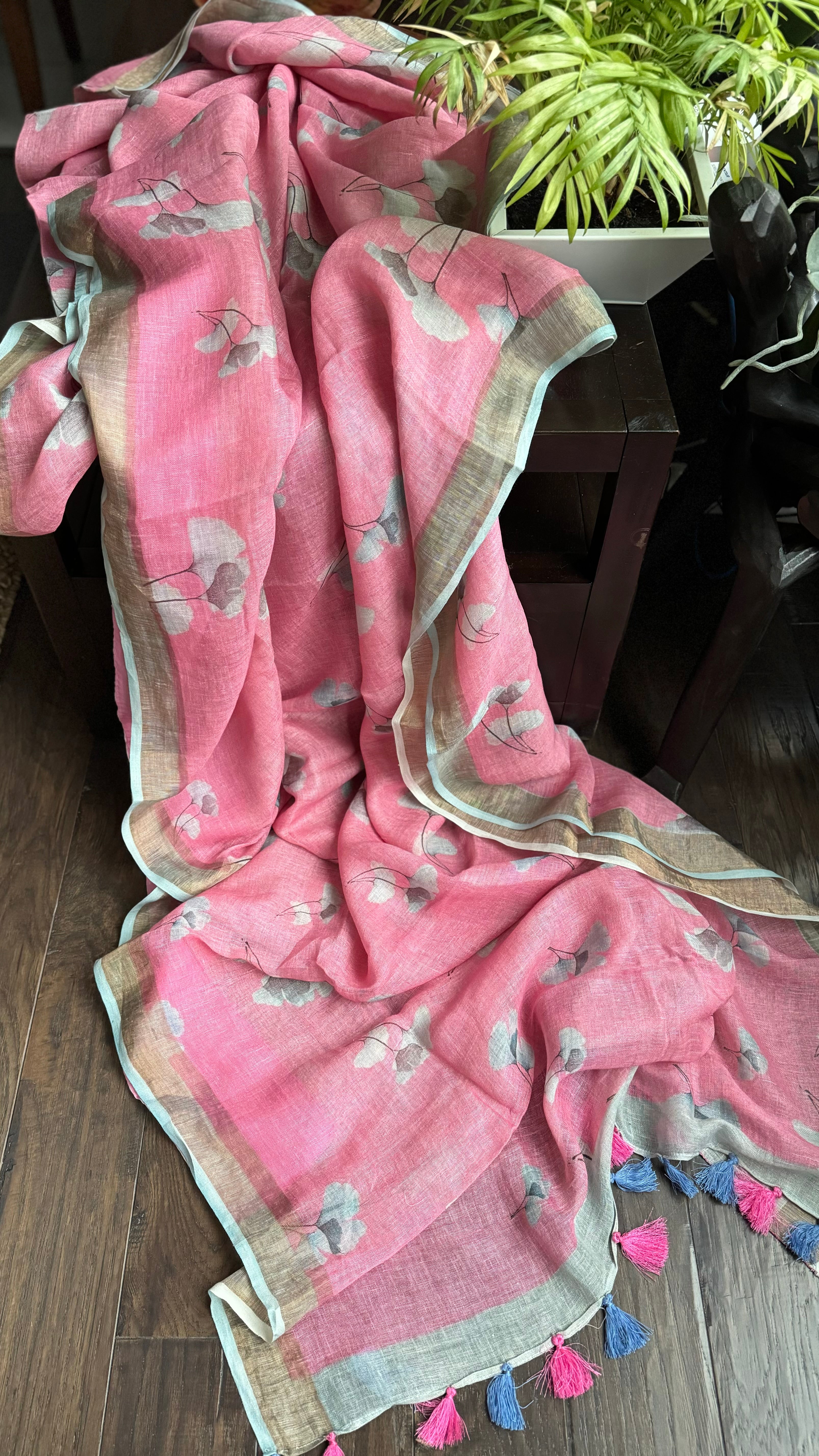 Design : Pink body with multi color floral Print on body, gold Zari border