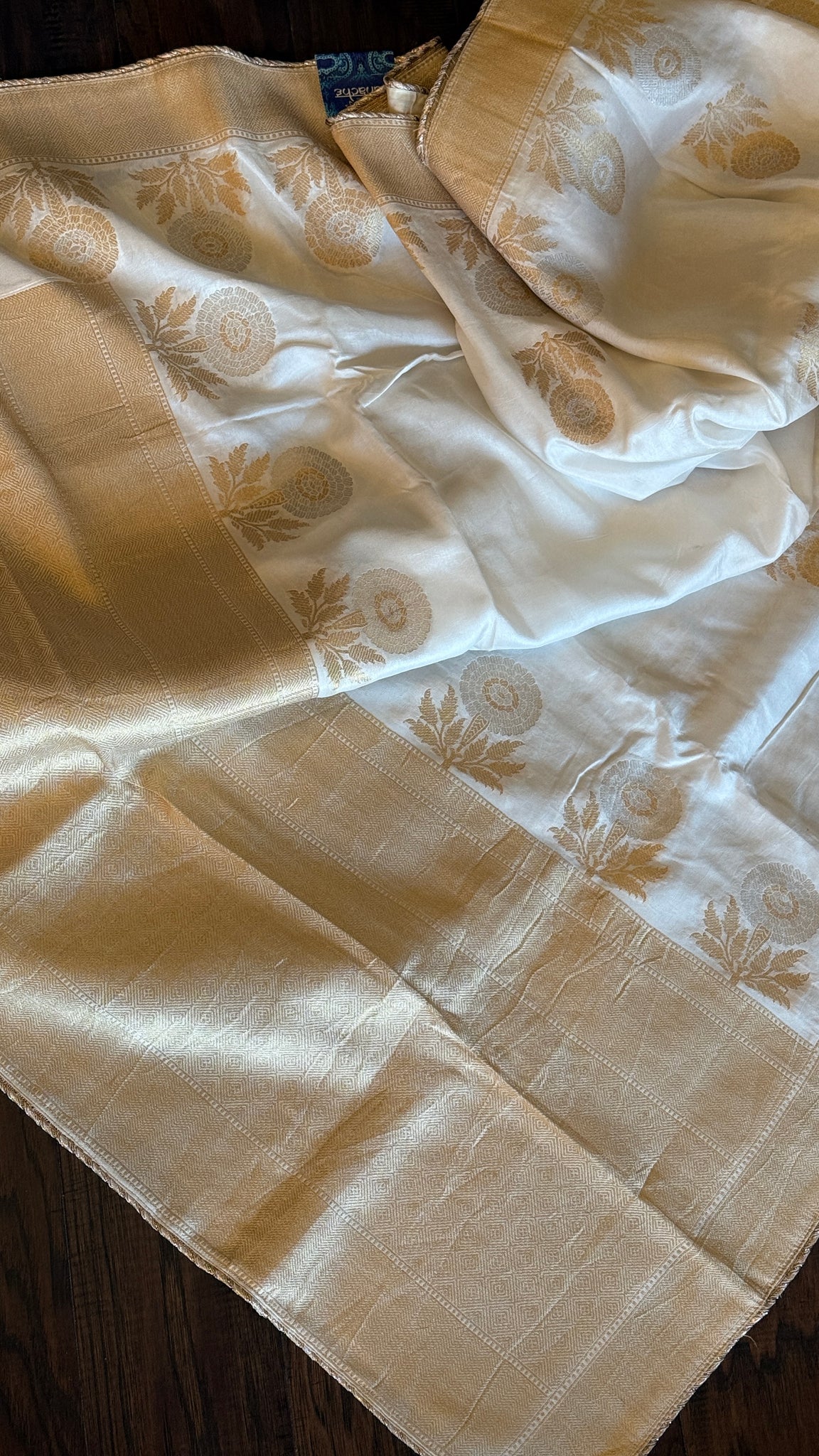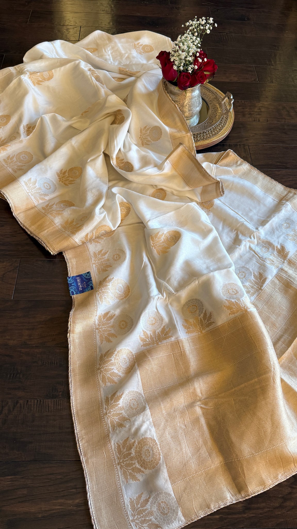 Description: Golden and Silver zari benaras woven motif allover body. Zari woven borders and palla with Gotapatti.