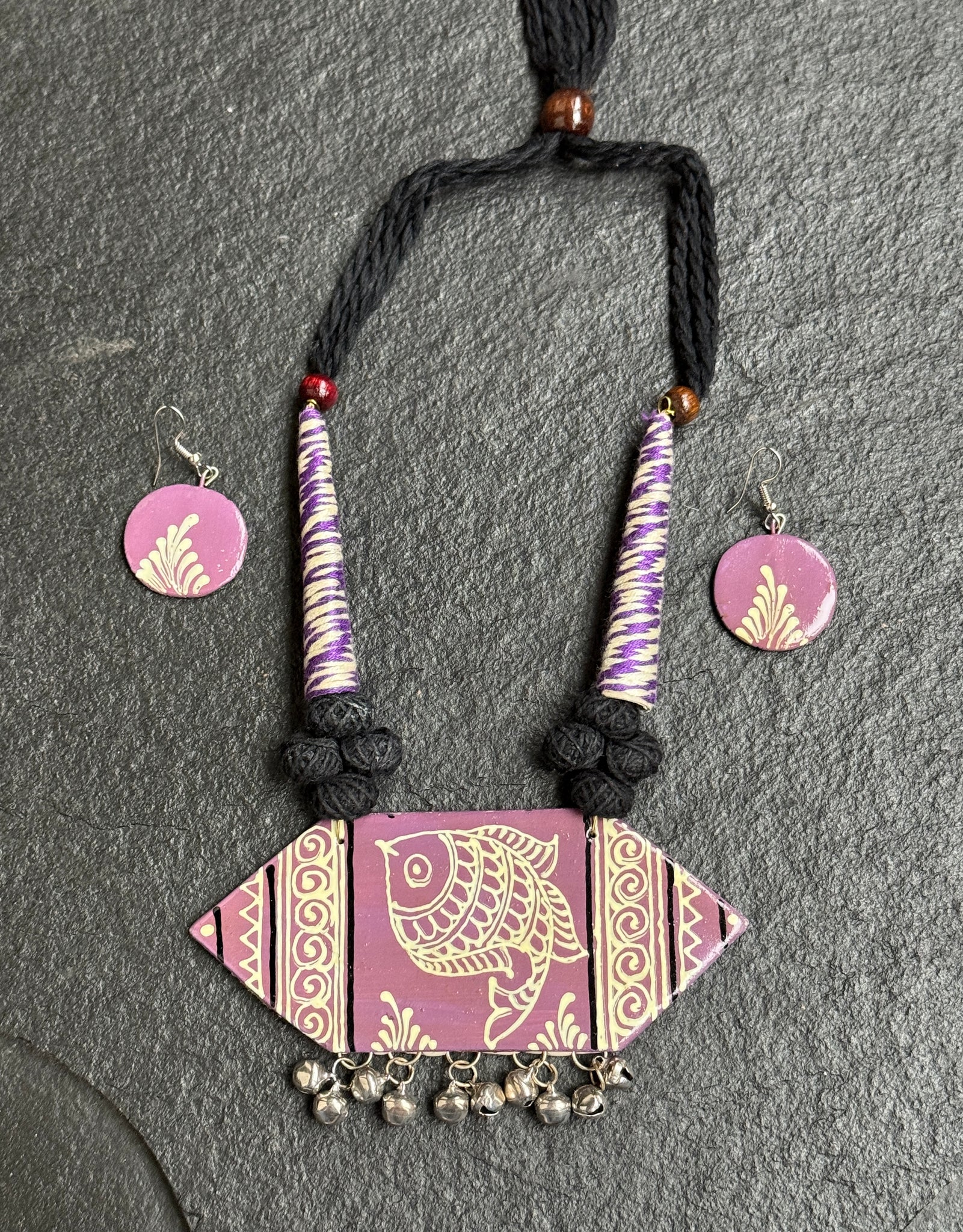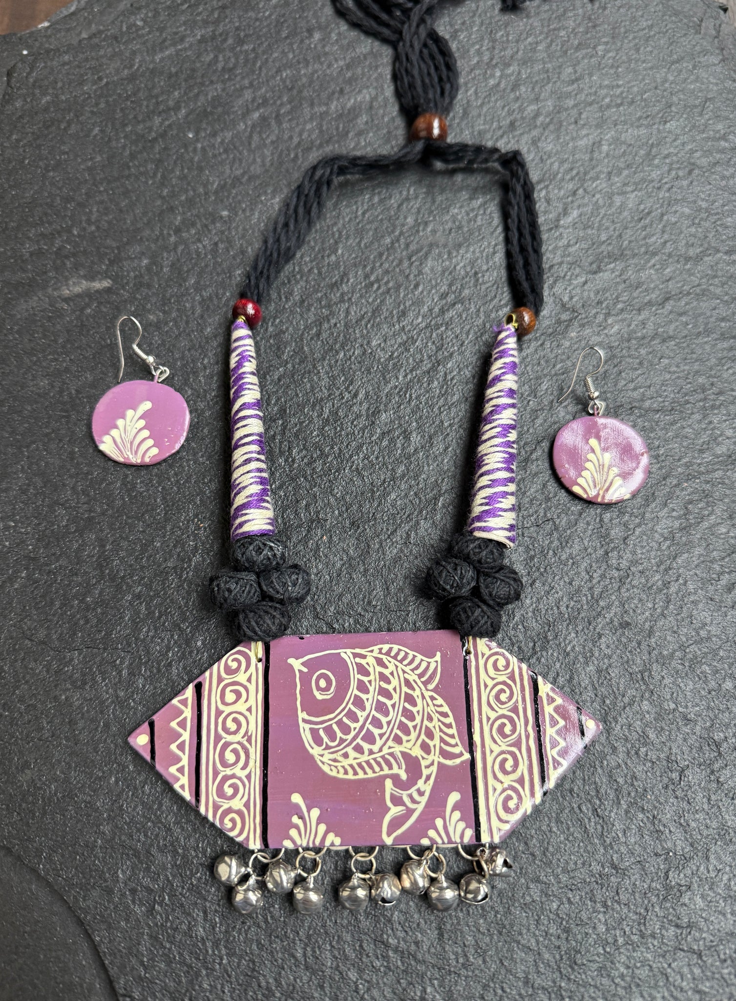 Description - Jewelry set - Black/mauve, madhubani hand painted