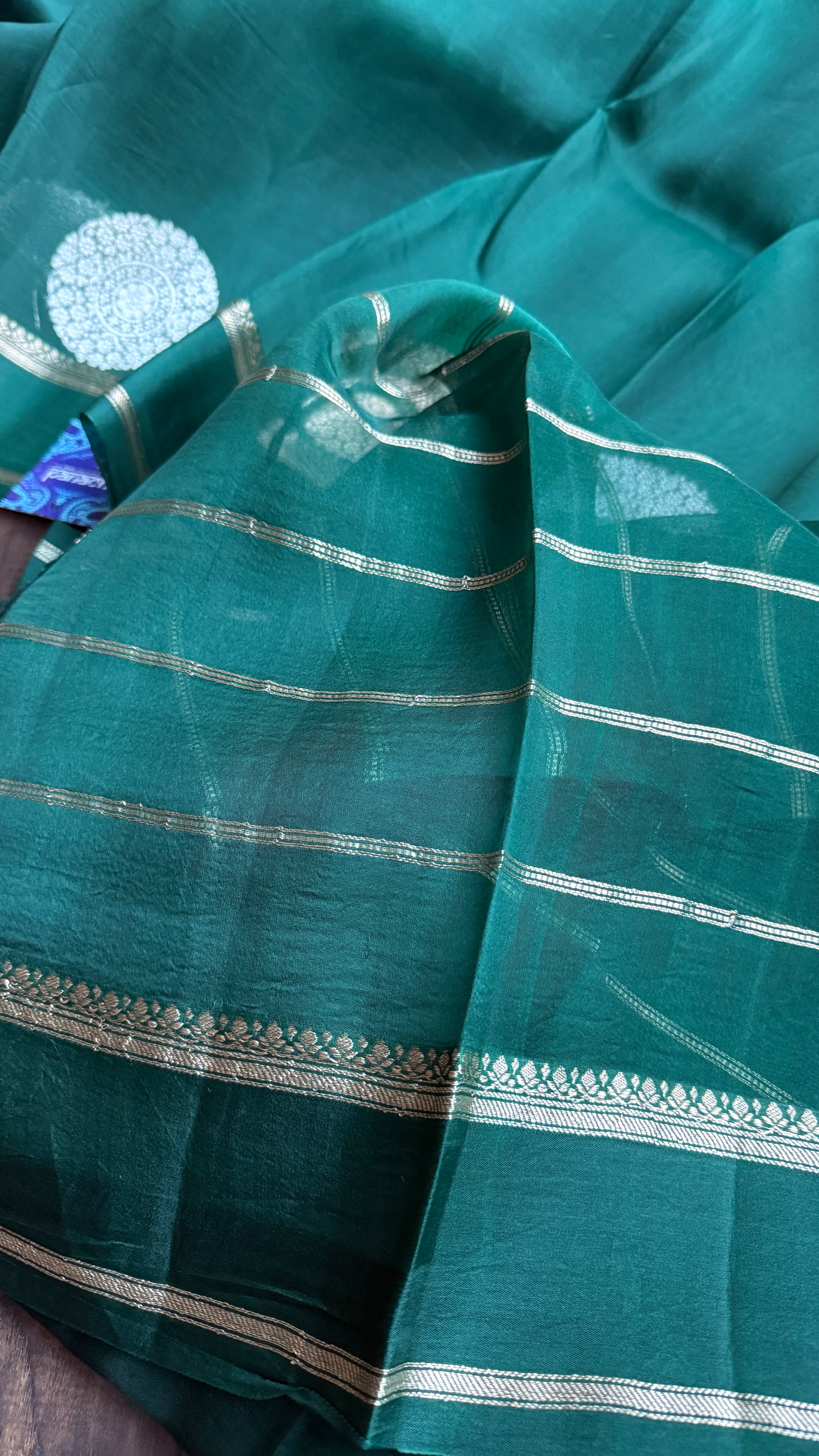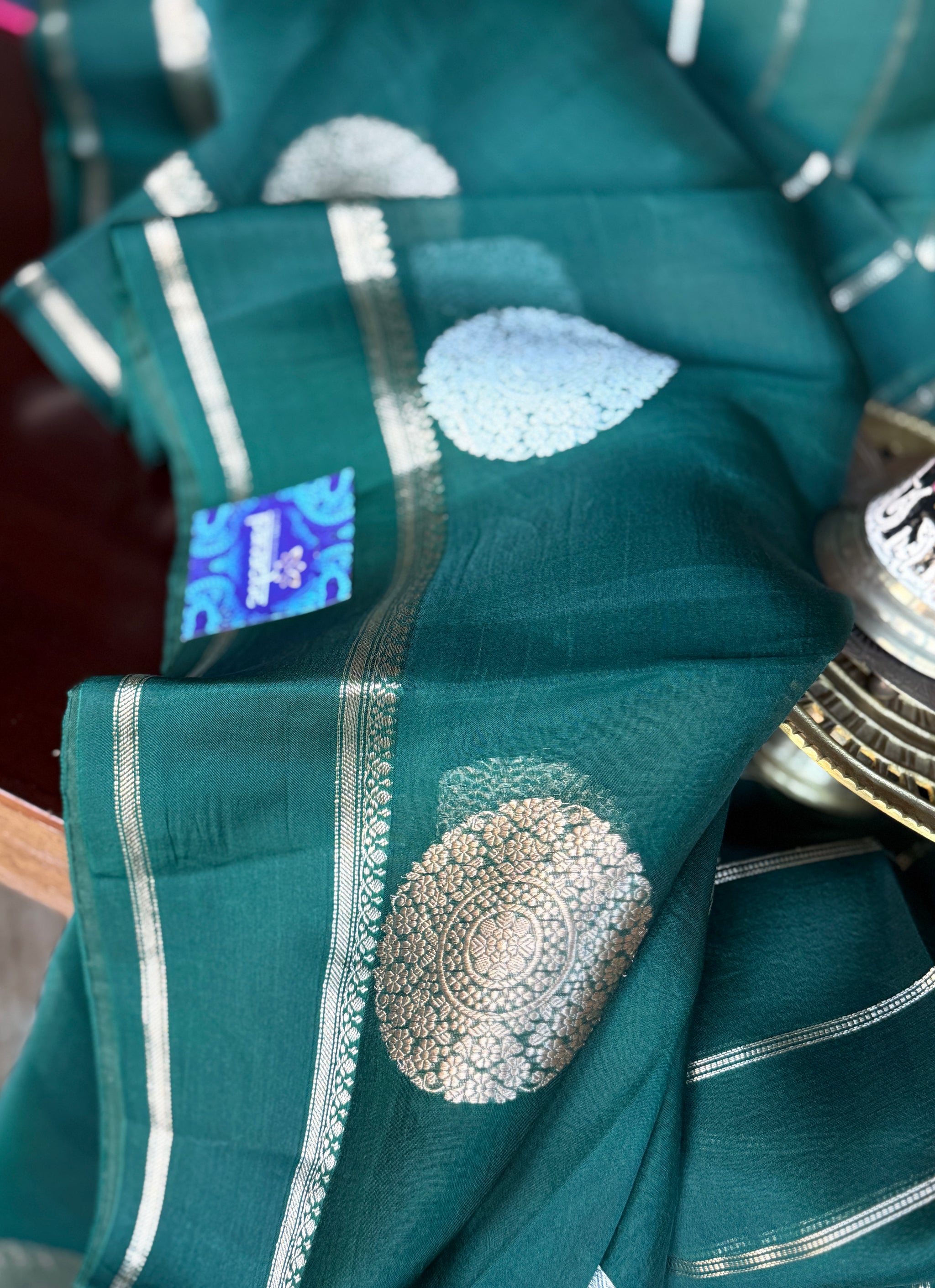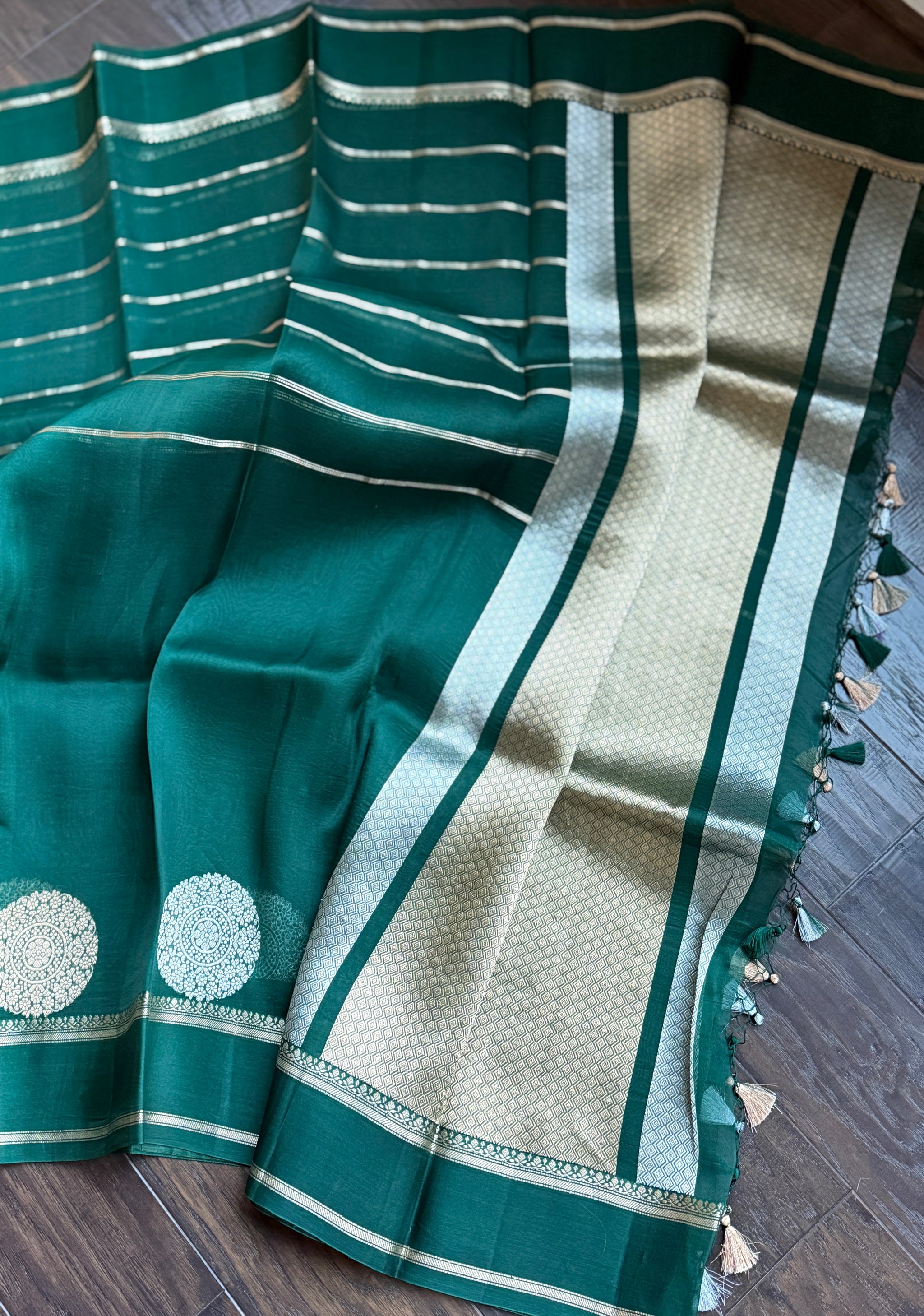 Description: Antique Zari woven Khadua motifs. Zari woven palla.